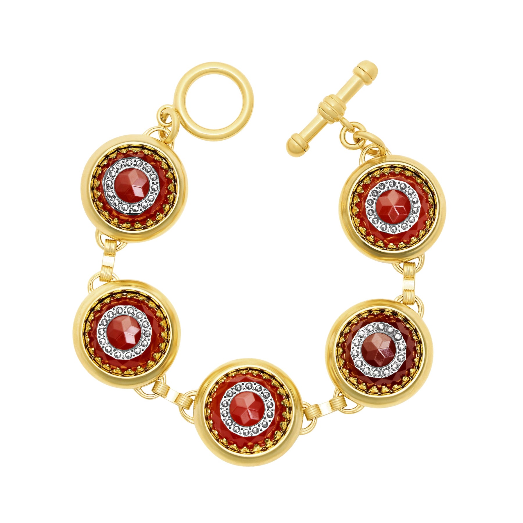 - Carnelian glass cabochon with raised silver spoke design set in 24k antique gold plated brass settings