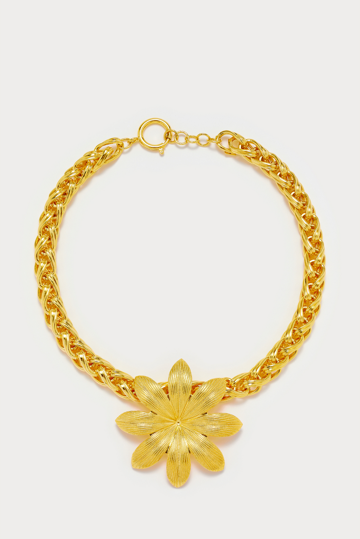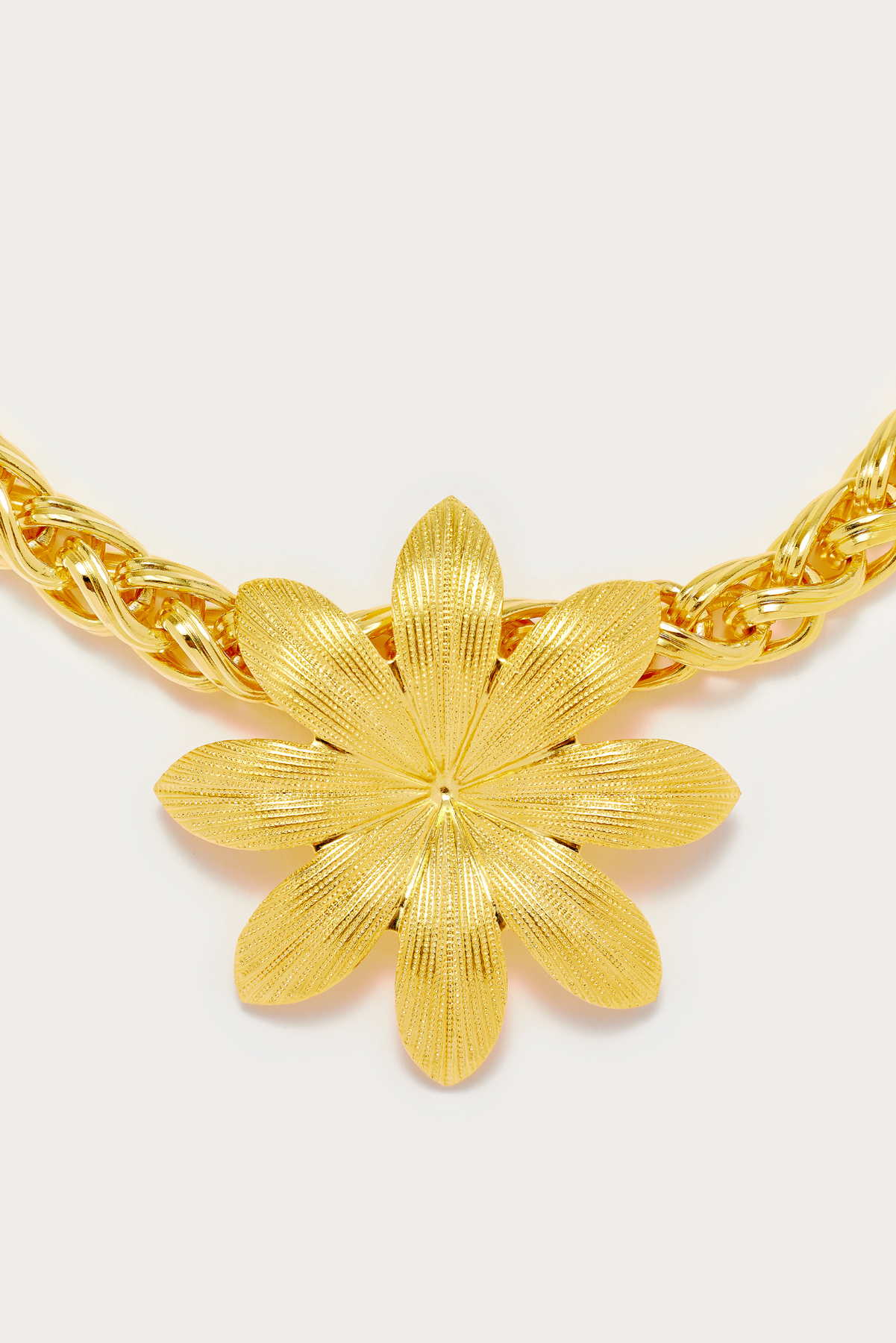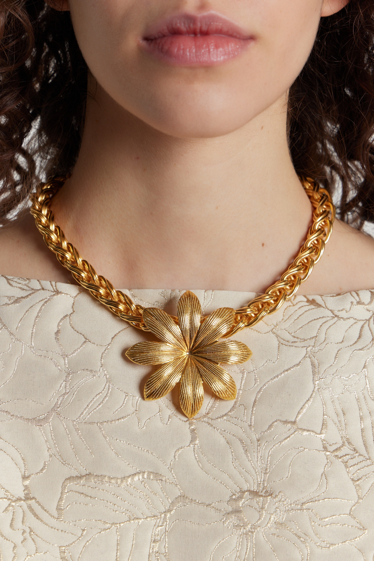 Add a touch of whimsy to your outfit with the Elizabeth Chain Lilium Gold necklace. This 100% golden plated brass necklace features a delicate Lilium flower, crafted in Paris. Perfect for any occasion, let this unique piece be the statement of your style.
