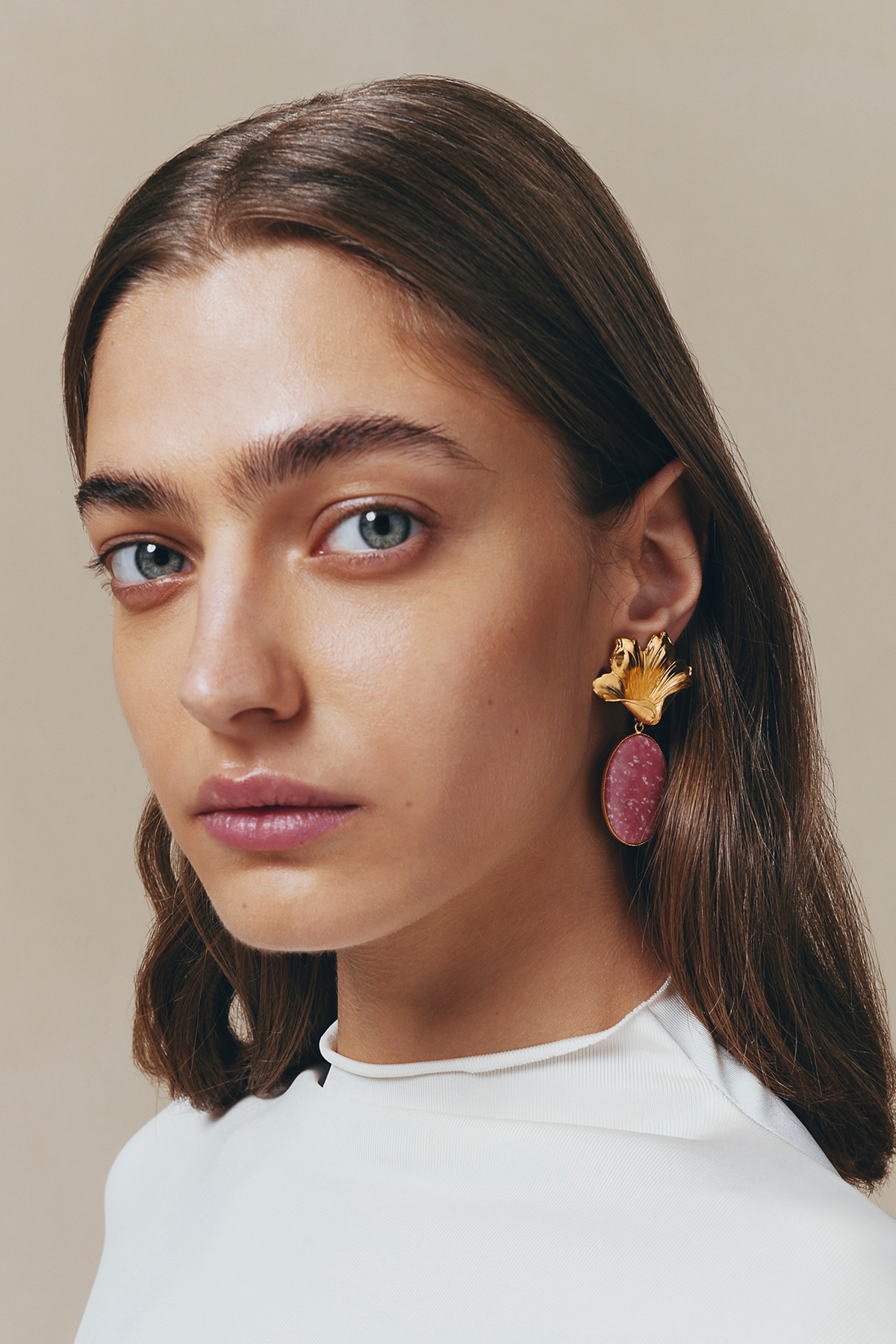 Handcrafted in our Parisian Atelier, the Sonia Petunia Oval Pink blends delicate floral shapes with semi-precious stones, playfully intertwining geometric lines in an asymmetrical design for a modern yet timeless look.