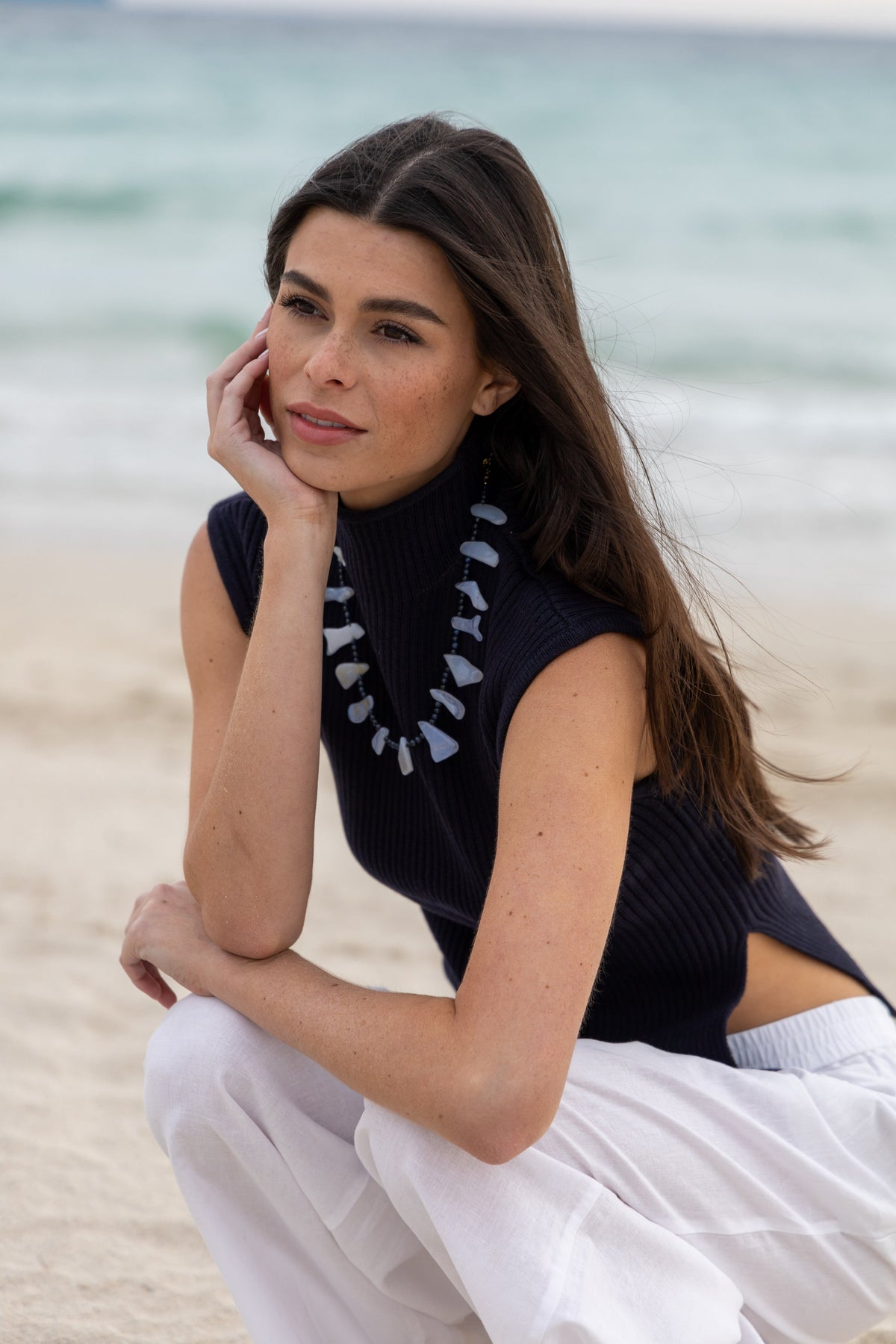 Embark on a journey to sun-kissed shores with the Maggie Necklace, handcrafted with dumortierite and vibrant blue chalcedony stones. Its vivid hues capture the enchanting beauty of the tropics, making it a striking celebration of paradise.