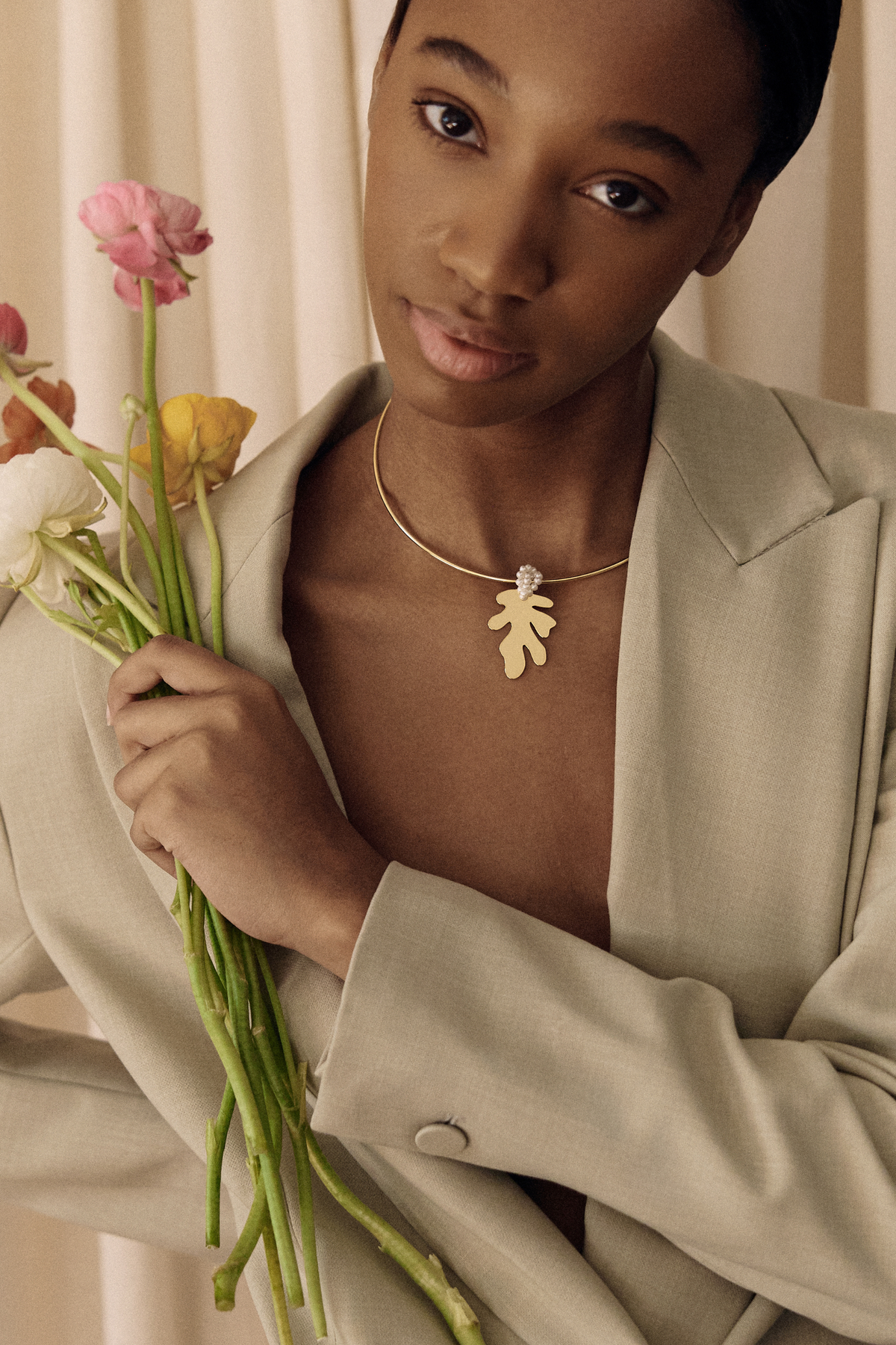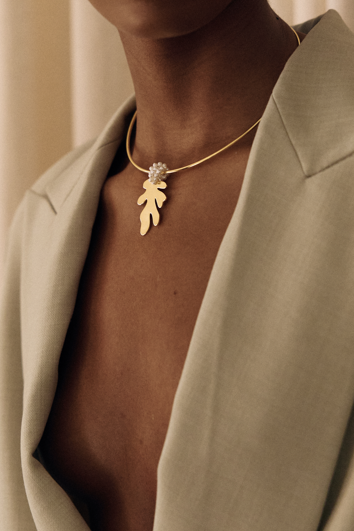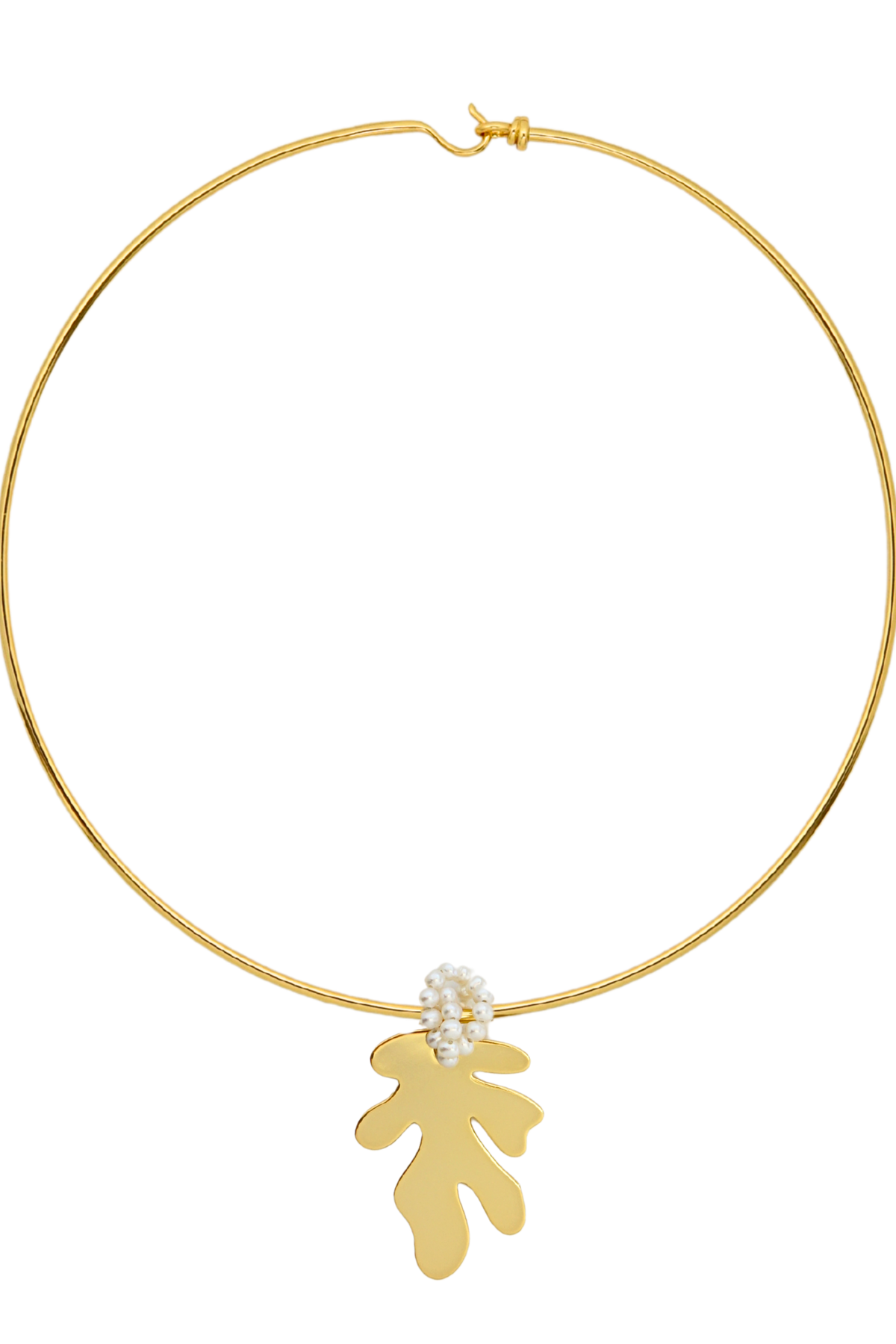 Materials: High-polished leaf charms, hand strung with rice freshwater pearls, on a 130mm inner diameter wire collar made of brass with heavy 18K gold-plating and e-coating to ensure long lasting plating and resist tarnish.
