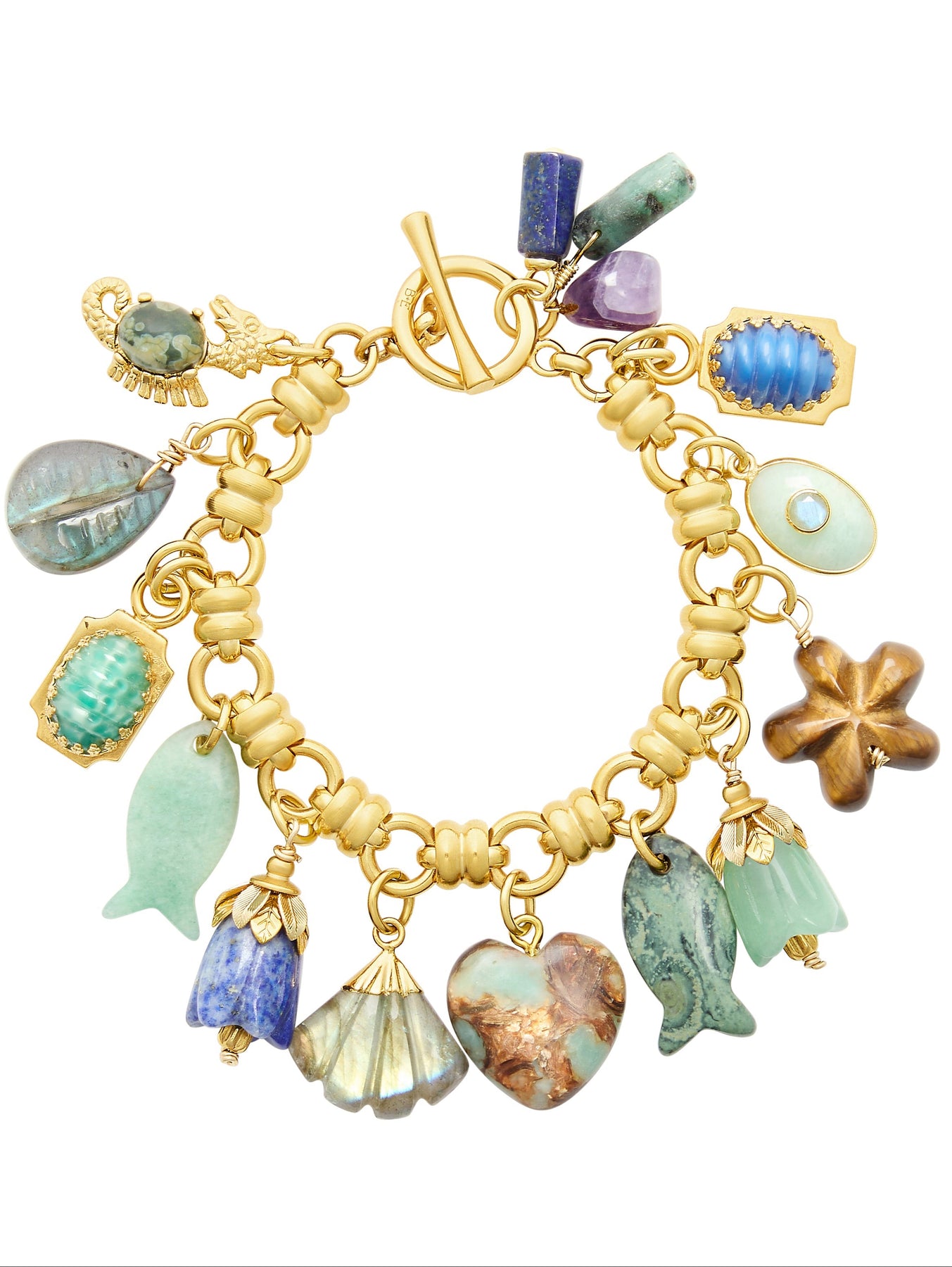 • A 24k antique gold plated chunky round link chain with an assortment of semi-precious and 24k gold plated charms.