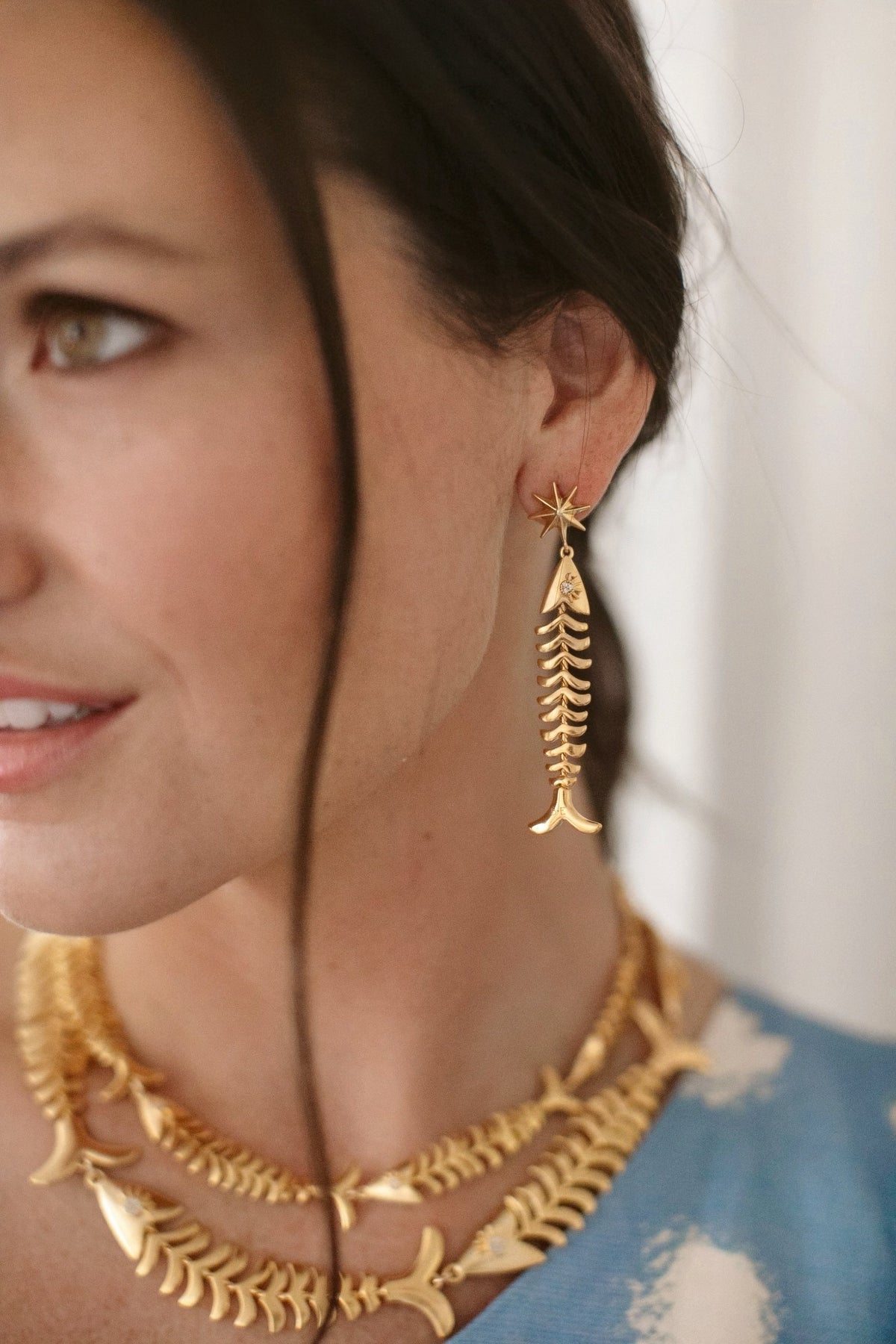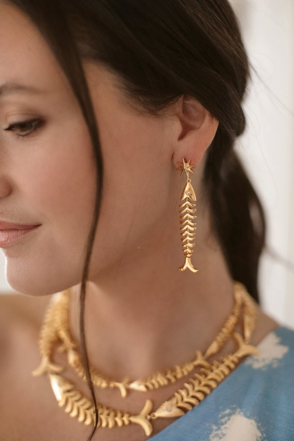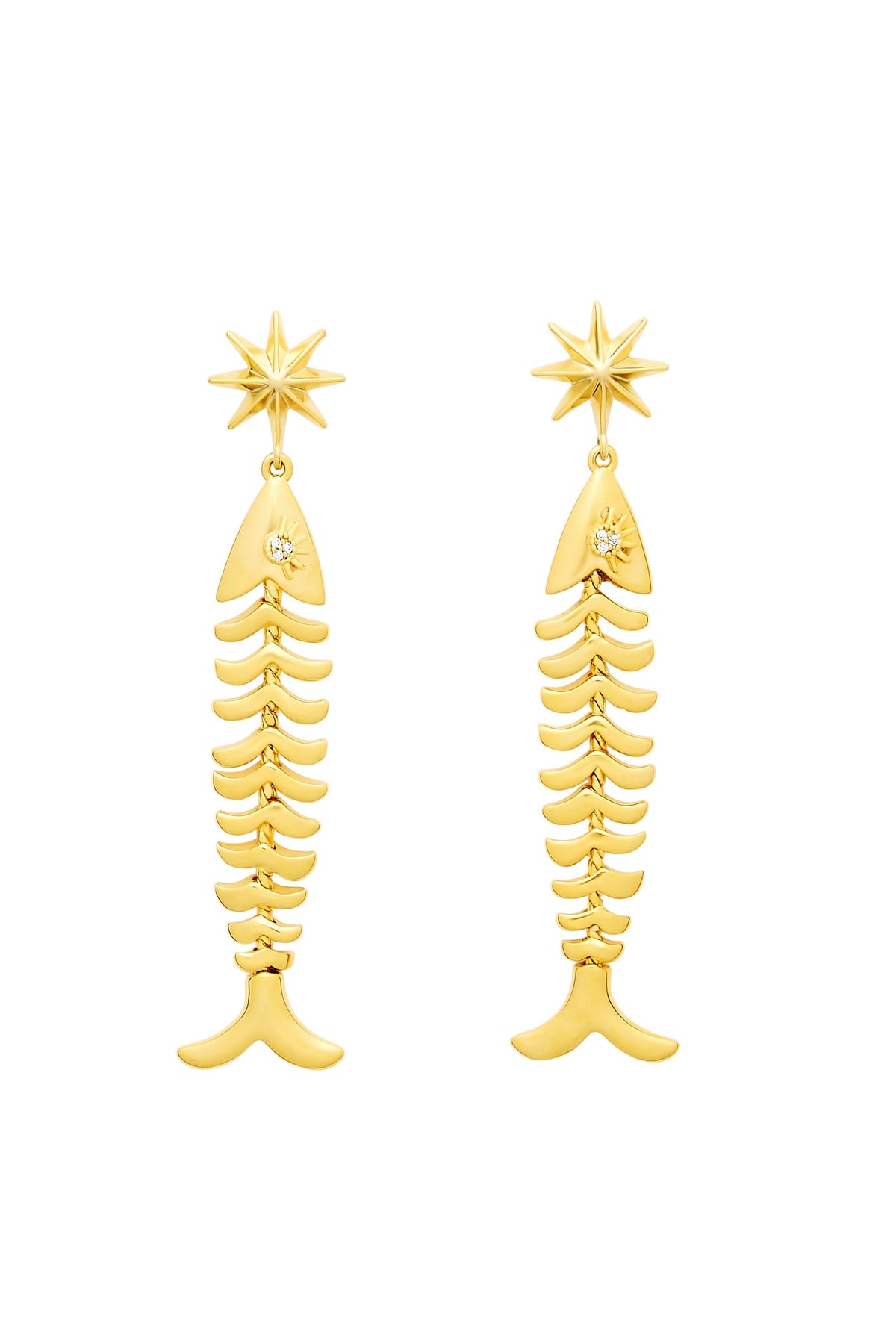- 24k antique gold plated articulated fish with crystal detailing hang from gold plated mariner's star toppers on stainless steel hypoallergenic posts
