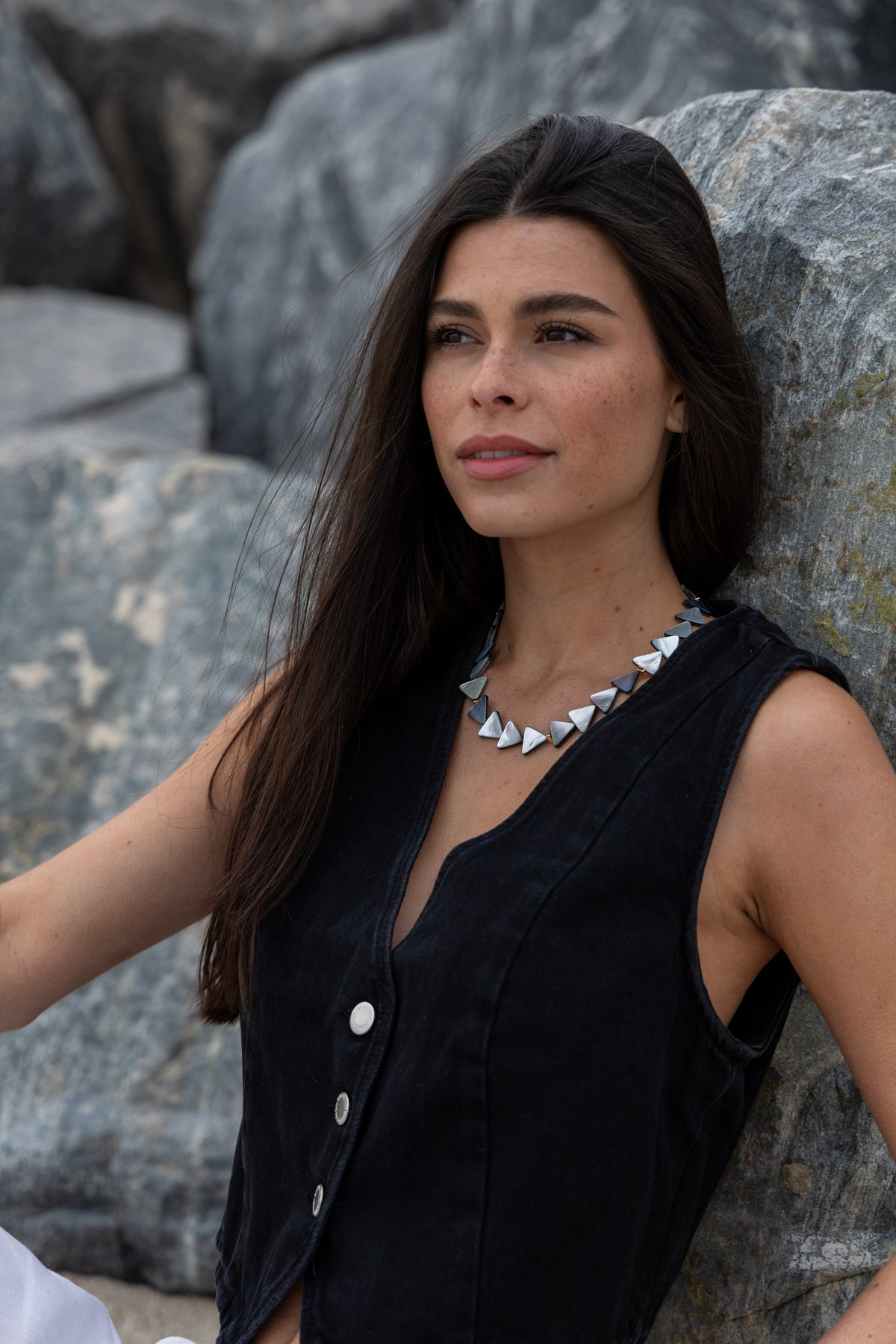 Meet the Romina Necklace—a stunning blend of nature's elegance and modern charm. Triangle-shaped black lip shells add a geometric allure, creating a sleek design perfect for both casual outings and special occasions.