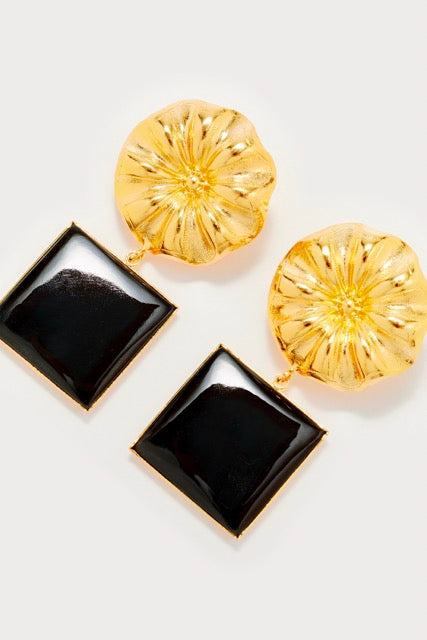 The Sonia Daisy Square M Black Tu Earrings are a staple piece in any wardrobe! These piercing earrings are made of gold plated brass and a contrasting black stone, guaranteed to elevate any outfit.
