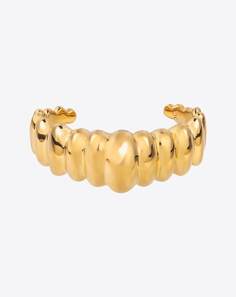 Get ready to make a statement with our Tufted Cuff - made from recycled brass and dipped in 14k gold for a touch of luxury! The oversized design features our signature tufted pattern, with a scooped out center to reduce the weight. It's the perfect mix of style and sustainability.