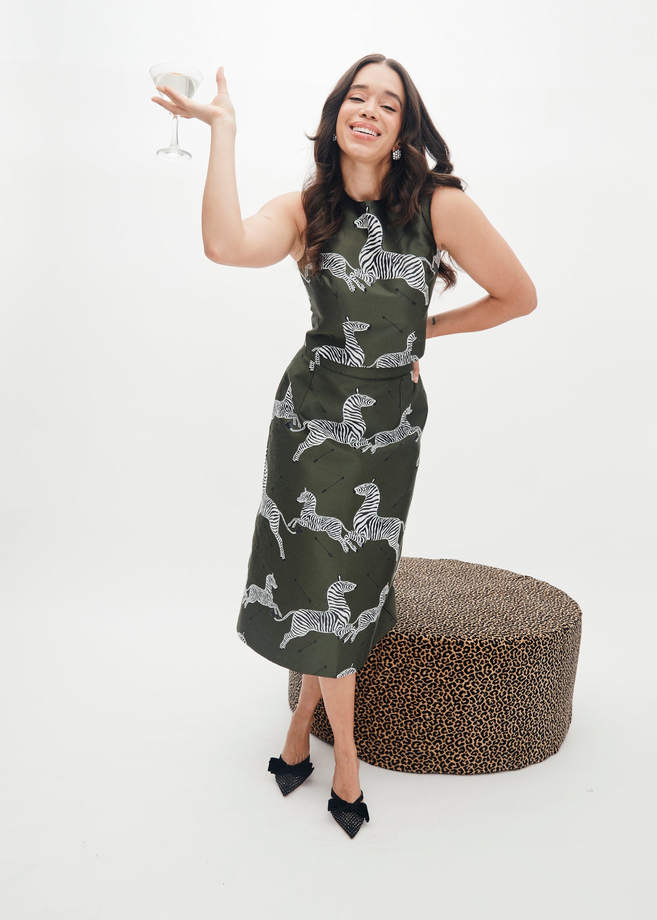 The Ali Top is a refined little shell with big impact. Cut in the exclusive MAE x Scalamandré Olive Zebra jacquard, she’s equal parts bold and elegant—perfect for pairing with the matching Hallie Skirt as a modern cocktail set, or dressed down with denim for a more playful take.