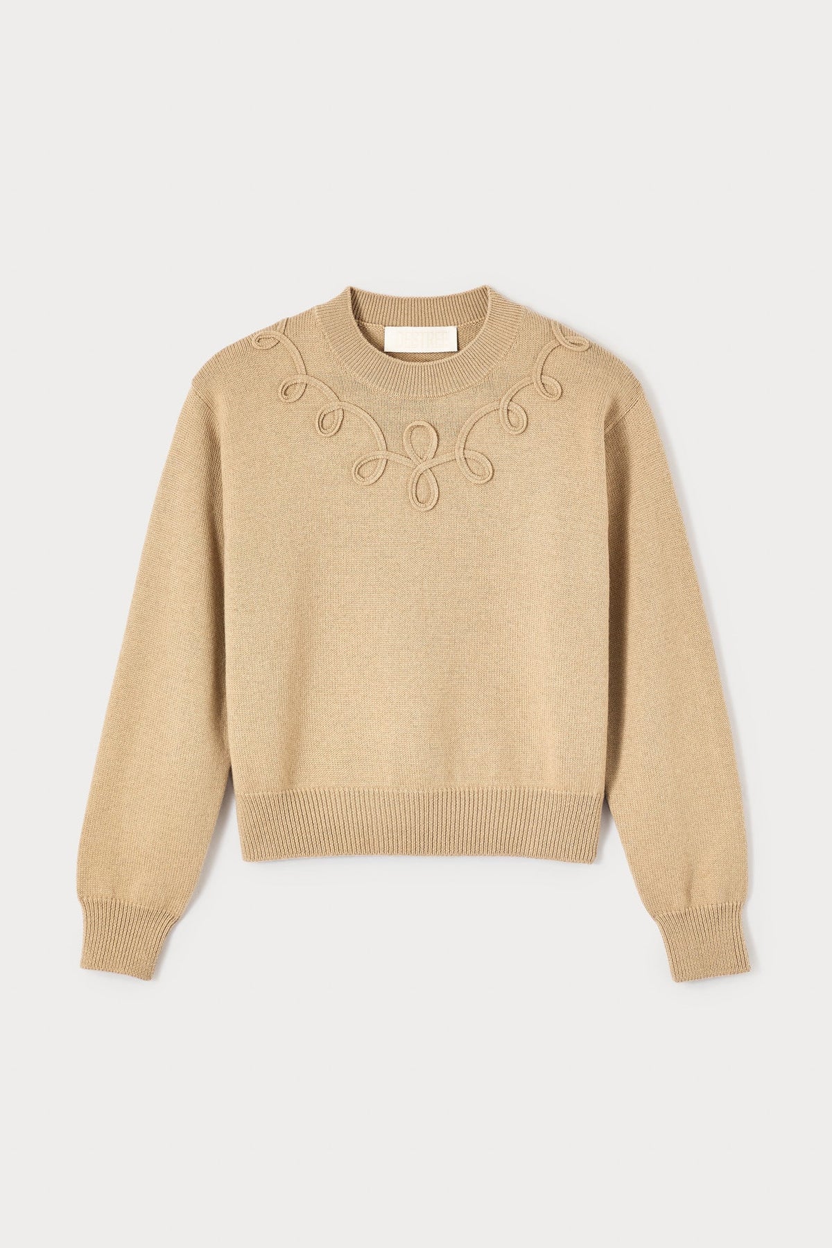 A refined camel sweater crafted from pure merino wool, featuring delicate embroidered loop motifs along the neckline for a subtle decorative touch.