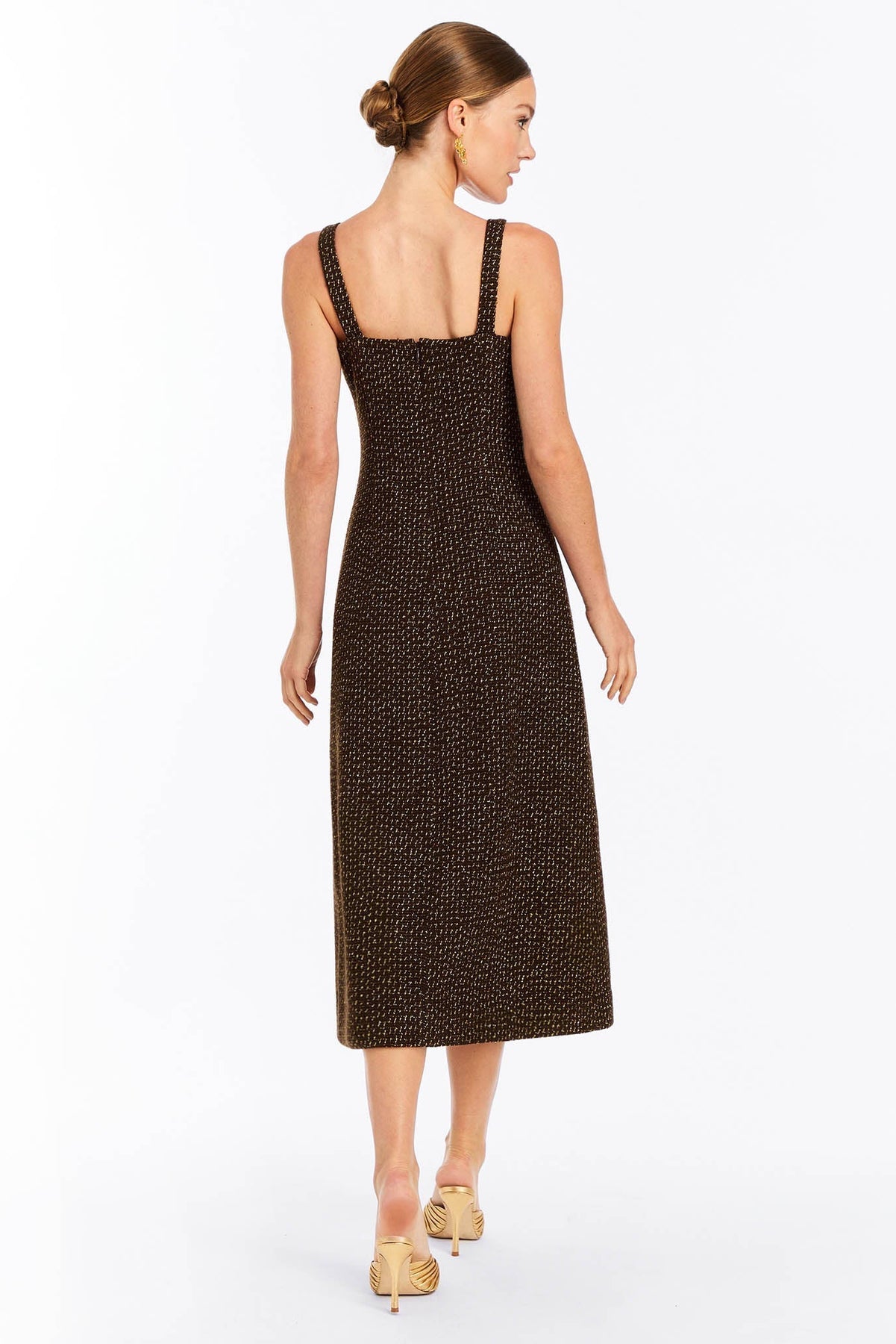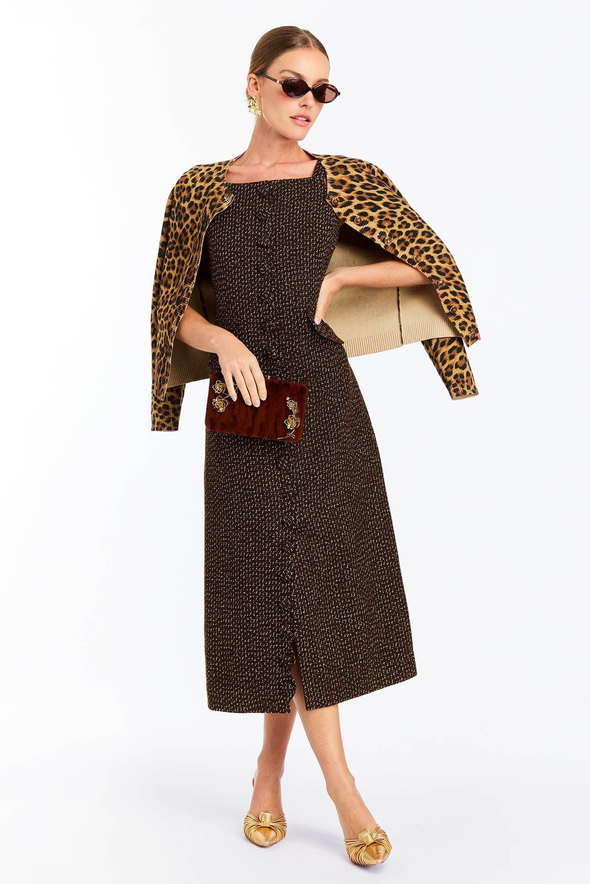 Sophisticated with a touch of vintage charm, the Espresso Midi Dress blends tailored structure with romantic detail. Featuring a fitted silhouette in our warm Chestnut Gold print, this midi stuns with scalloped trim, decorative buttons, and elegant fixed straps. Whether worn to an autumn event or styled under a coat for a city day out, it’s a versatile wardrobe hero for the season ahead.