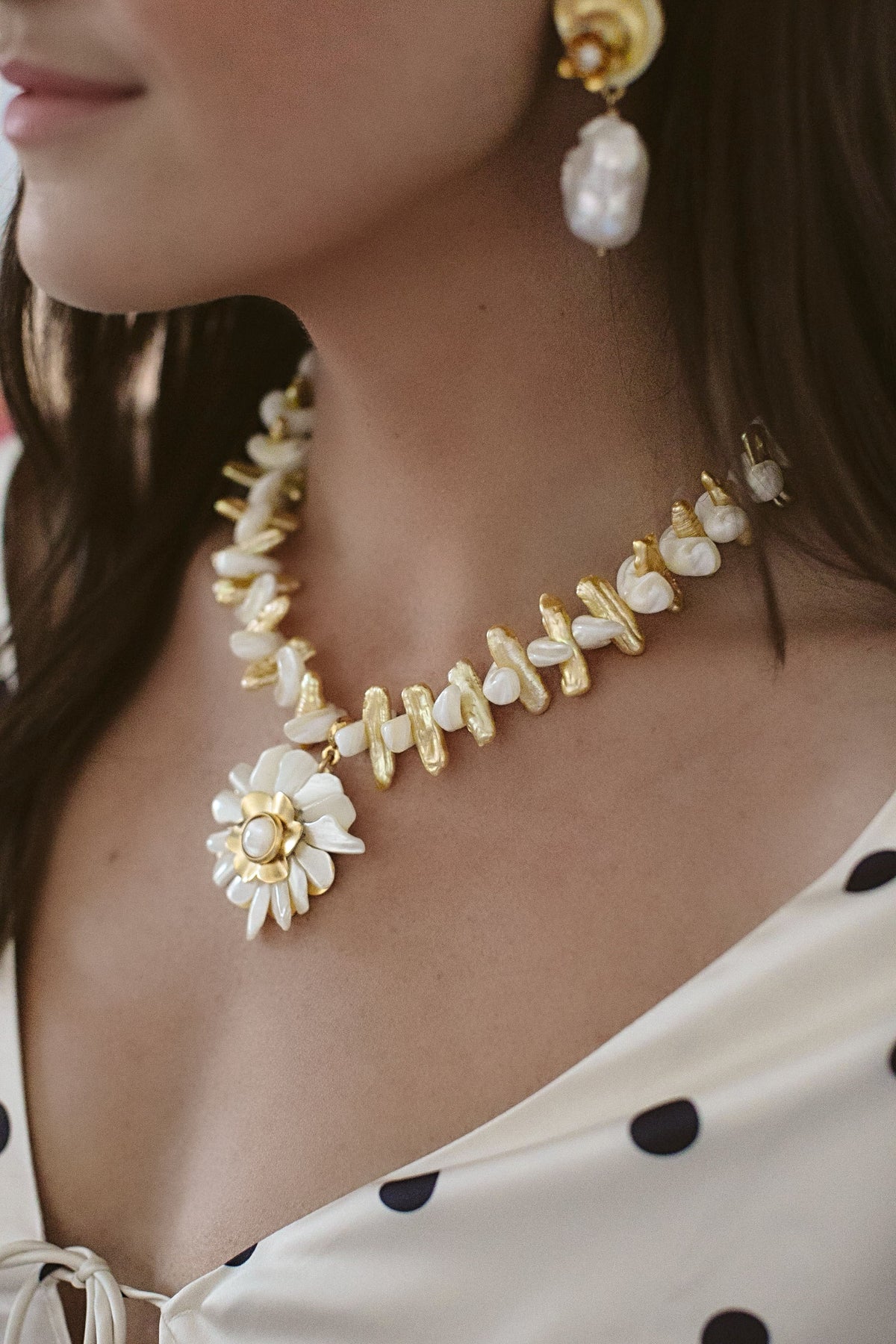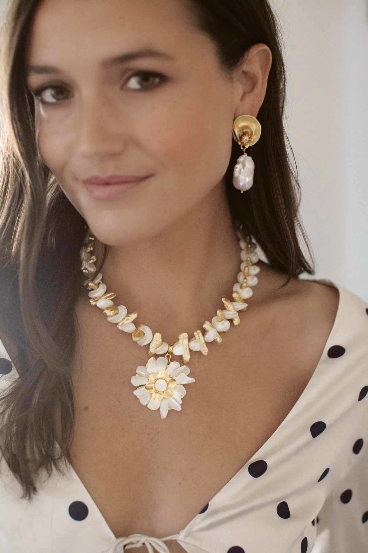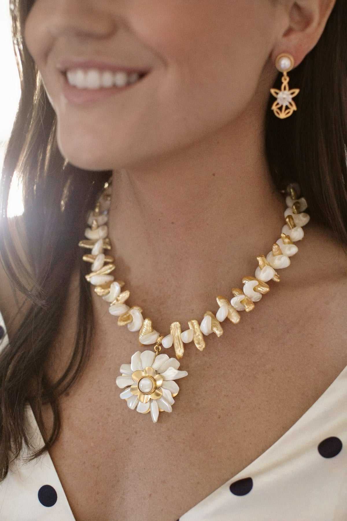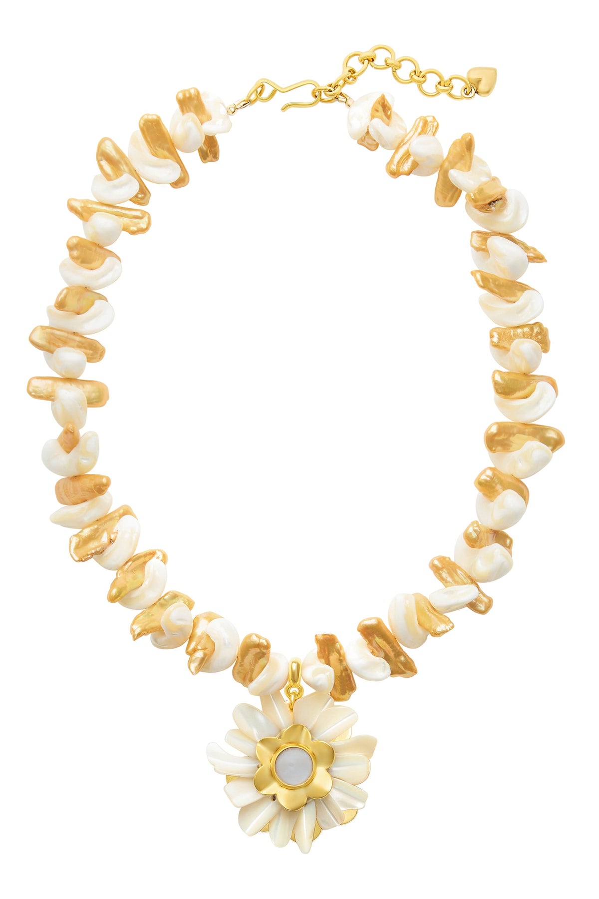 - A statement medallion made of 24k antique gold plated flowers and mother of pearl detailing hangs from a strand of MOP and freshwater pearls