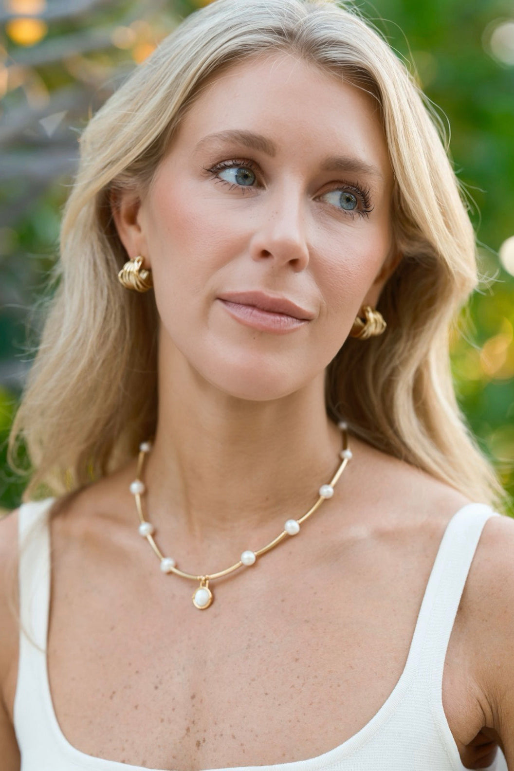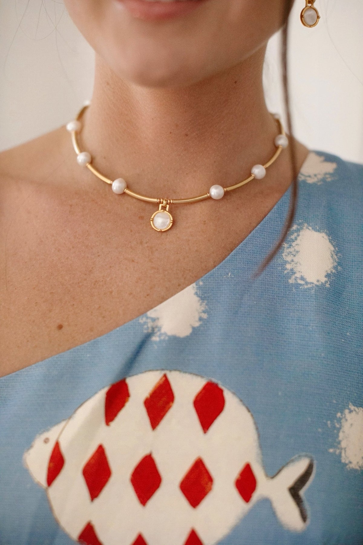 - A mother of pearl pendant hangs from a strand of freshwater pearls and 24k antique gold plated arched tubes