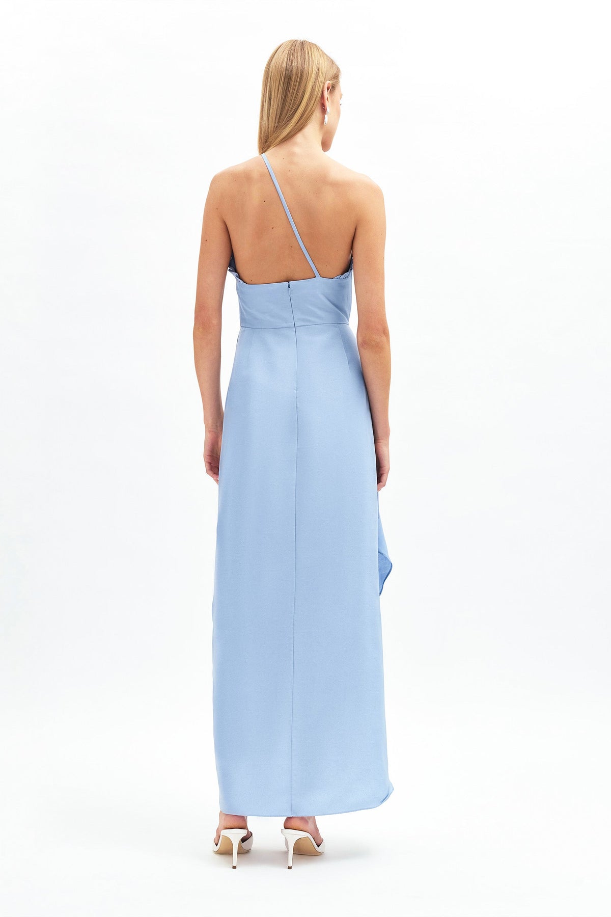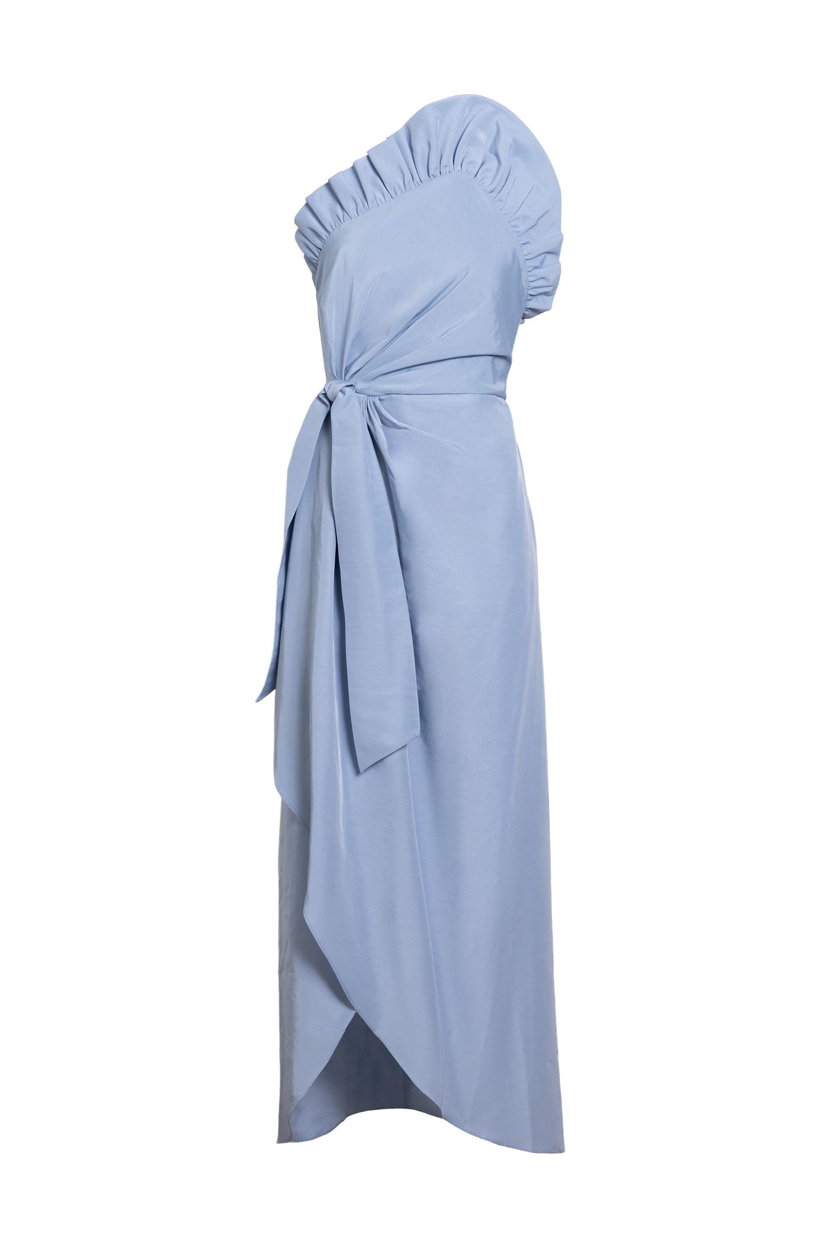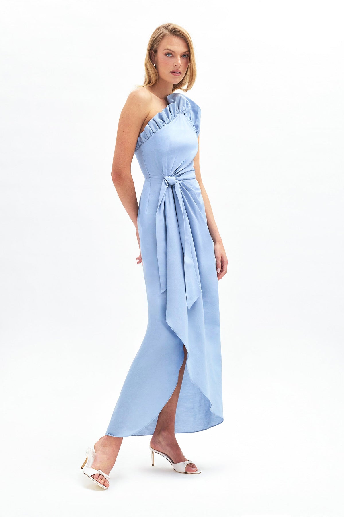 New for Spring, Charlotte arrives in a gown, sweeping the floor like she owns the invitation list and the guest list. The signature fanned neckline ruffle still frames the moment, while the wrap waist and tie hold her exactly where she wants to be — admired, but never caught. The asymmetrical line remains, but with extra drama, extra movement, extra story.