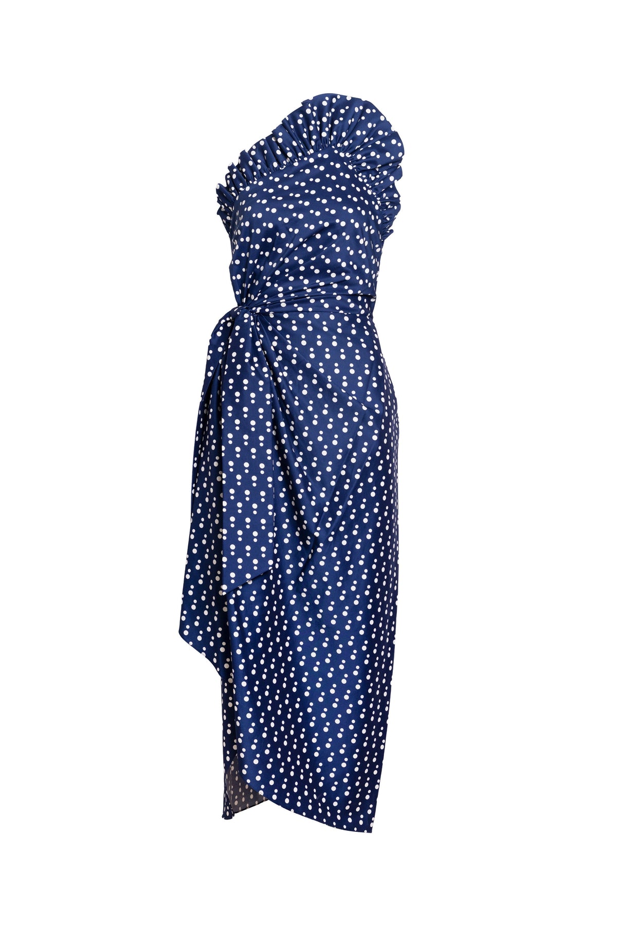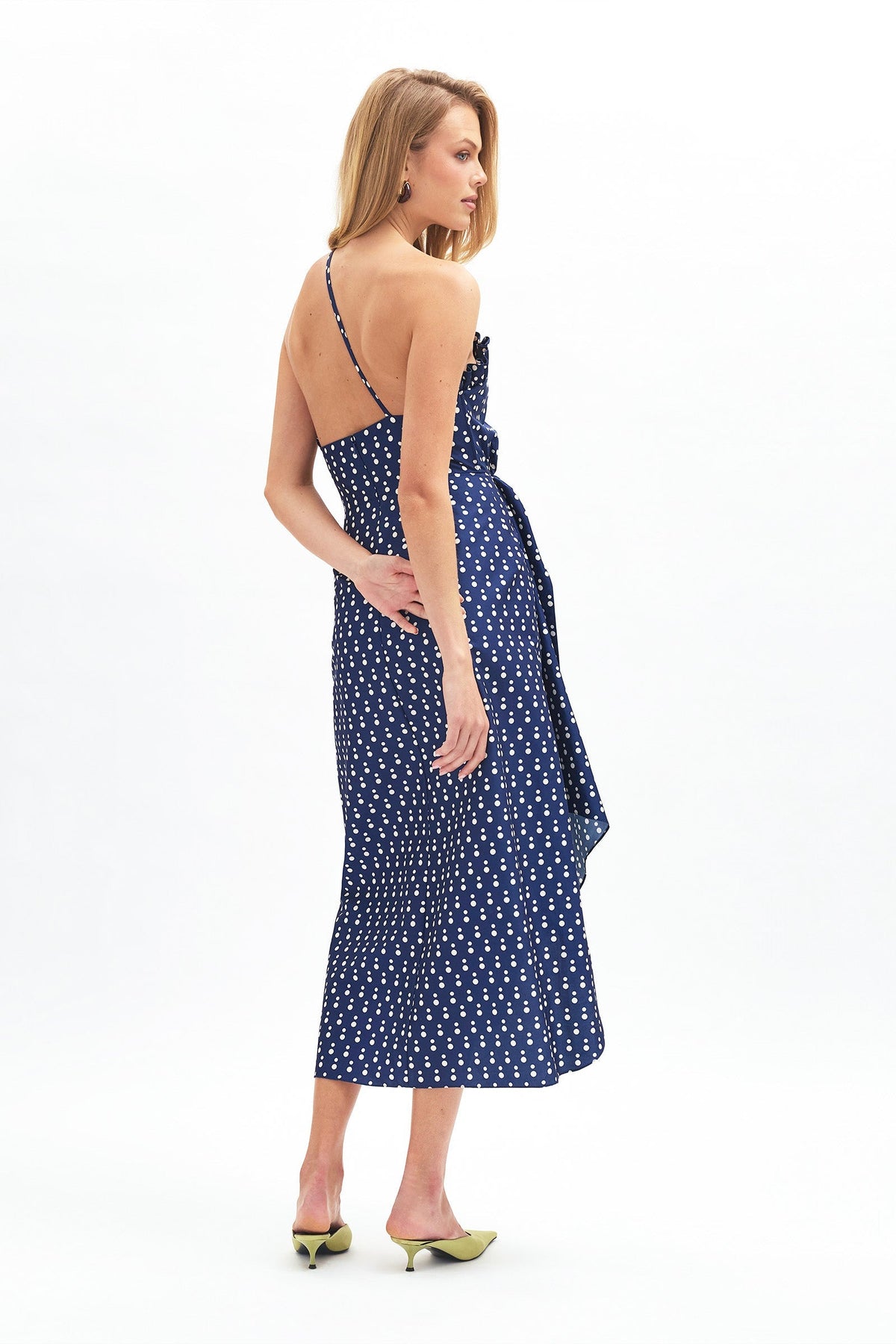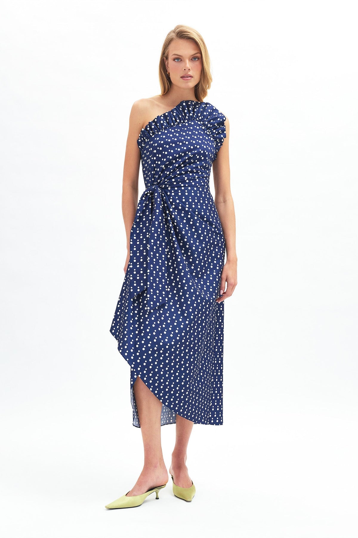 She is a midi length beauty, with a flirty, fanned neckline ruffle and an unexpected, asymmetrical skirt hem. At her waist is a wrap with an attached tie.