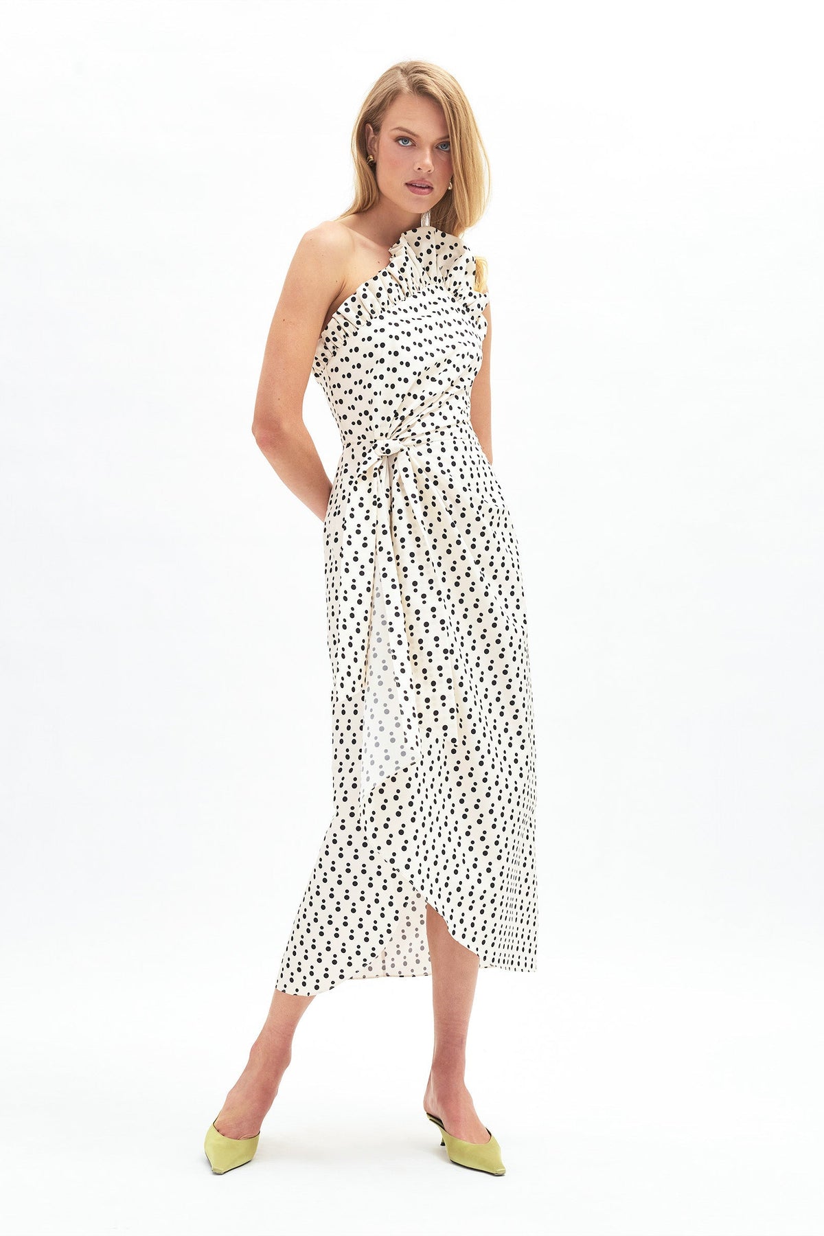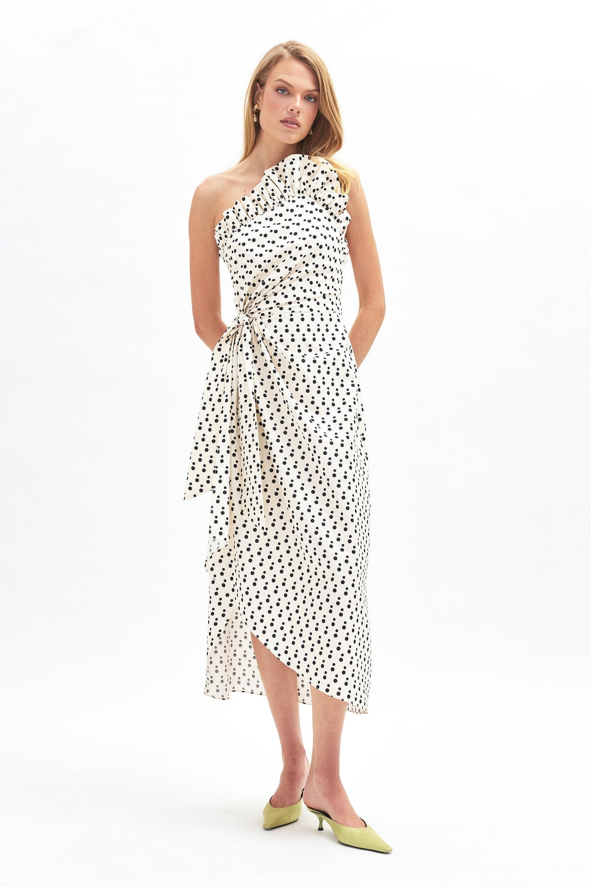 She is a midi length beauty, with a flirty, fanned neckline ruffle and an unexpected, asymmetrical skirt hem. At her waist is a wrap with an attached tie.