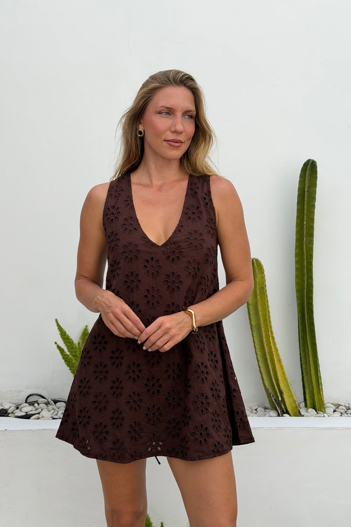 Introducing the Couper x Puka exclusive Mini Gili Dress in Brown Floral Eyelet! This reversible mini dress is cleverly lined so it can be worn in both casual and more formal settings. Enjoy the versatility of this dress, with the option to wear it as a plunging v-neck or high neck dress.