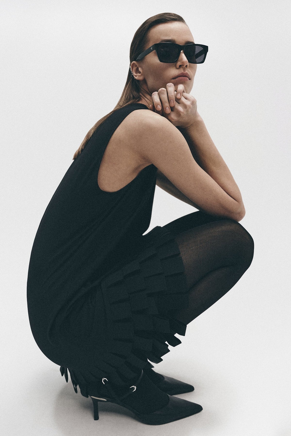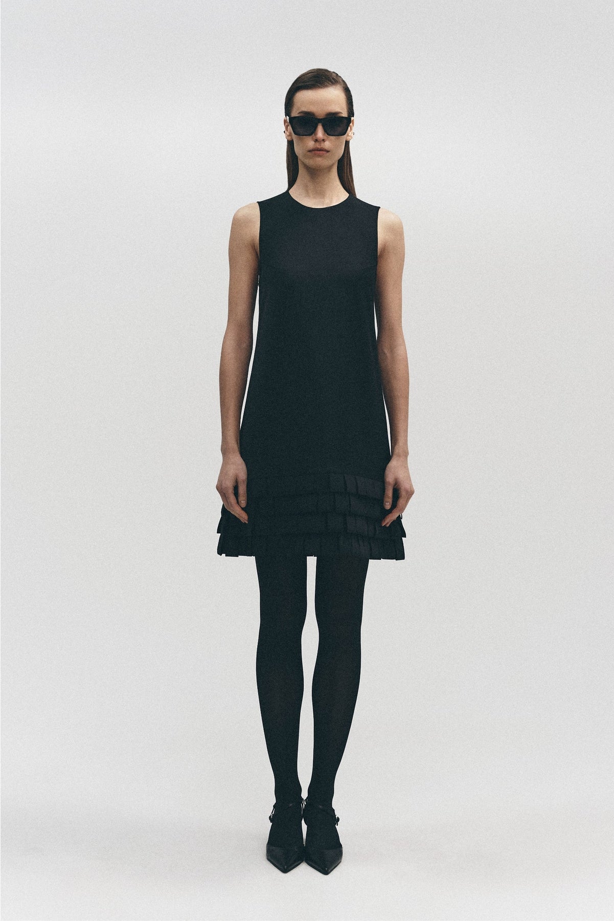 The Dranka Dress features a flattering A-line silhouette that skims the body while the voluminous bottom creates movement and visual interest. This mini dress combines tailored structure at the bodice with an artfully gathered skirt, offering a sophisticated balance between fitted and flowing elements. The decorative volume at the hem adds dimension and playful elegance, making it versatile enough for casual outings or elevated occasions. The A-line cut is universally flattering, elongating the silhouette while providing comfortable room through the lower half. Perfect for those seeking a dress that transitions seamlessly from day to evening wear.