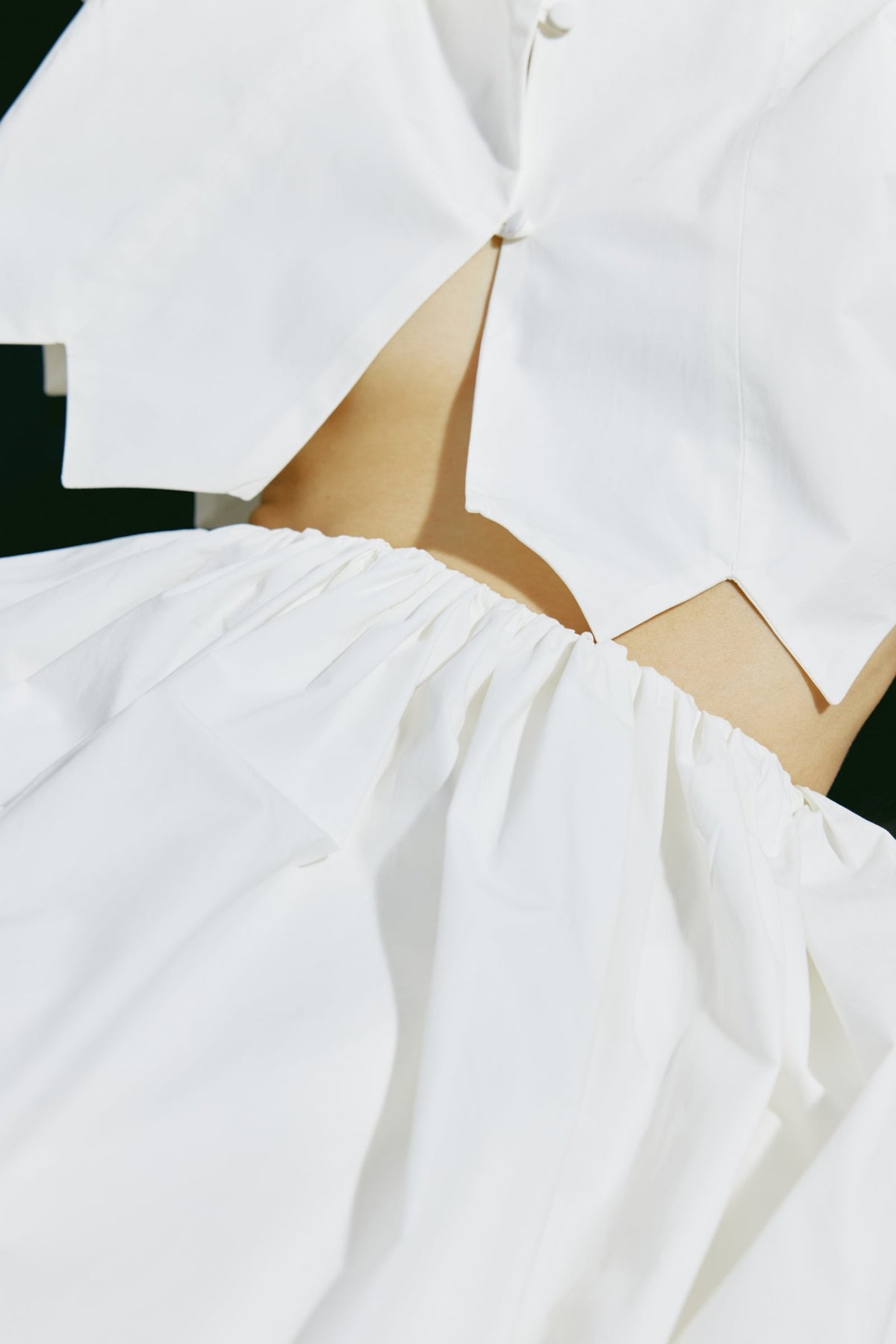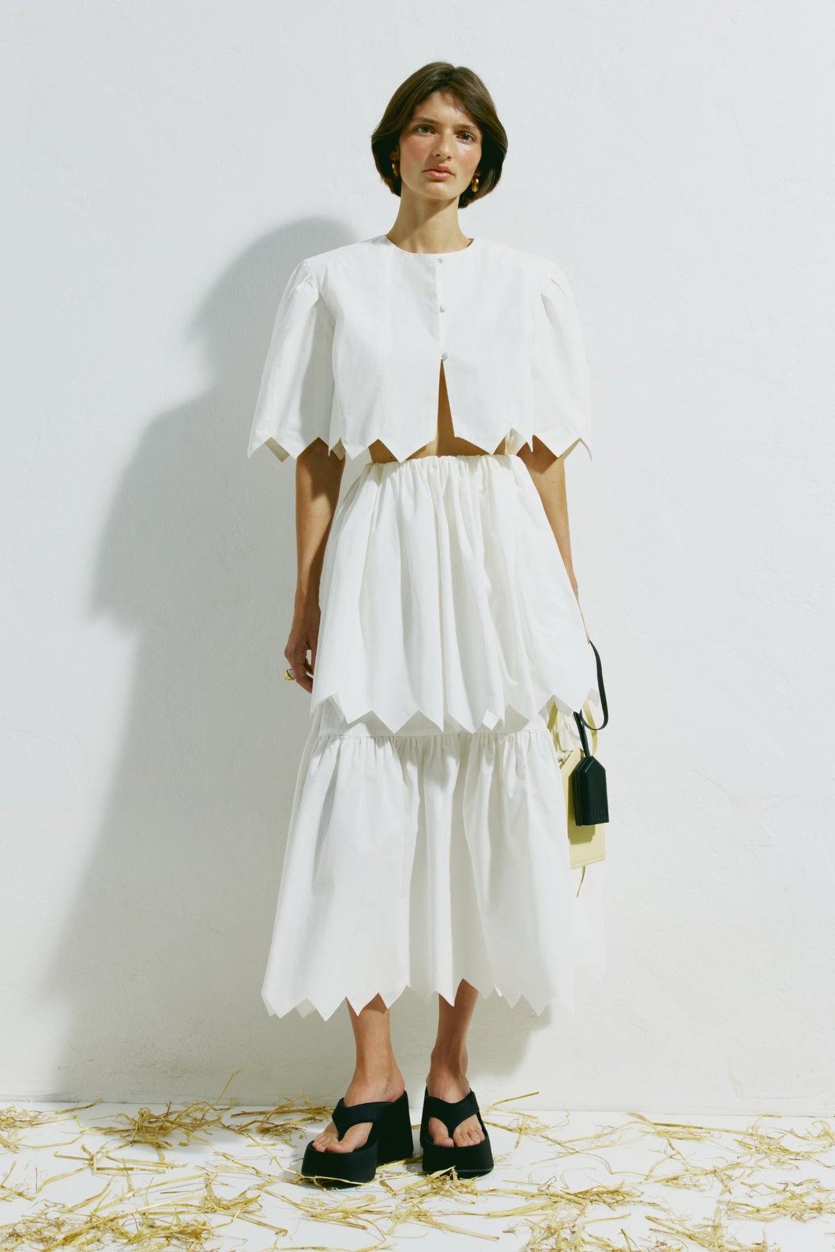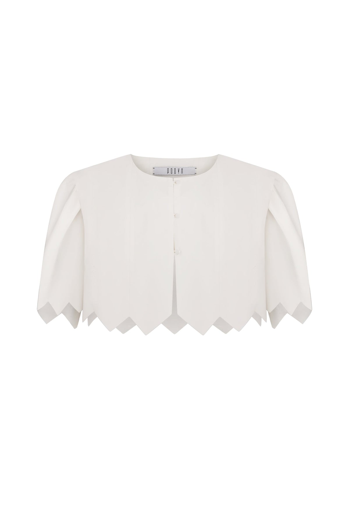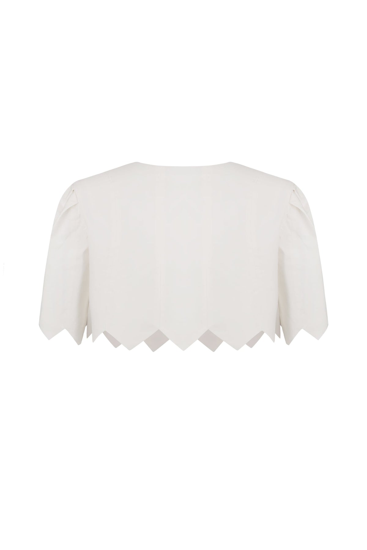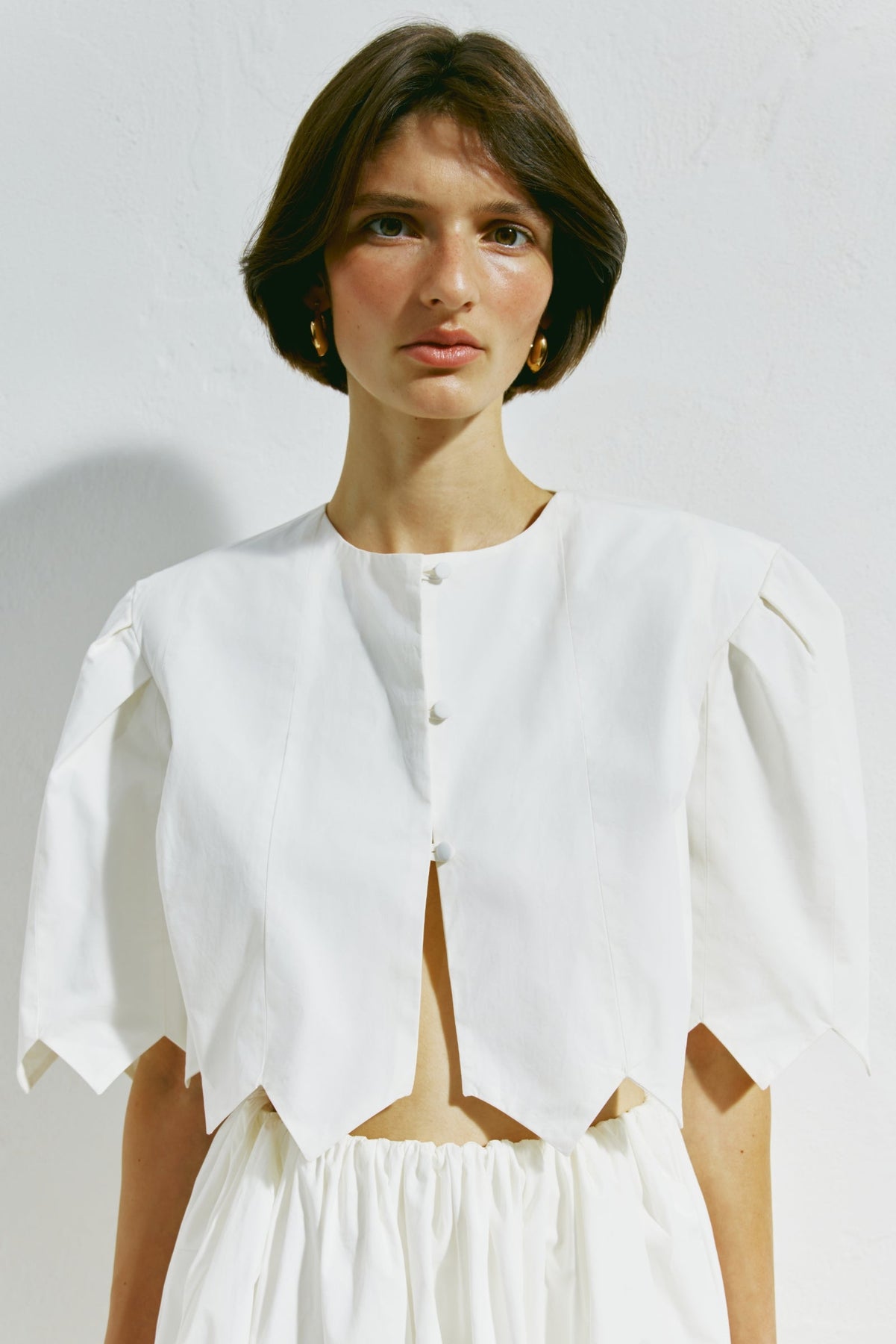 This refined cropped silhouette features premium lightweight cotton construction with thoughtfully designed shoulder pads for structure and definition. The scalloped hemline adds a sophisticated textural detail, while the button closure provides both functionality and polished styling versatility.