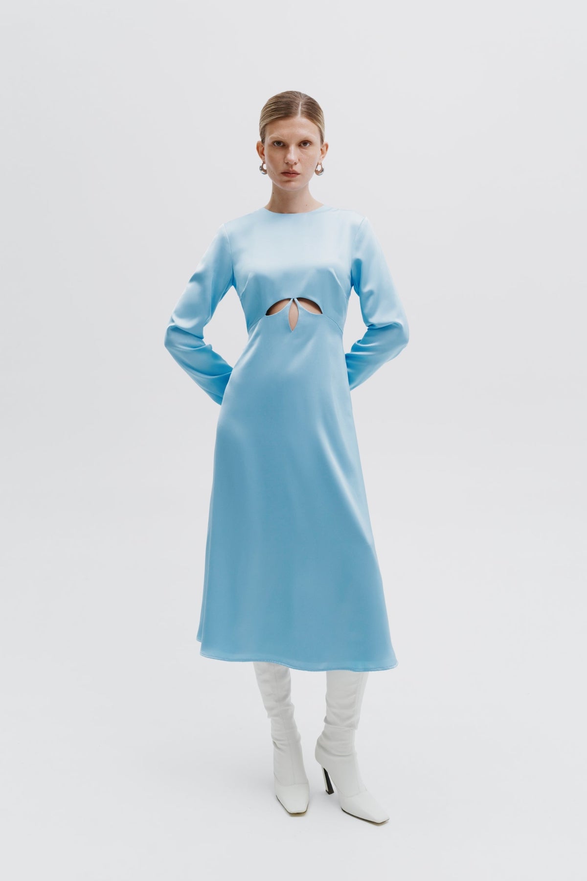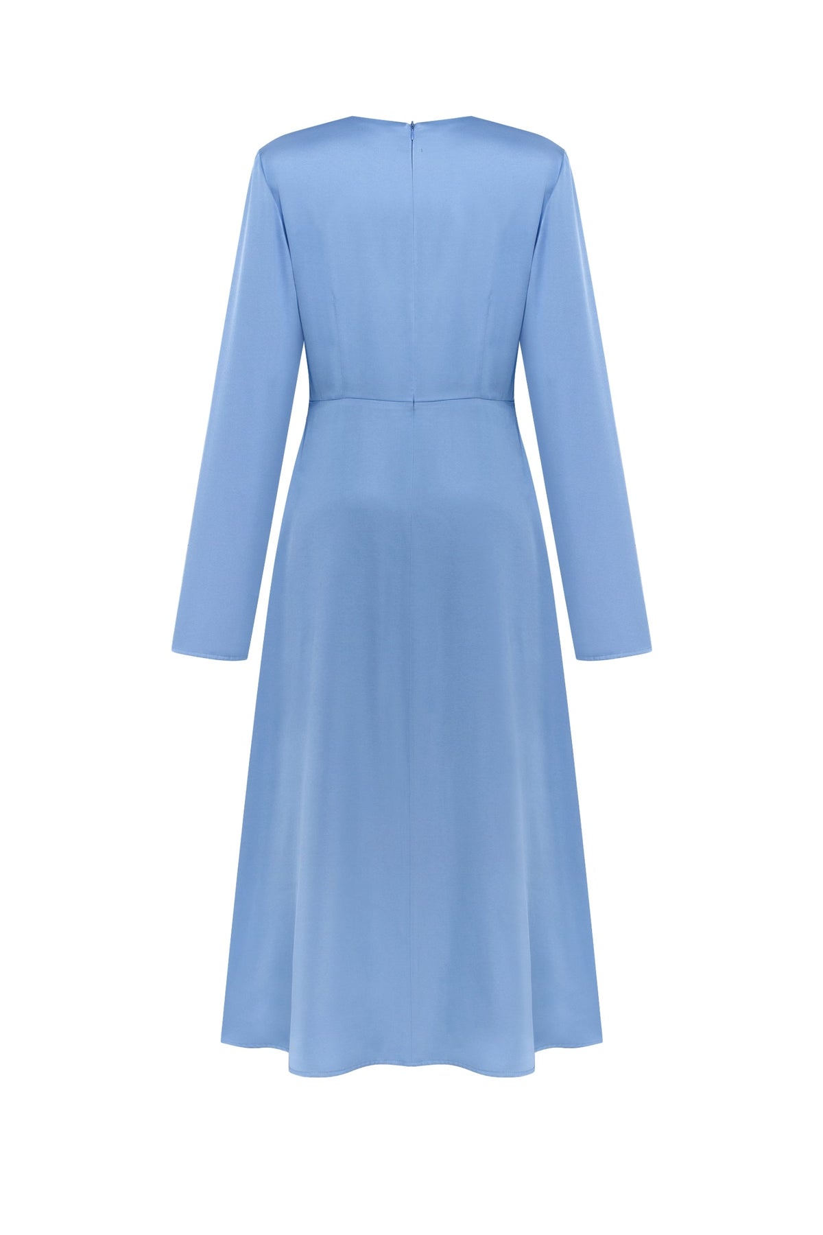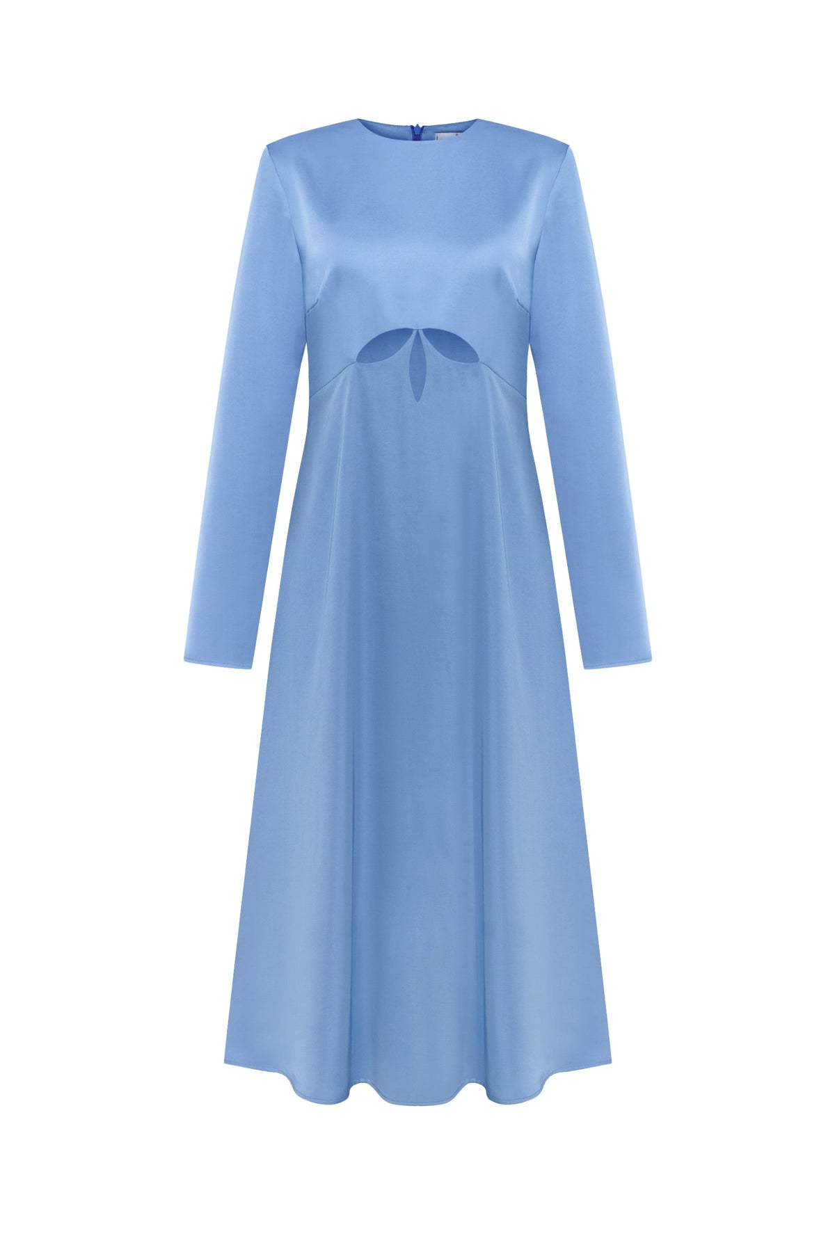 The Gromovyk Dress in Sky Blue exemplifies refined tailoring with its fitted bodice and gracefully proportioned A-line silhouette. Crafted from luxurious double-layered satin, this midi-length piece delivers both structure and fluidity, ensuring a polished appearance from day to evening. Long sleeves provide elegant coverage while the decorative petal-shaped cutouts at the front introduce a sophisticated design element that catches light beautifully. The concealed back zipper ensures a seamless finish and effortless dressing. The sky blue colorway offers versatility, pairing seamlessly with neutral accessories or statement jewelry. This dress transitions effortlessly between professional settings and special occasions, making it an essential addition to any discerning wardrobe.