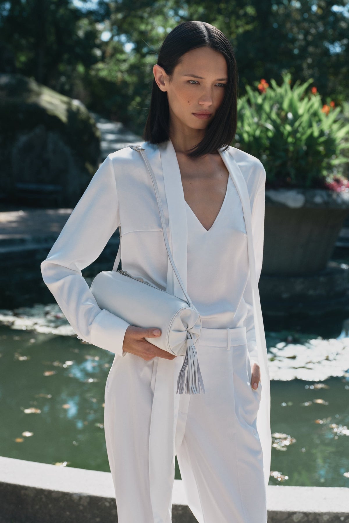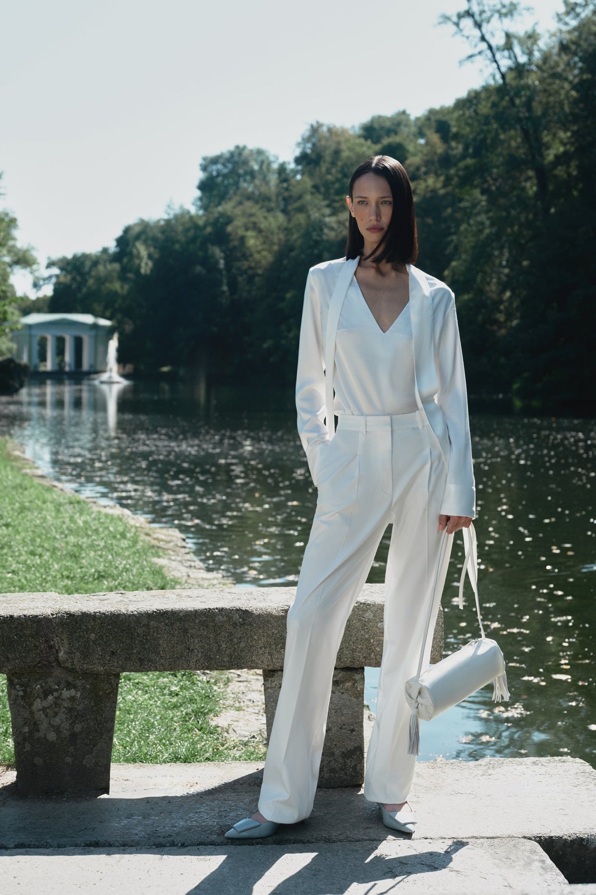 Elevate your wardrobe with these sophisticated Kemer Pants in Meringue White. Crafted from luxurious satin, these straight-leg trousers feature a high-waisted silhouette that flatters and elongates the frame. The front pleats add refined structure and movement, while the side pockets provide practical functionality. Finished with back flap pockets featuring a distinctive shaped edge, these pants deliver both style and substance. The crisp white hue offers versatility for seamless styling across seasons, making them an essential investment piece for the discerning wardrobe