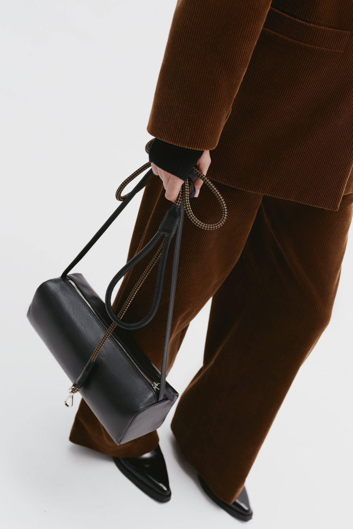 Shoulder bag in reinforced suede with rounded edges and an adjustable strap, featuring Italian hardware and metal protective feet. Single compartment lined and secured with a zipper closure.