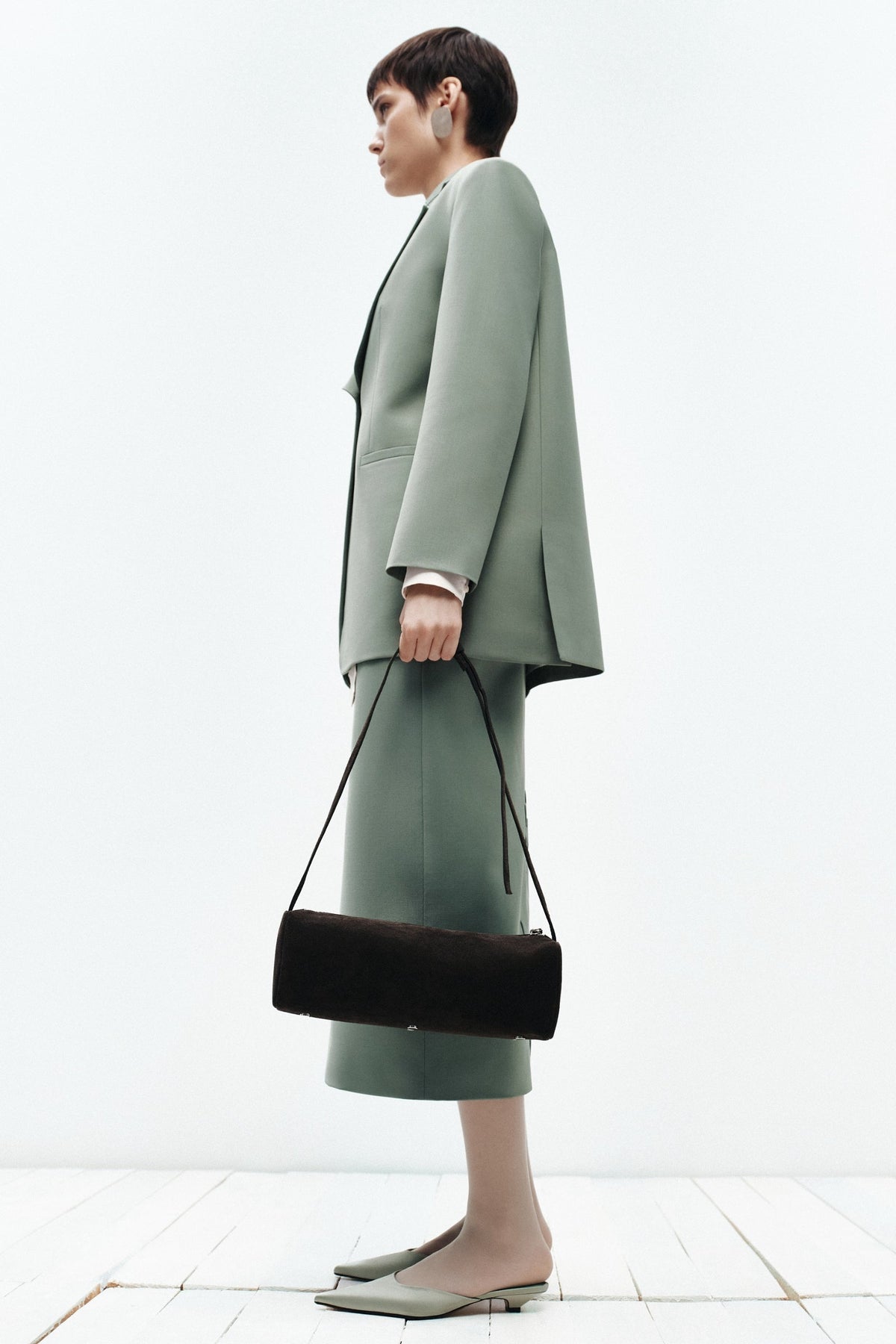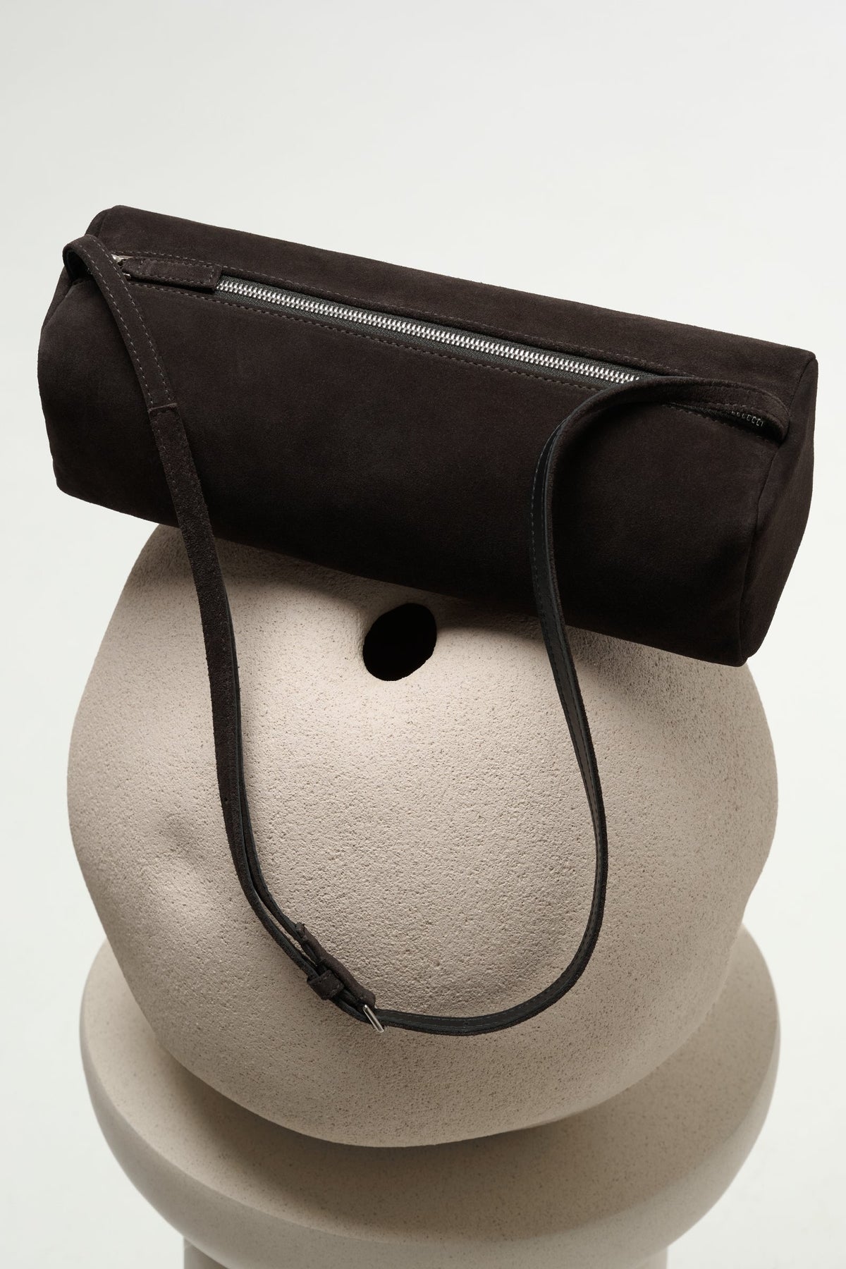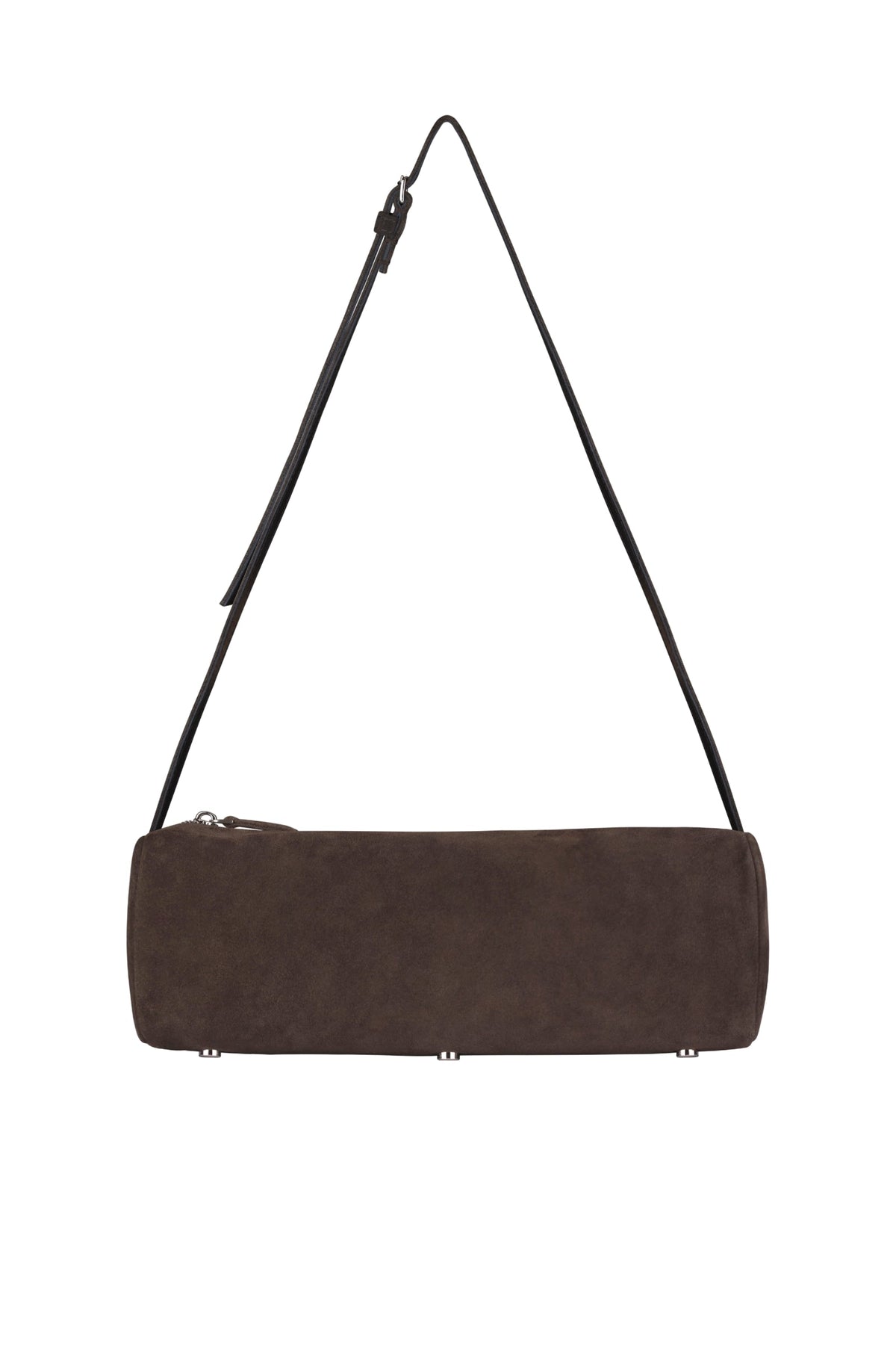 Shoulder bag in reinforced suede with rounded edges and an adjustable strap, featuring Italian hardware and metal protective feet. Single compartment lined and secured with a zipper closure. The structured silhouette and premium construction make this versatile piece ideal for daily wear, while the protective feet preserve the bag's integrity during regular use. The adjustable strap accommodates various carrying preferences, and the lined interior provides organization for essentials. Crafted with attention to detail, this bag combines functional design with refined aesthetics for a timeless accessory.