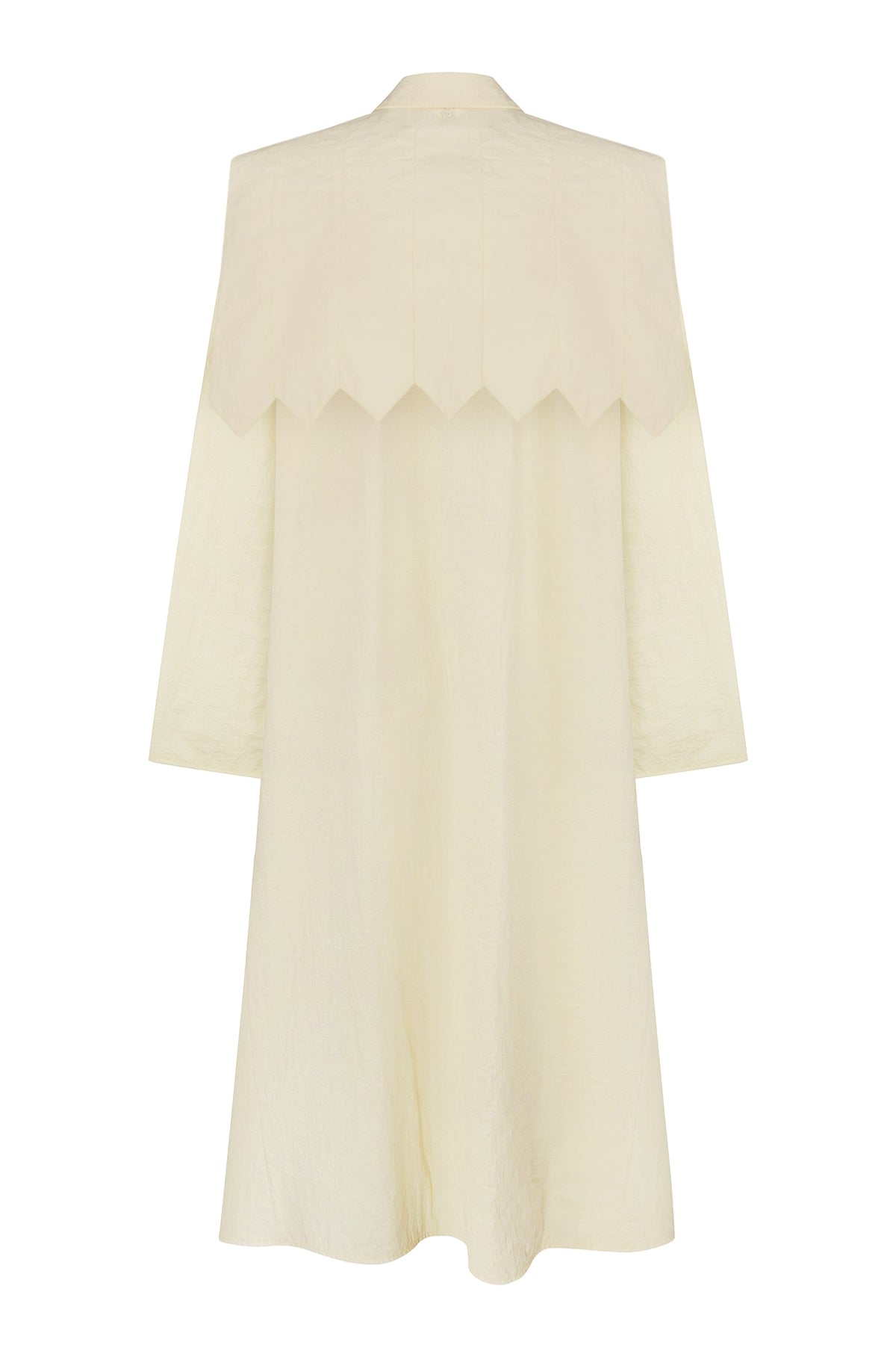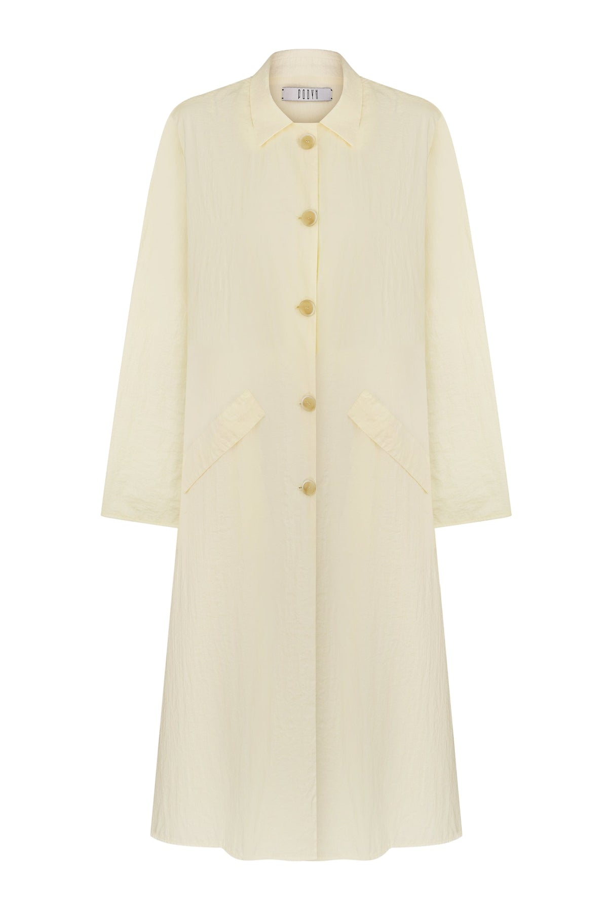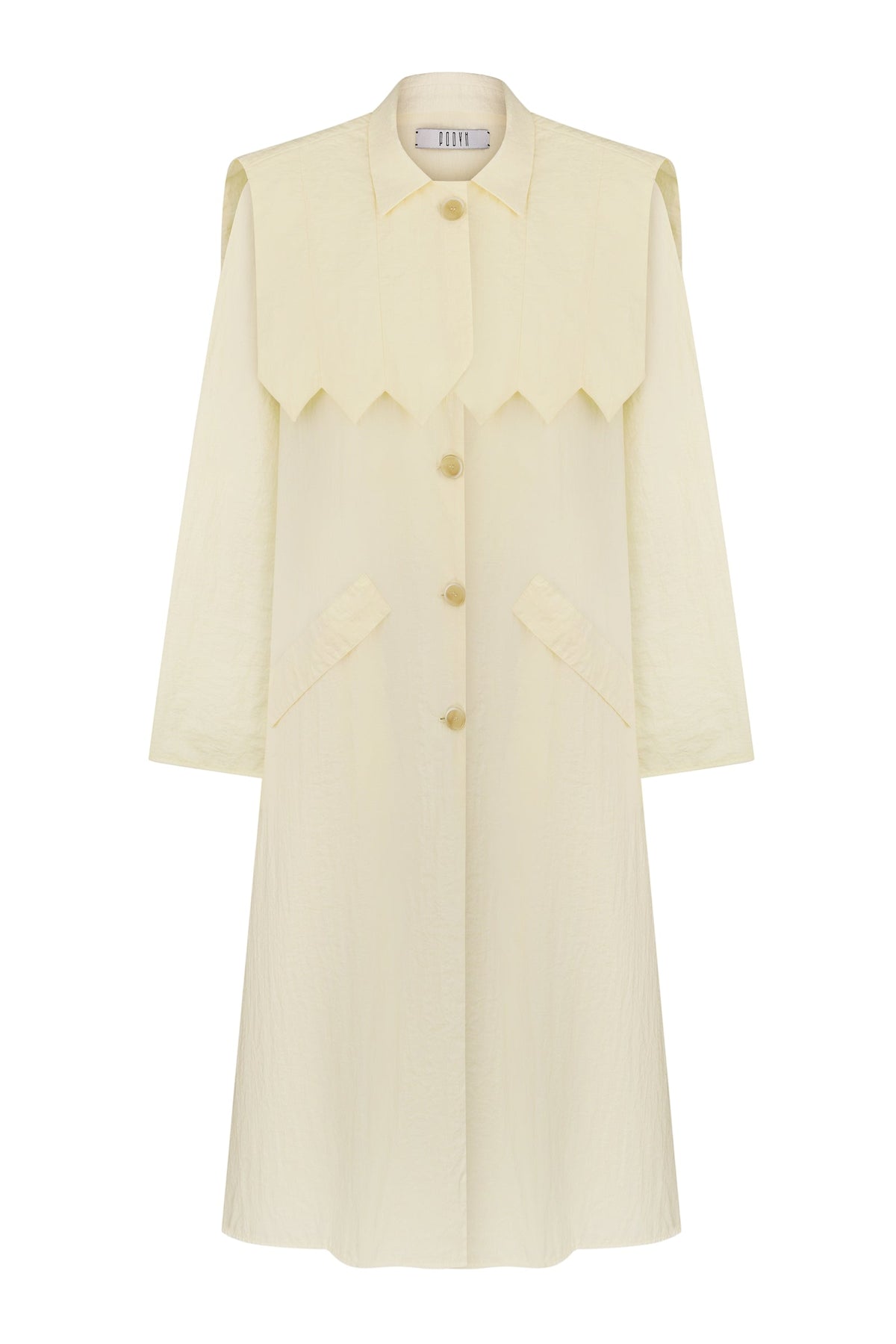 This sophisticated mid-length coat features a graceful A-line cut crafted from durable, water-repellent polyamide. The design includes practical front flap pockets, a streamlined button front, and a distinctive removable yoke that adds versatile styling options. Its oversized fit delivers contemporary comfort without compromising polish.