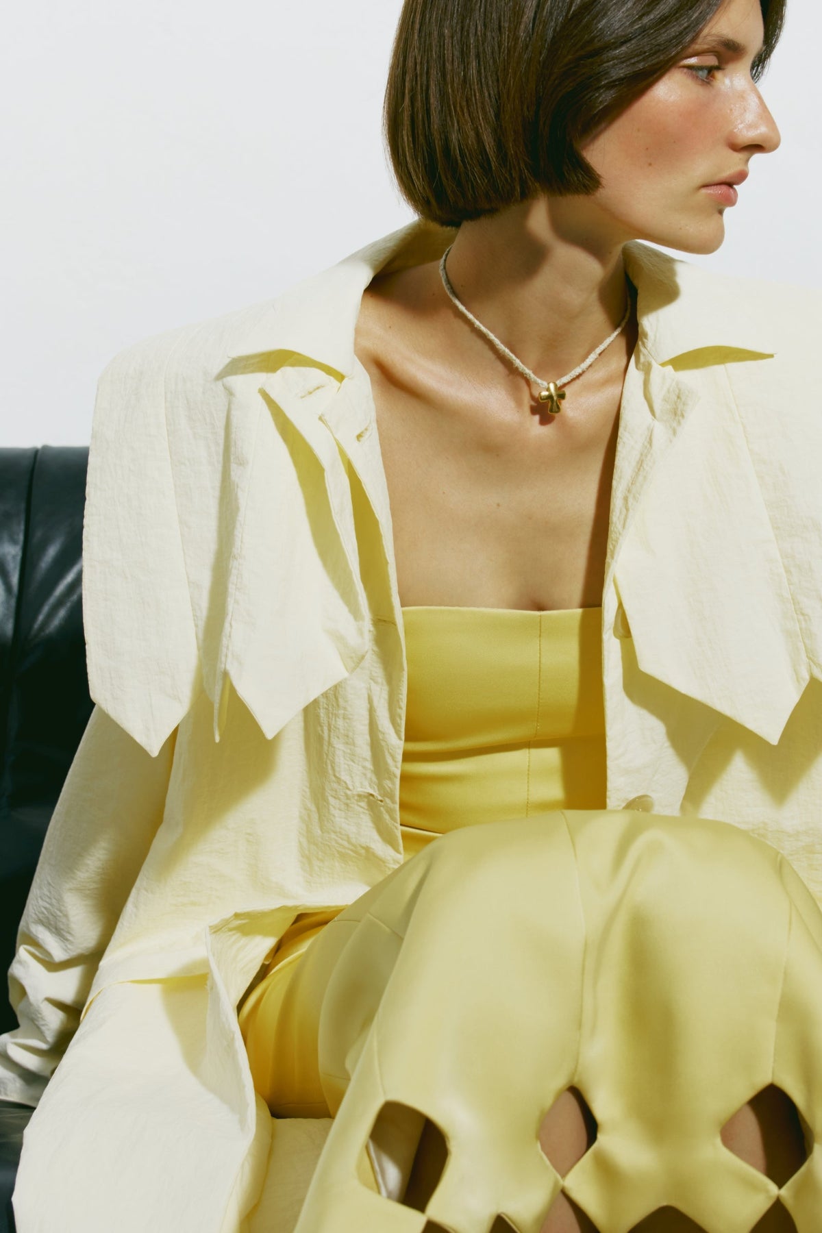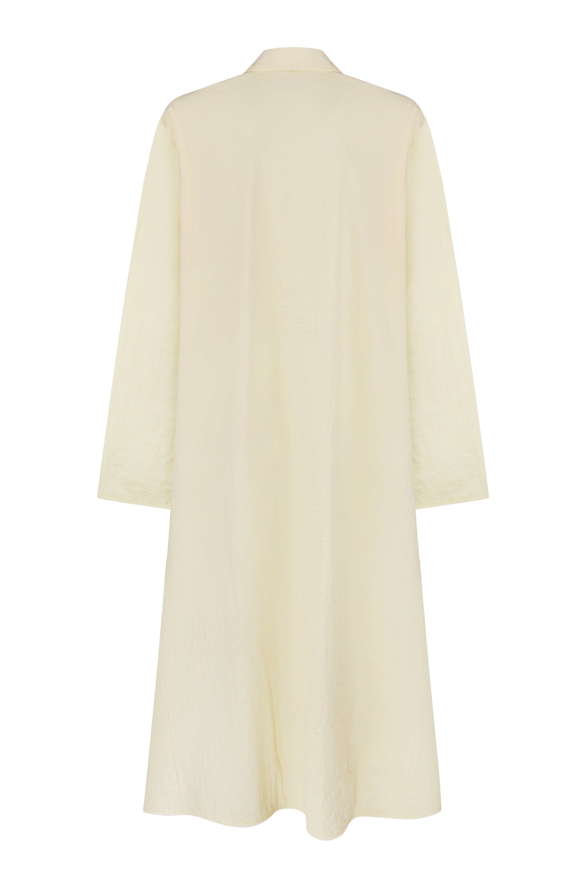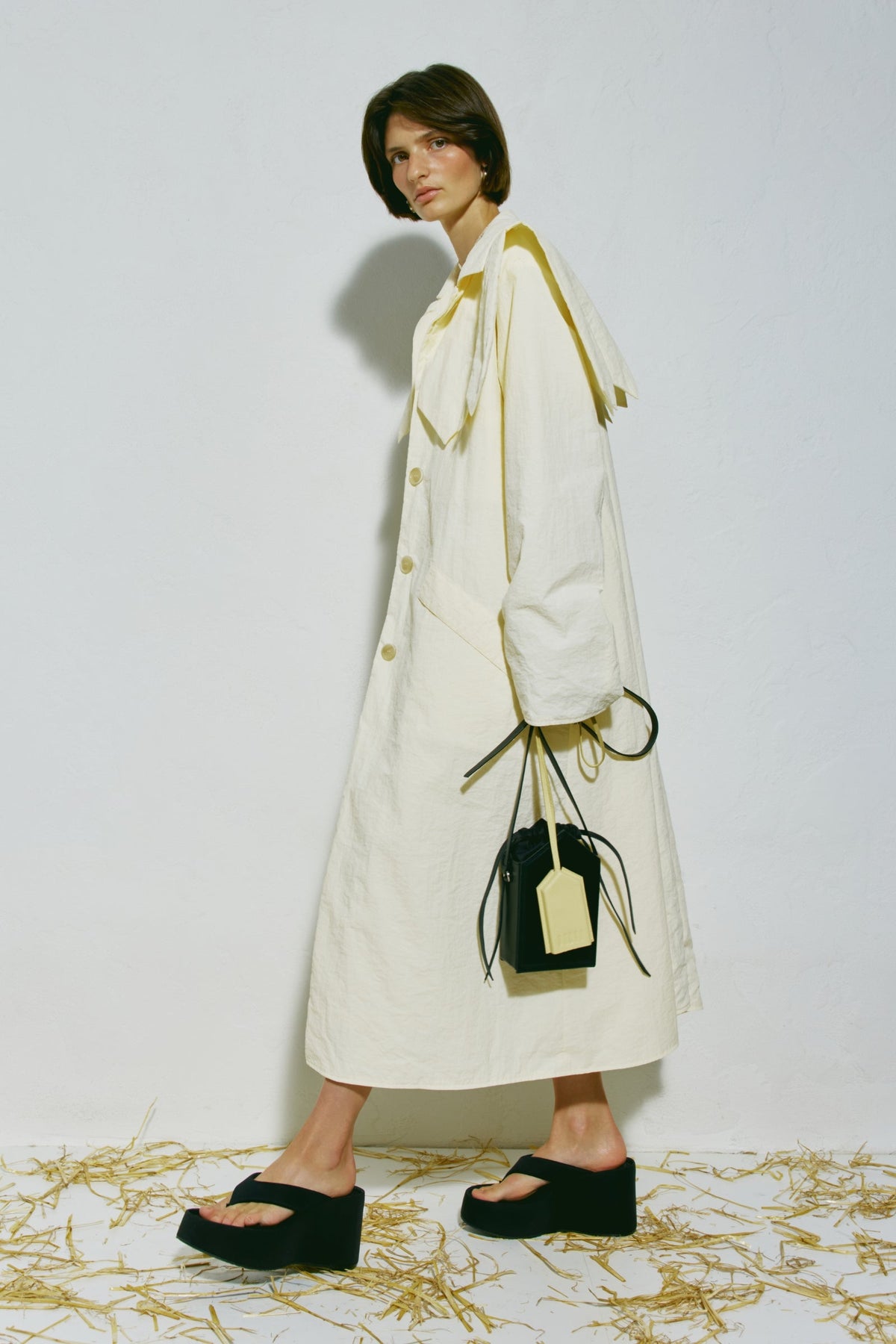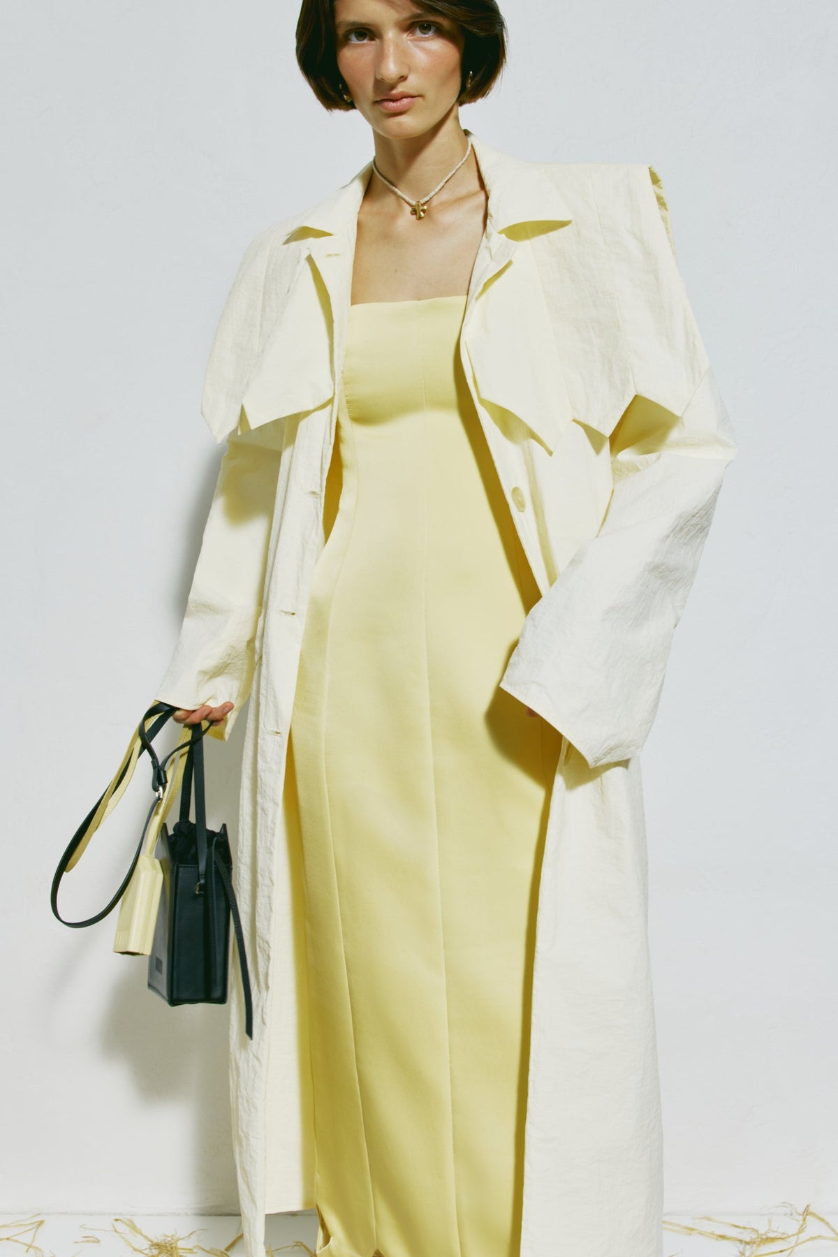 This sophisticated mid-length coat features a graceful A-line cut crafted from durable, water-repellent polyamide. The design includes practical front flap pockets, a streamlined button front, and a distinctive removable yoke that adds versatile styling options. Its oversized fit delivers contemporary comfort without compromising polish.