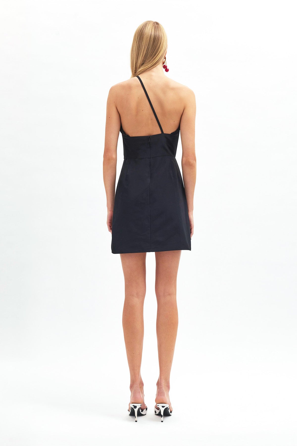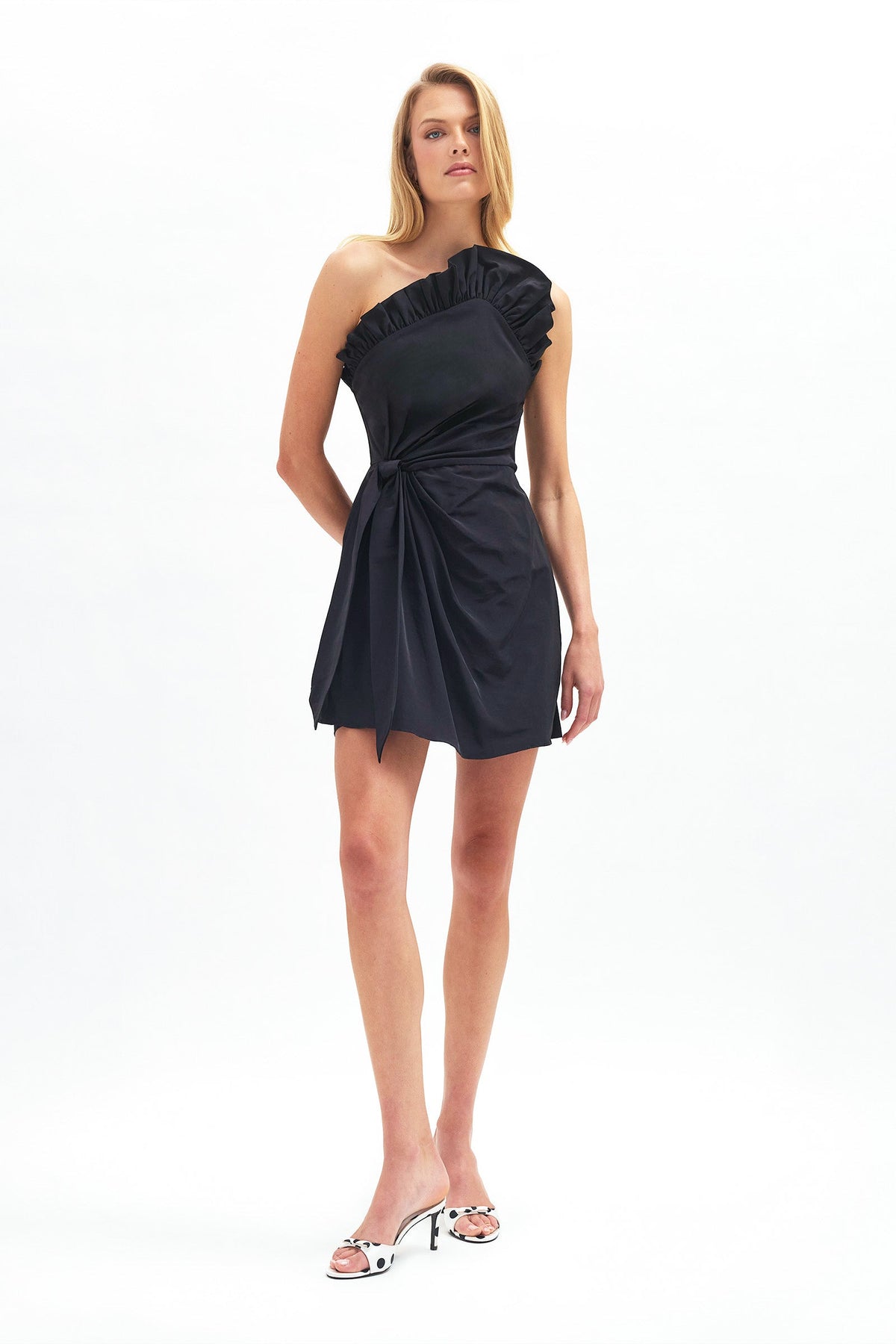Charlotte returns this season in mini form — same romantic energy, shorter hemline. She keeps her signature flirty, fanned neckline ruffle and wrap waist with attached tie, but trades length for leg and innocence for intention. The asymmetrical hem still brings the unexpected — just faster.