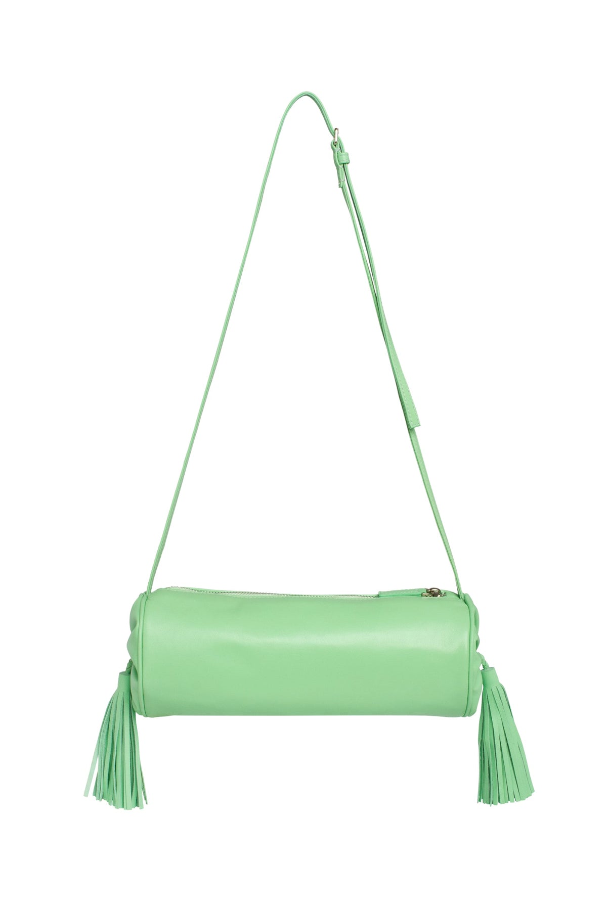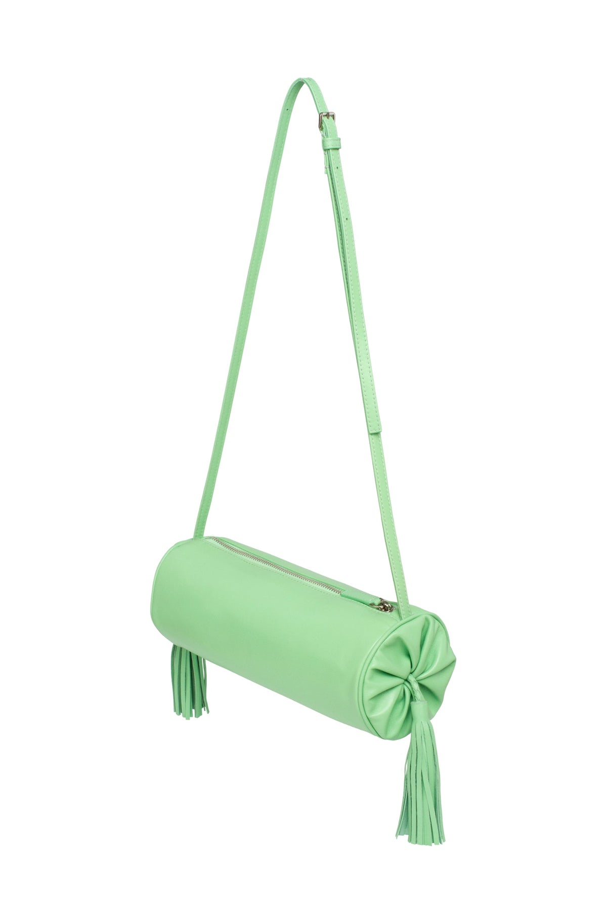 The Puskul Bag in Sorbet Green is a refined cylindrical crossbody crafted from quality leather, designed for those who appreciate understated elegance. Its streamlined silhouette pairs effortlessly with contemporary wardrobes while maintaining timeless appeal. The adjustable thin strap allows for customizable carry options, whether worn across the body or at the shoulder, adapting to your lifestyle and preference. Decorative tassels add a subtle finishing touch that elevates the piece beyond basic functionality. Compact yet capacious, this bag accommodates daily essentials without unnecessary bulk, making it an ideal companion for work, travel, or casual outings. The sorbet green hue offers a sophisticated alternative to neutral tones, bringing understated color to your accessory collection.