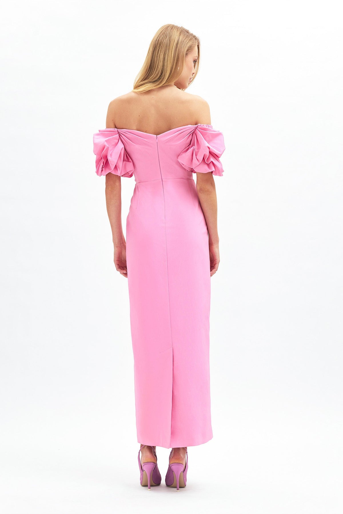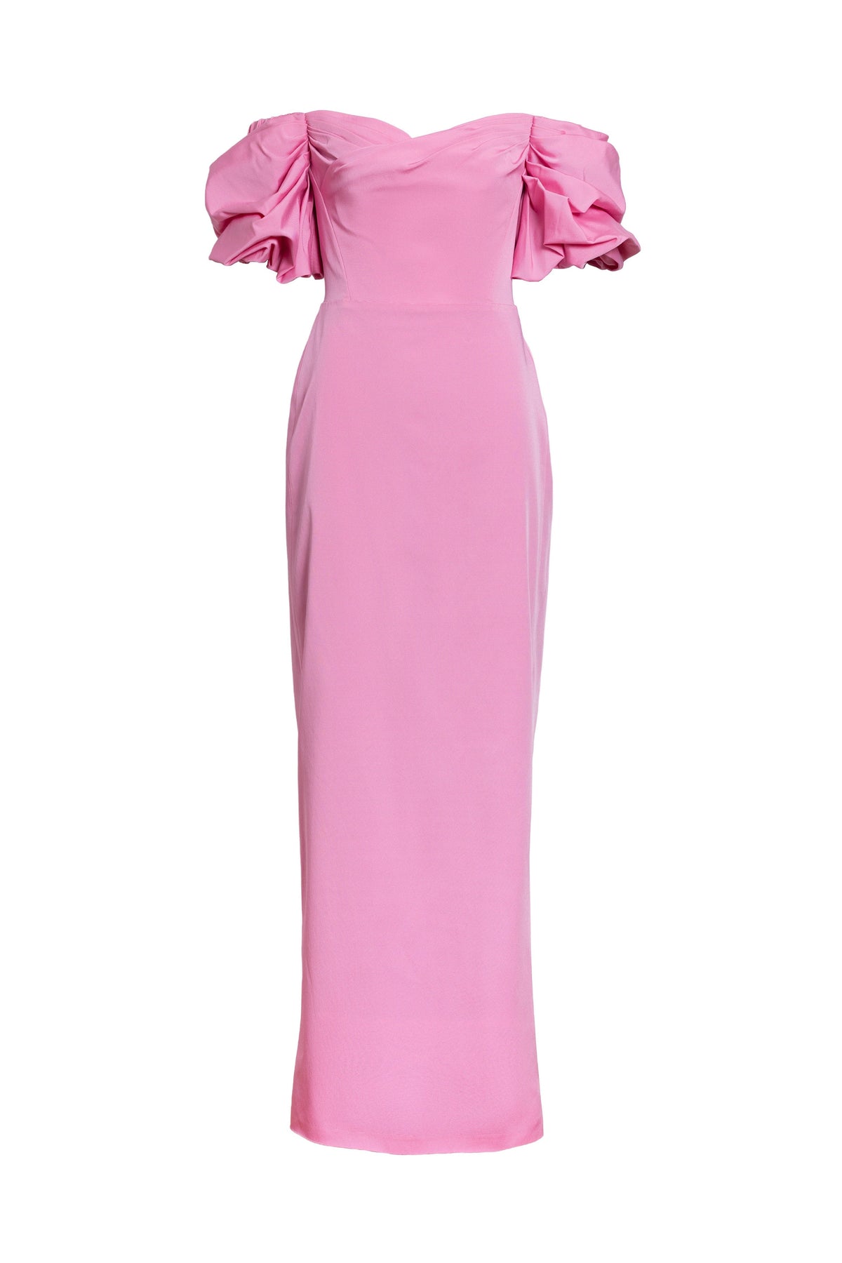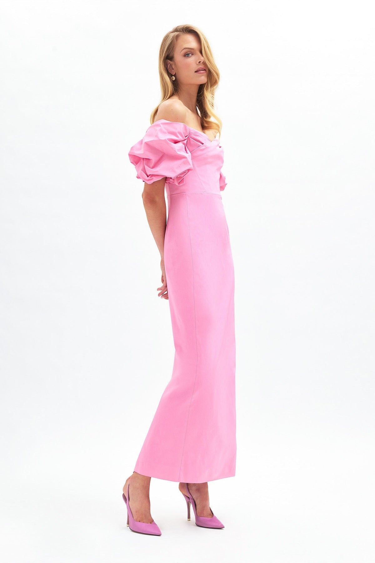 Tess takes her signature authority and stretches it to a floor-length fitted gown. The newly updated off the shoulder puff sleeve and sculpted drape still mean business but in bubblegum pink, she proves power can be playful — and twice as disarming.