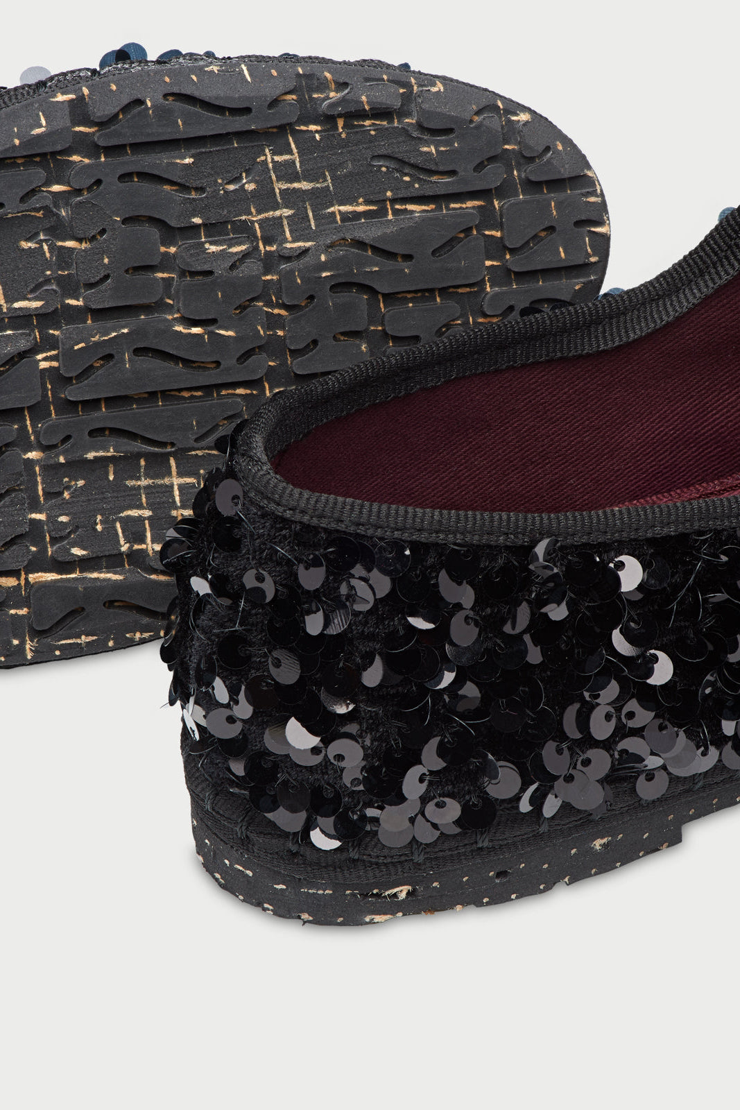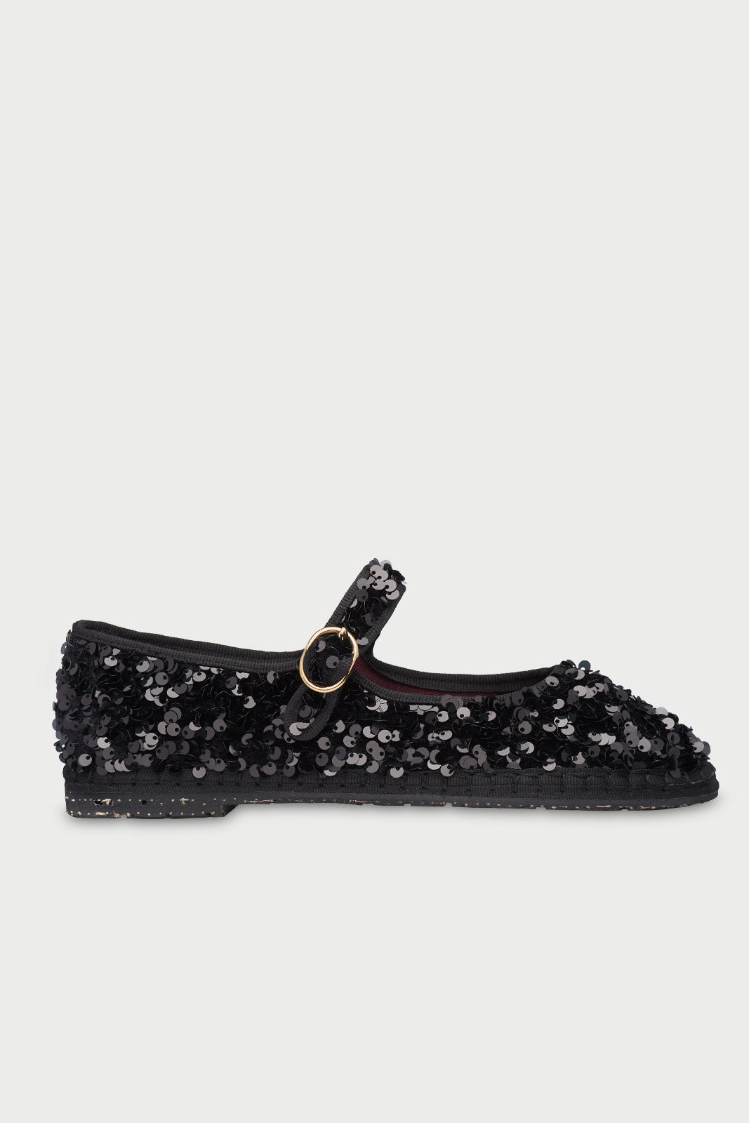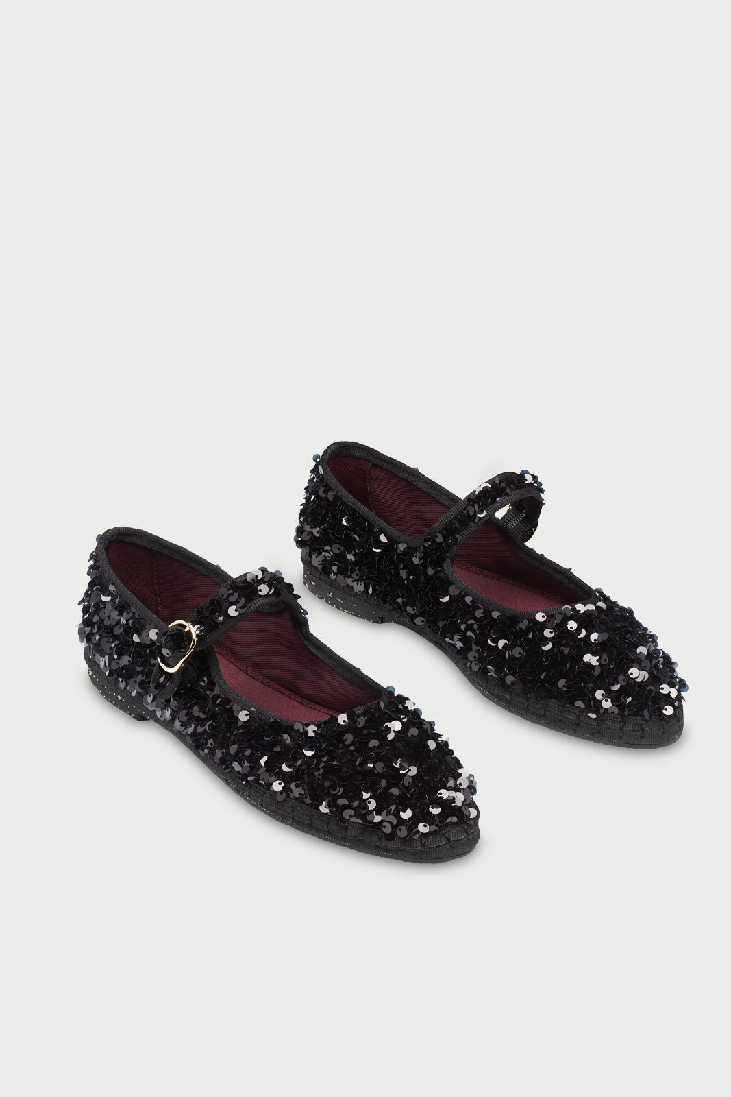 Black sequinned mary jane with black piping and buckle closure. The inside of the shoe is 100% ecological cotton with anti-bacterial treatment. The sole is made of rubber produced from recycled bicycle tyres.