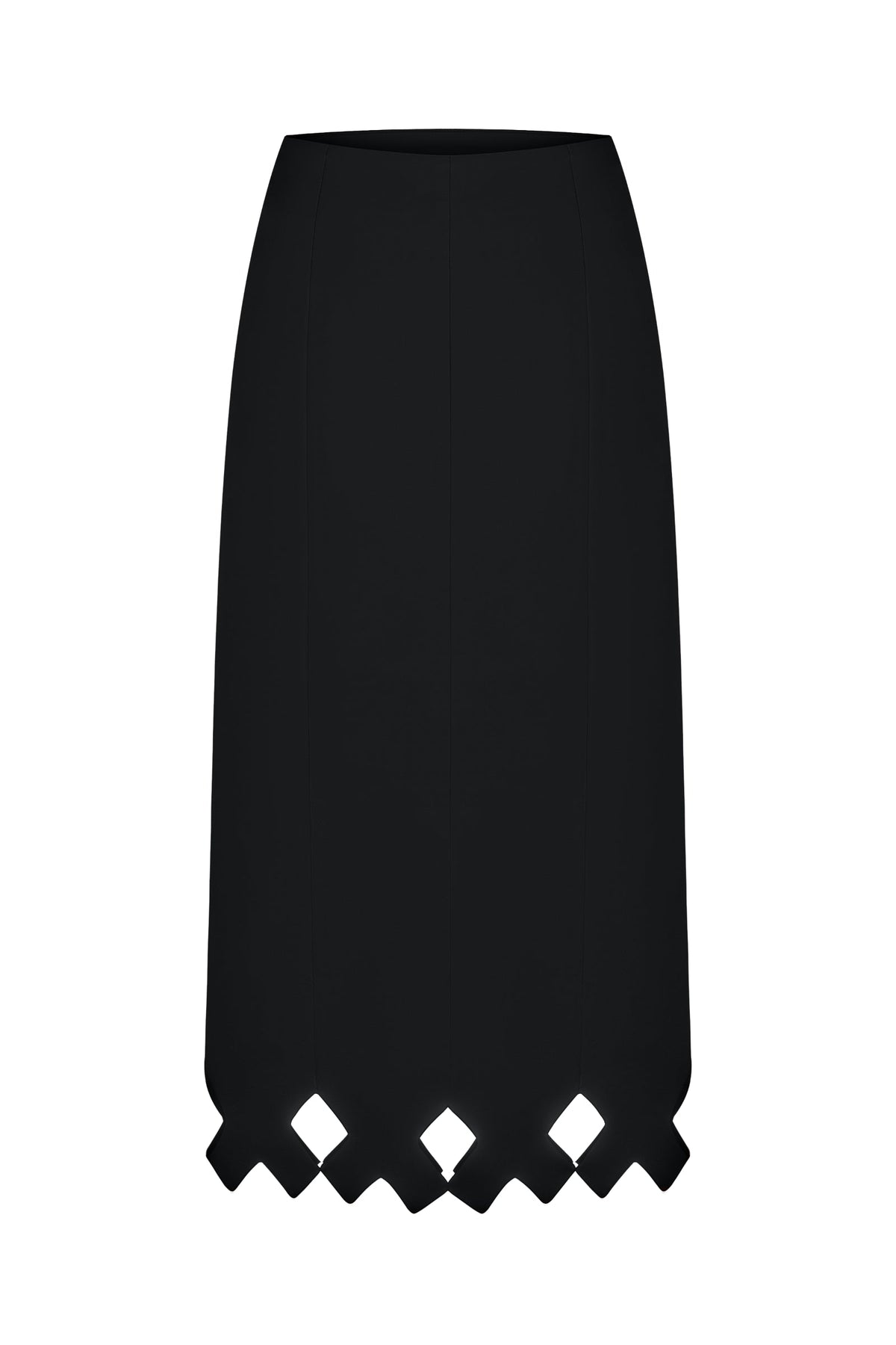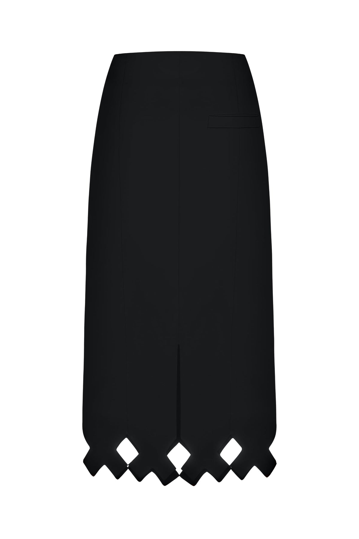 The Tympan Skirt in Black is a sophisticated mid-length piece crafted from fluid viscose that drapes elegantly with a straight silhouette. Featuring a discreet side zip closure for effortless dressing, this skirt offers both practicality and refined aesthetics. The center back vent provides subtle movement and comfort, while the distinctive scalloped hemline adds a refined textural detail that elevates the design. Versatile enough for professional settings or elevated casual wear, this skirt pairs seamlessly with tailored tops, fitted blouses, or oversized sweaters. The viscose fabric offers a luxurious feel with natural breathability, making it an essential wardrobe staple for those who appreciate understated elegance and quality construction.