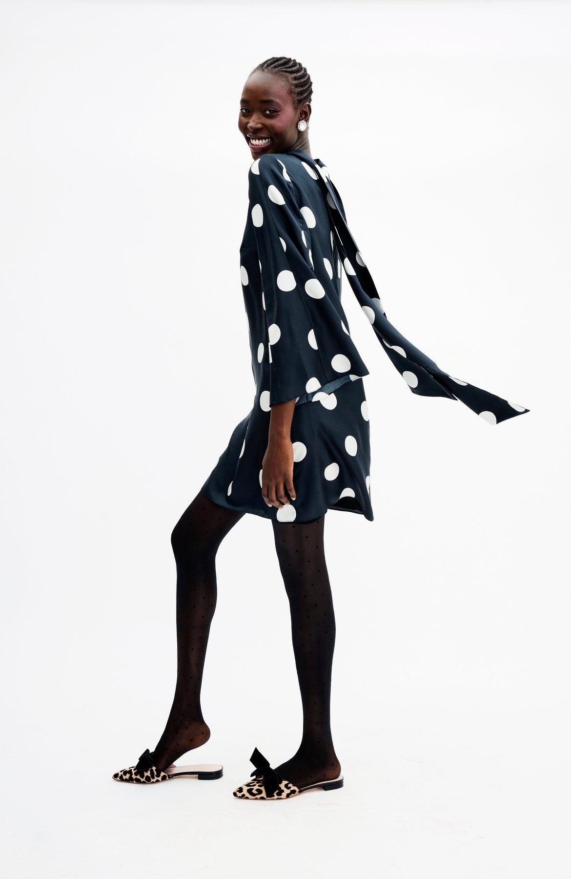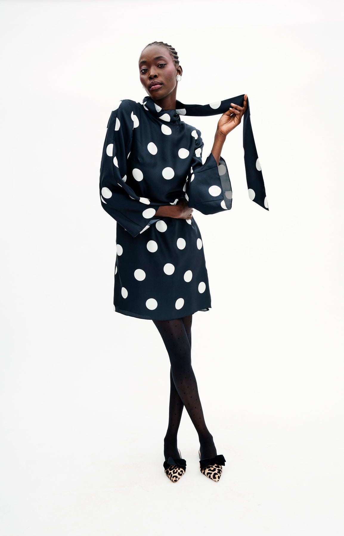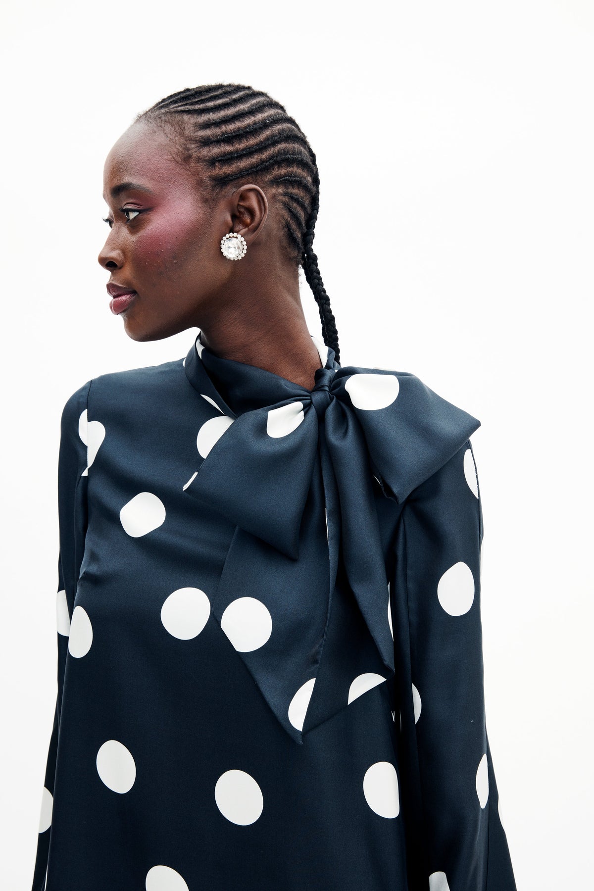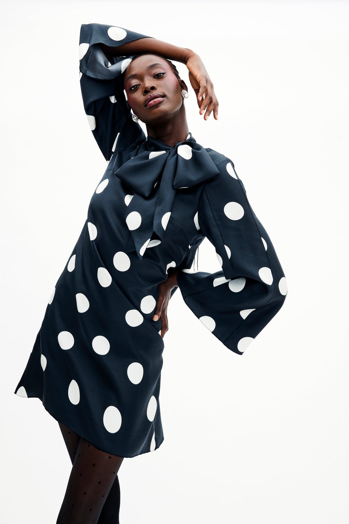 Crafted of pure silk twill, the talia dress will bring instant sophistication with its fluid a-line silhouette, fluted bell sleeve and neck tie detail.