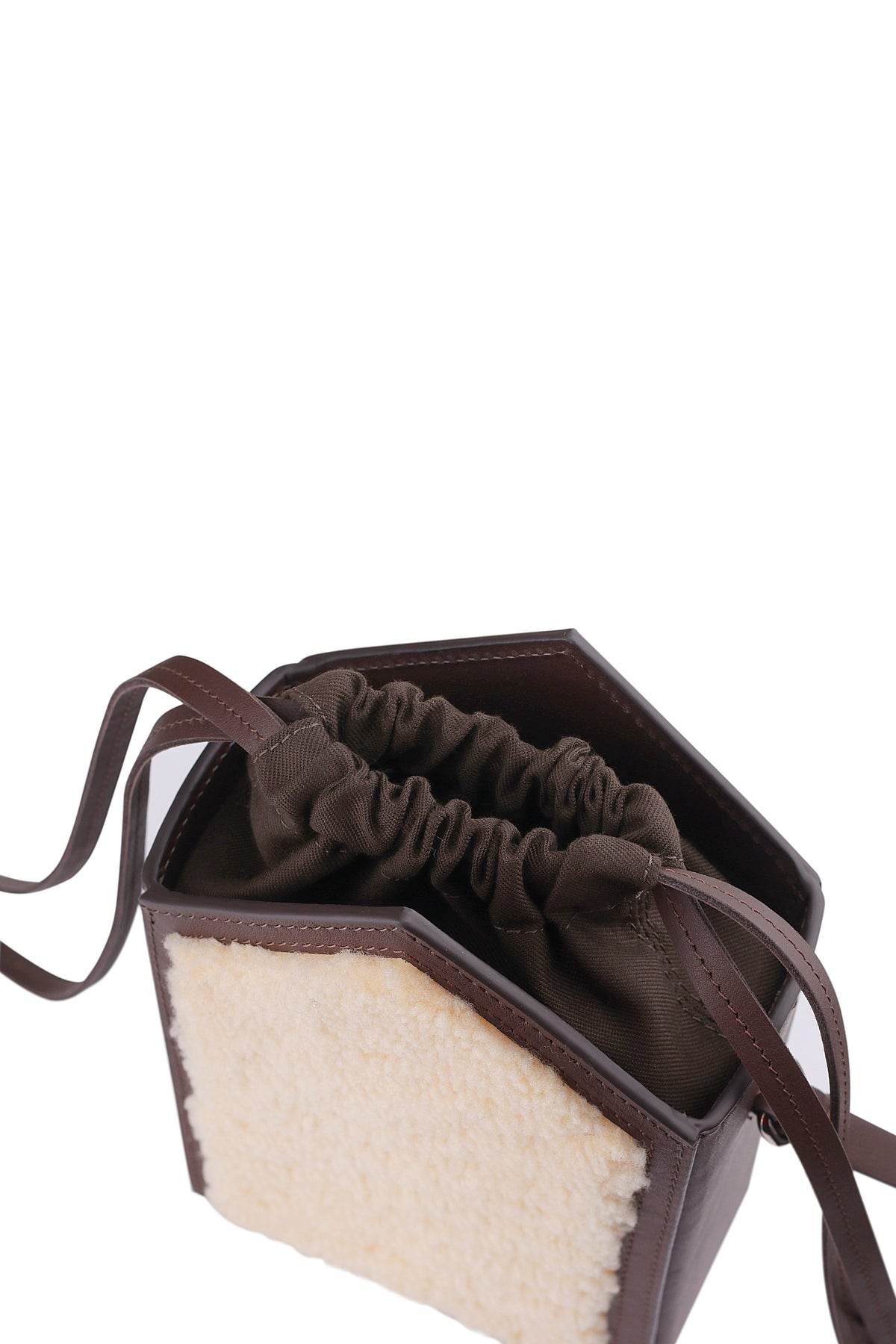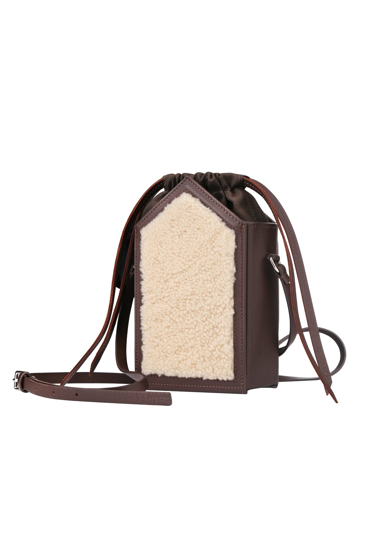 This structured shoulder bag combines refined materials with practical design. Crafted from smooth matte calfskin leather and luxurious sheepskin, it features a single spacious compartment secured by leather drawstrings and a flat shoulder strap for comfortable carry. An interior patch pocket provides convenient organization for smaller essentials. The rigid construction maintains its shape while the quality leather develops a distinguished patina over time.