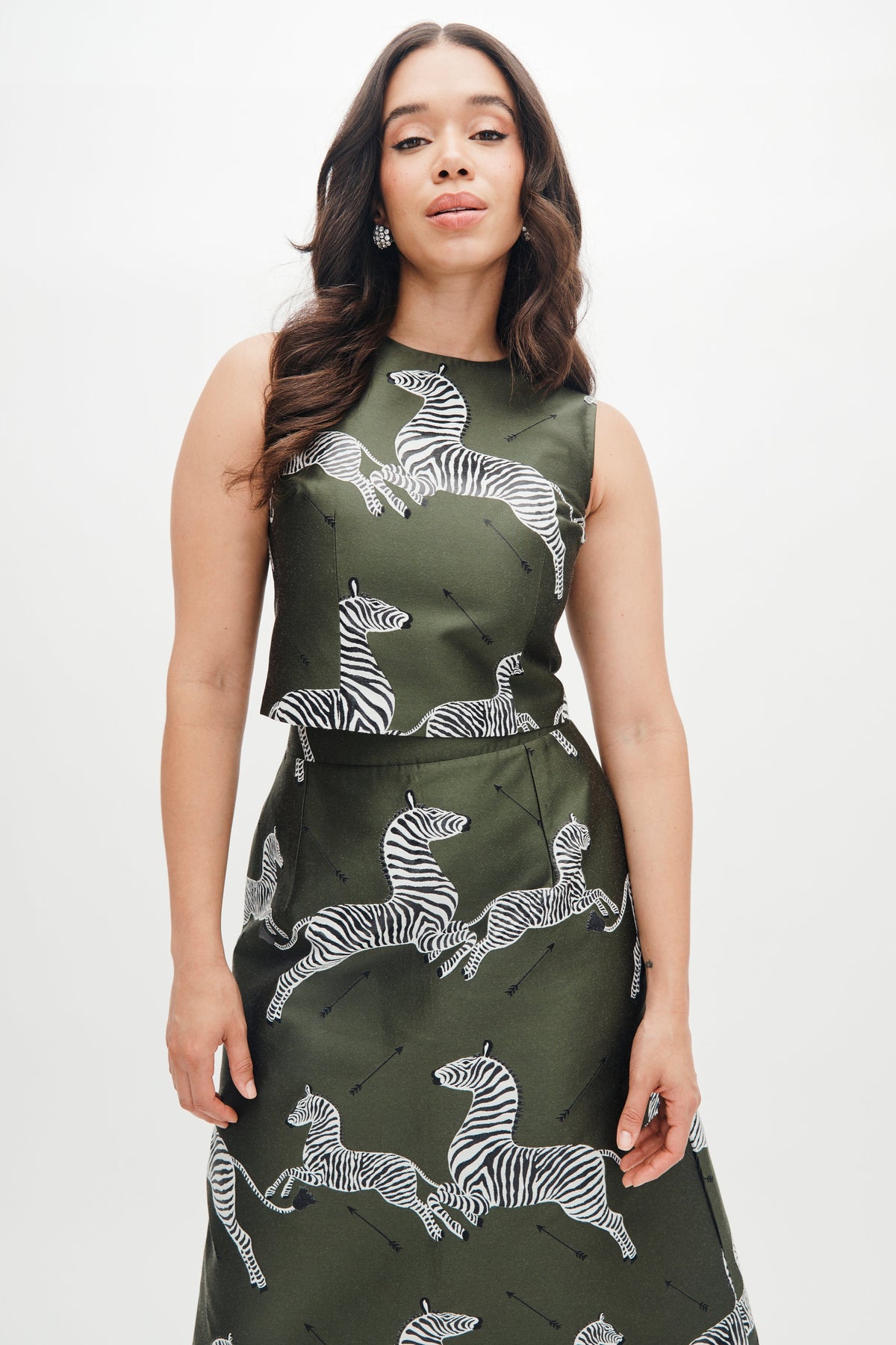 The Ali Top is a refined little shell with big impact. Cut in the exclusive MAE x Scalamandré Olive Zebra jacquard, she’s equal parts bold and elegant—perfect for pairing with the matching Hallie Skirt as a modern cocktail set, or dressed down with denim for a more playful take.