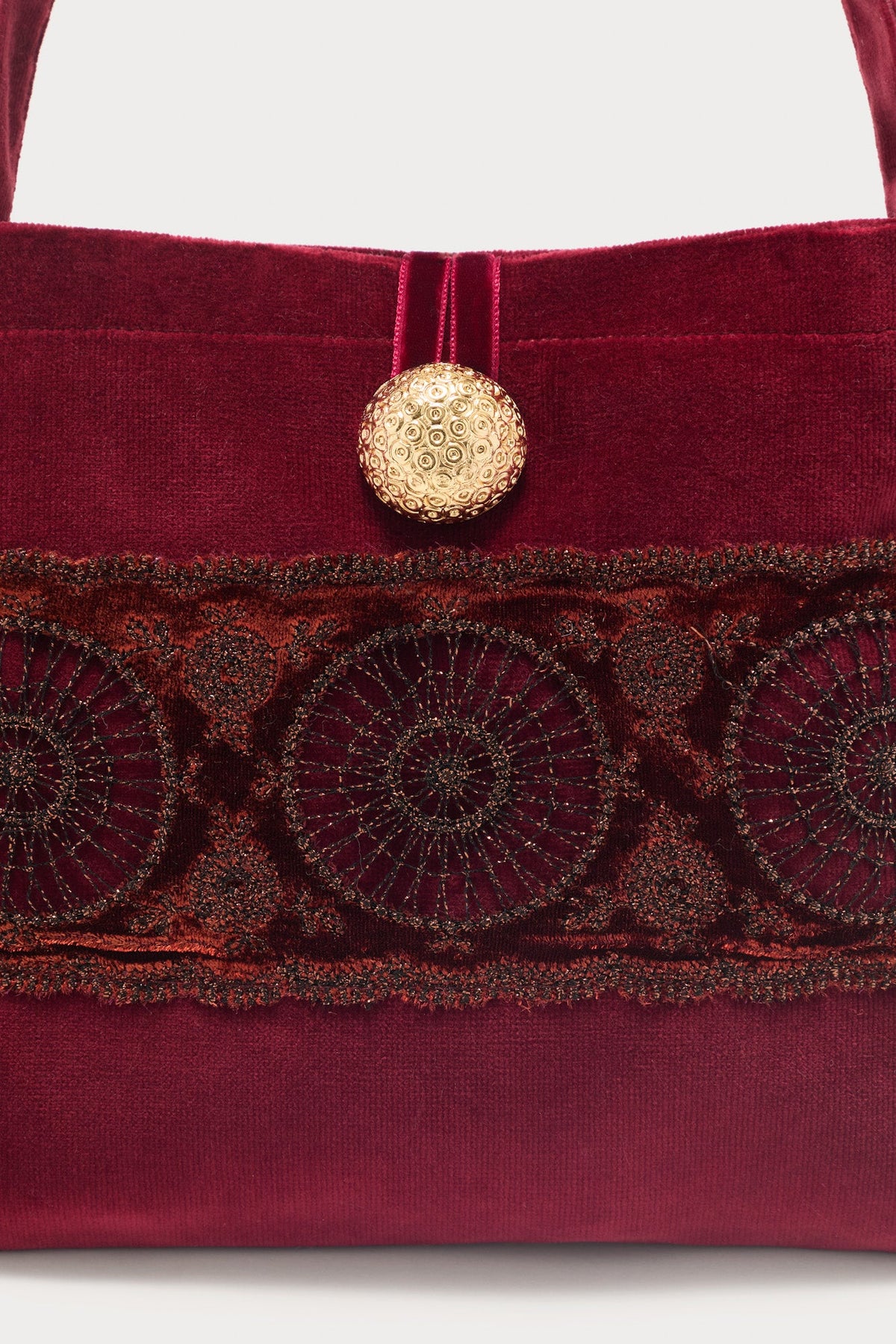 Elegant burgundy velvet bag featuring intricate golden embroidery and a sculptural silhouette. Crafted from a refined blend of cotton and polyamide, it combines softness and structure. The decorative button closure adds a touch of sophistication, making it the perfect evening companion to elevate any outfit.
