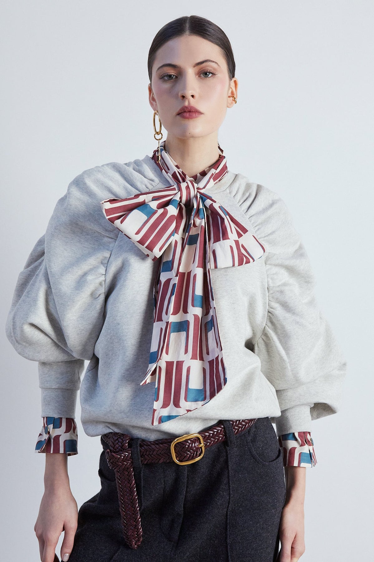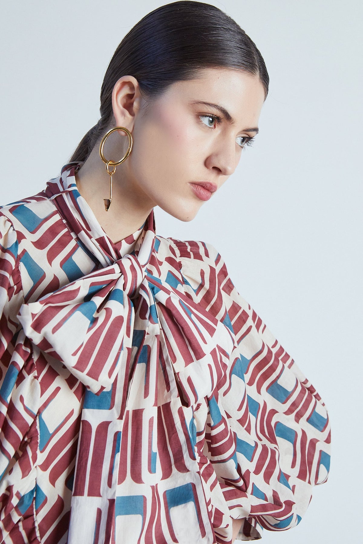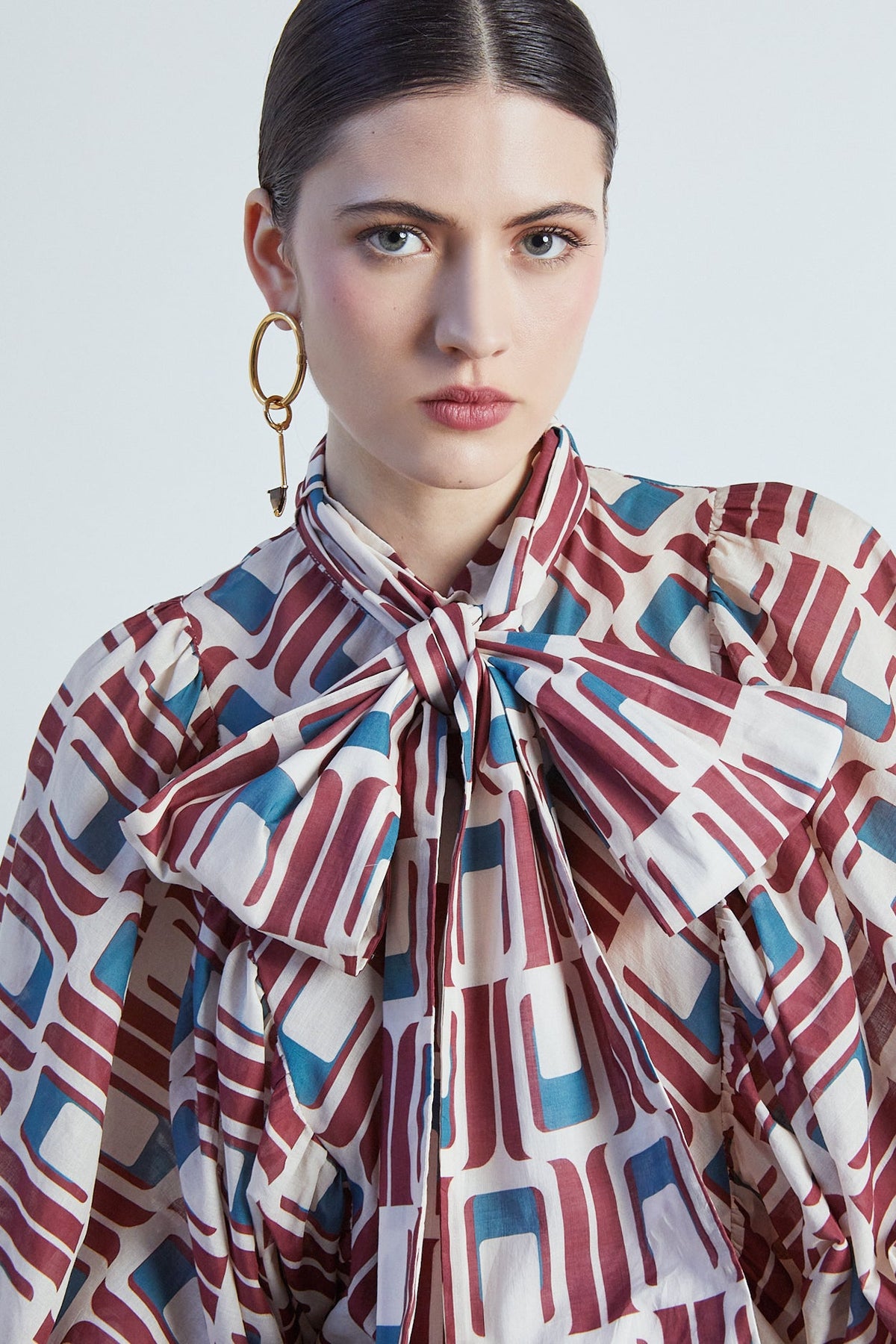 The must-have statement piece for your wardrobe. This version features long puffy sleeves and detailed metallic buttons. You can wear it with or without the bow to achieve either a polished or relaxed fit, made from fabric printed in France with a geometric motif.