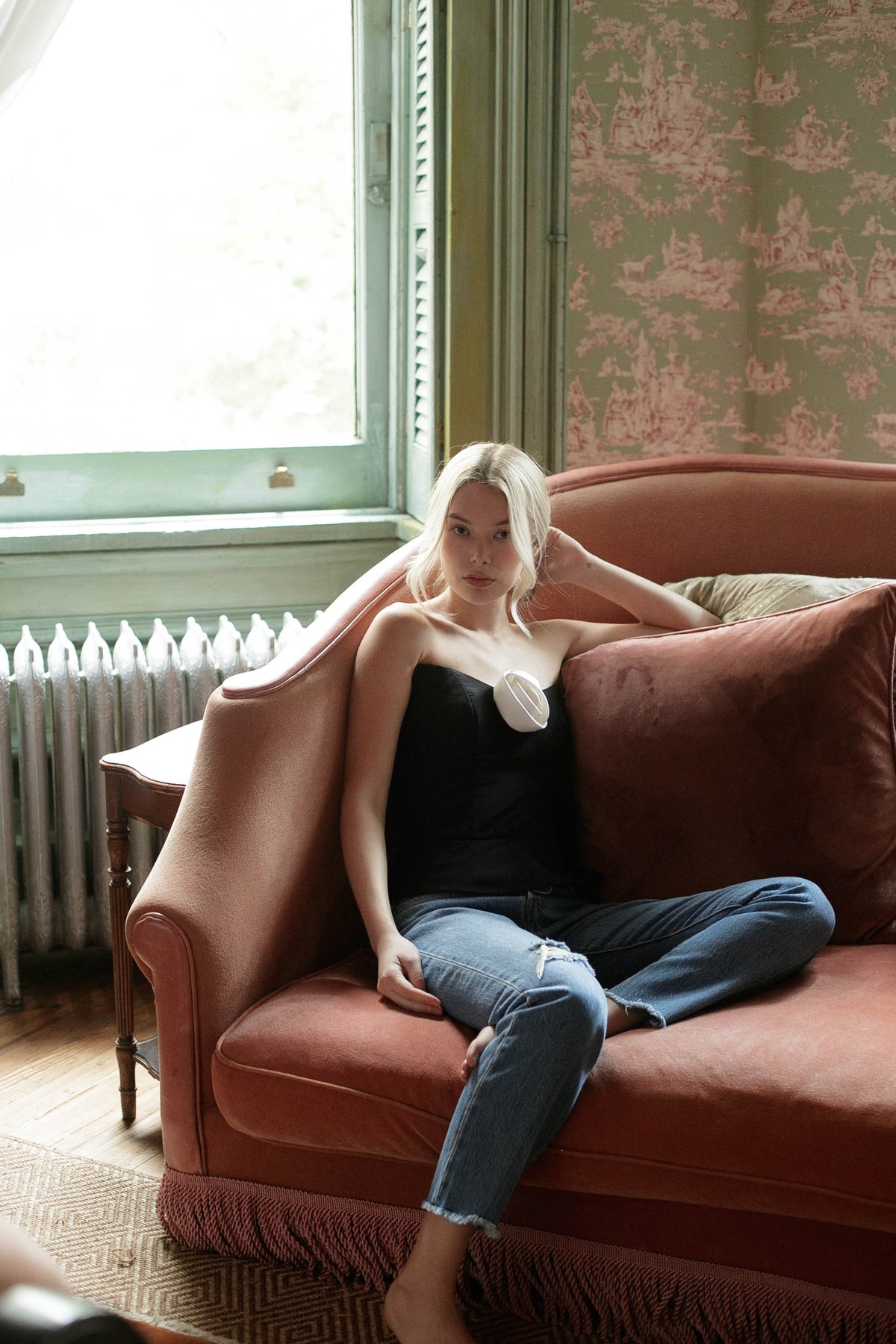 Romantic and sculptural all at once, the Delicias Corset Top reimagines classic femininity through a modern lens. Crafted in a structured black silk faille, the silhouette gently contours the body with a soft sweetheart neckline and subtle peplum hem. At the heart, a hand-formed ivory rosette is a delicate nod to old-world glamour.