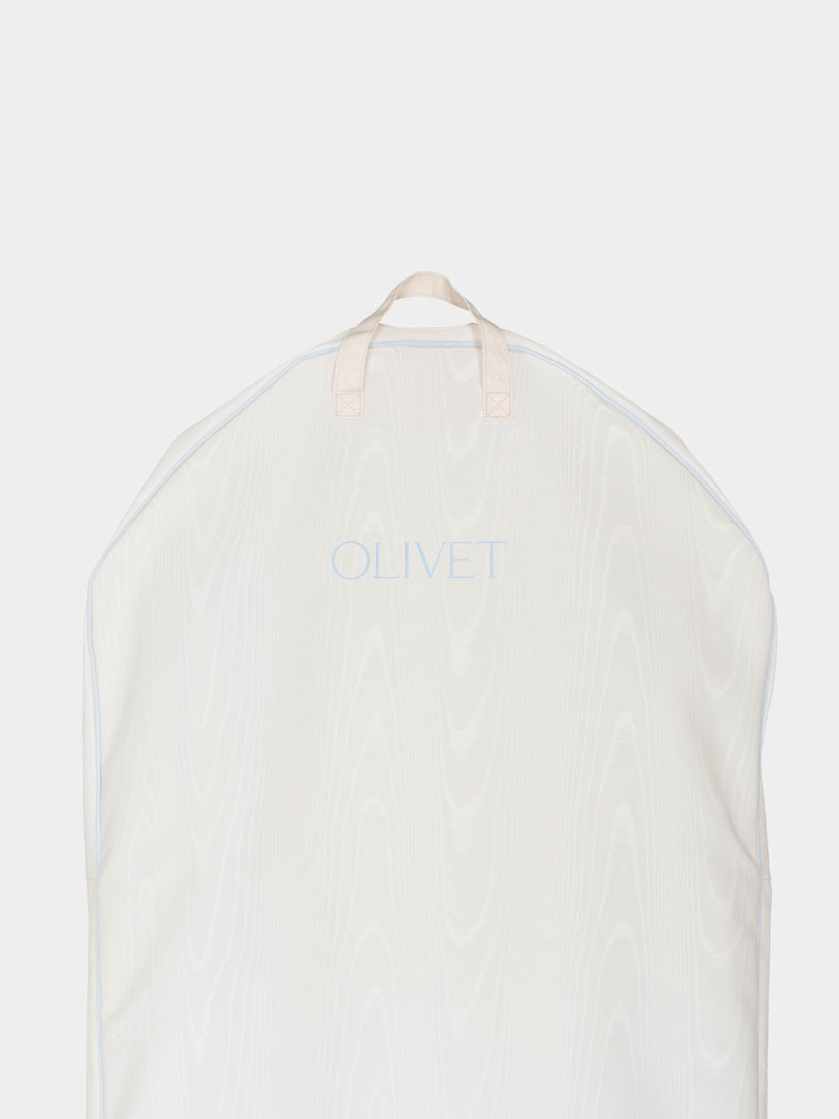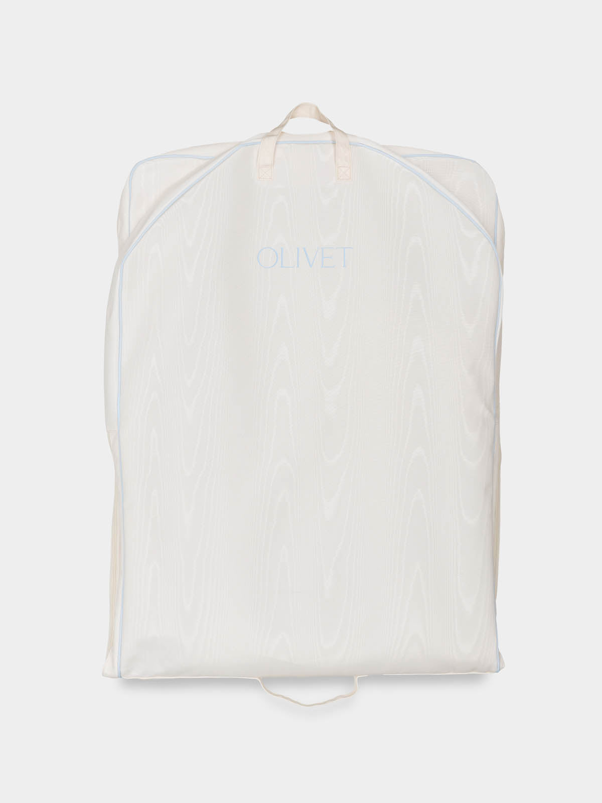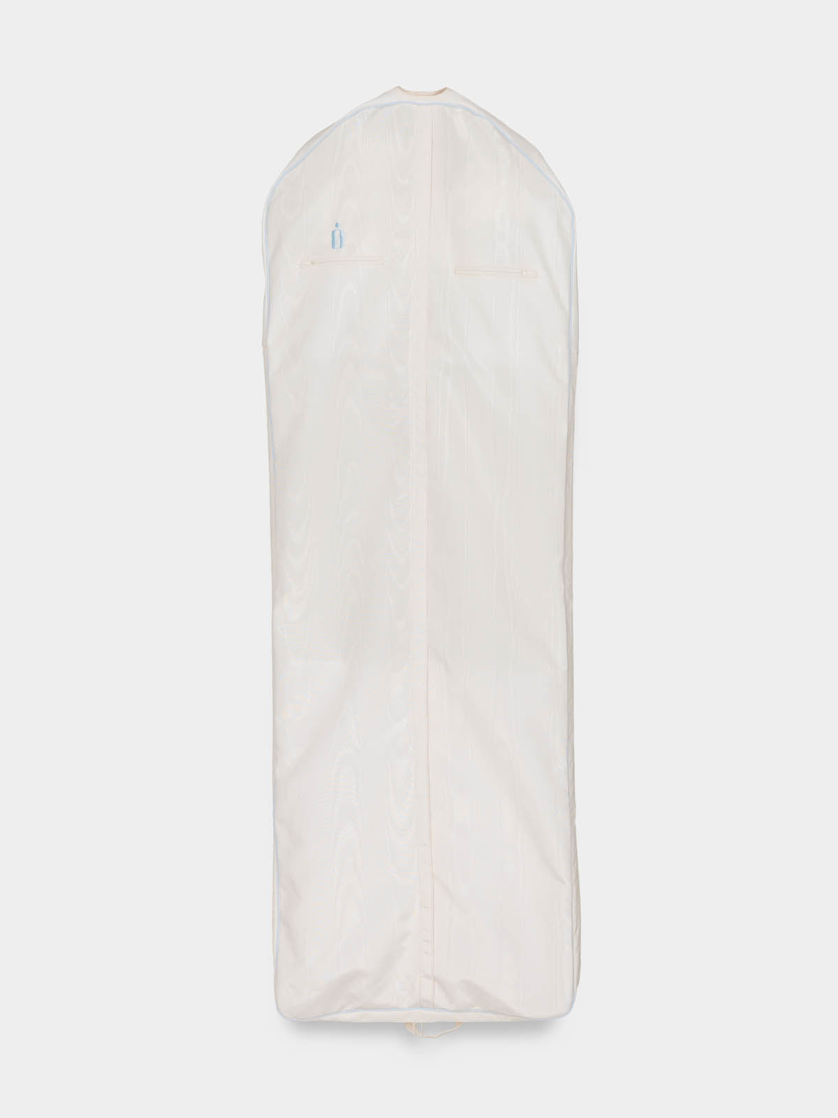 The bridal garment bag you've been dreaming of—designed to protect, transport, and beautifully complement your most important dress. Crafted in luminous ivory poly moiré with a delicate touch of bridal blue piping, The Bridal Bag ensures your gown arrives in perfect condition. The sleek silhouette is perfect for fitted gowns, while an expanding gusset accommodates voluminous skirts with ease. Thoughtfully designed with carry handles for effortless travel and the option for custom embroidery to add a personal touch. A keepsake-worthy essential for any bride and a truly special wedding gift that will be cherished long after the big day.