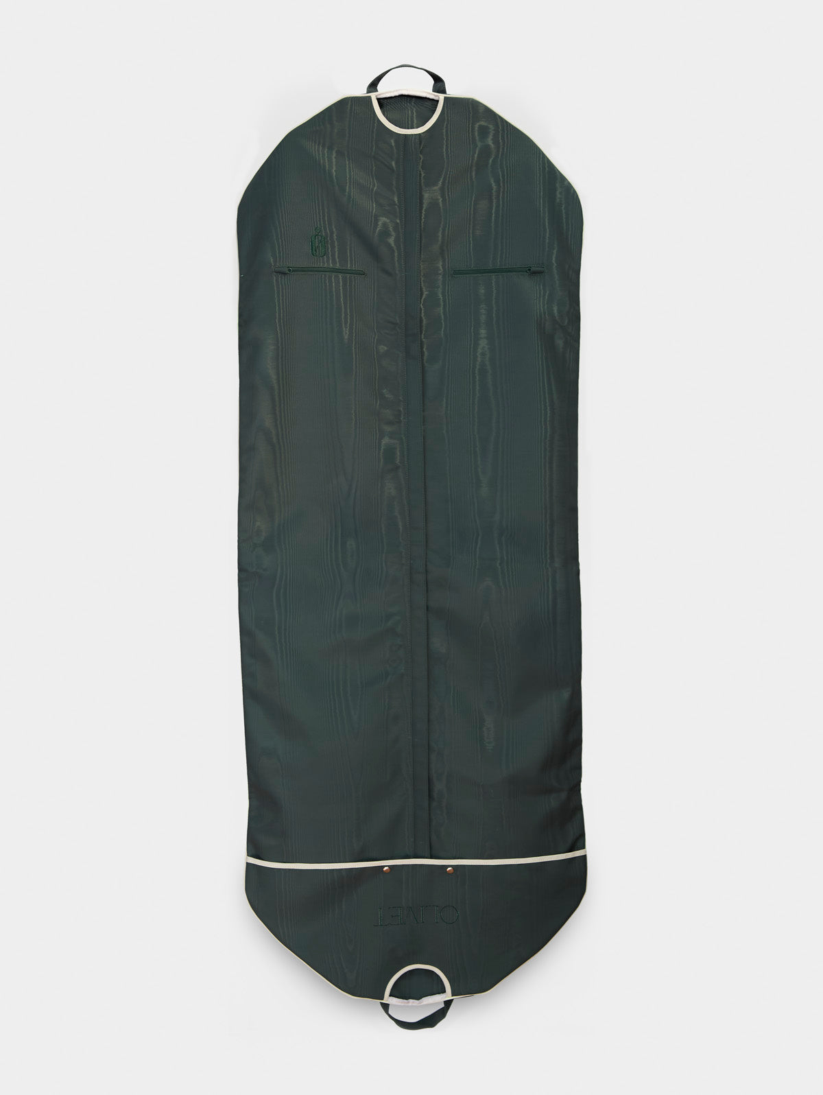 Tis the season to travel beautifully. The Olivet Classic Bag in Fir Needle brings a touch of understated glamour to your holiday escapes. A timeless silhouette reimagined in a dark green poly moiré, featuring an ivory flocked bow—a festive nod that feels both playful and refined—and deep forest piping and embroidery. Designed to go wherever the celebrations take you, it’s extra-long to accommodate formalwear and features two interior pockets for accessories and essentials. Thoughtfully crafted for effortless travel, it transitions from full-length to half-fold to compact suitcase fold, with handles at each length for easy carrying. For a finishing touch, custom embroidery is available over the right interior pocket—because even your holiday packing deserves a little luxury.