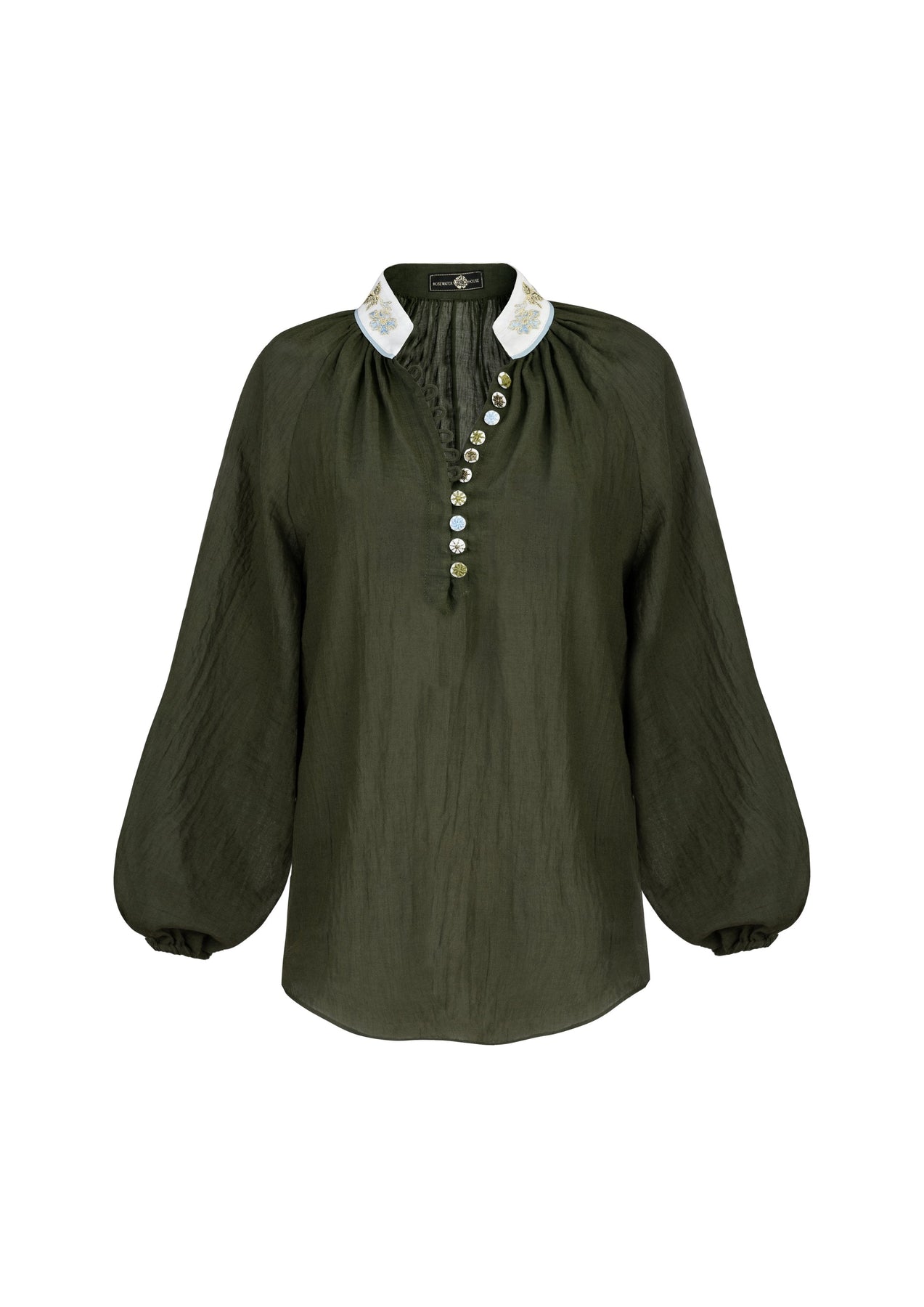 The Ivy Blouse is a two-tone piece crafted from lightweight cotton voile, showcasing delicate embroidery and a relaxed, loosely fitted silhouette. Finished with hand-embroidered buttons, it effortlessly blends airy elegance with artisanal charm—making it perfect for refined everyday wear.