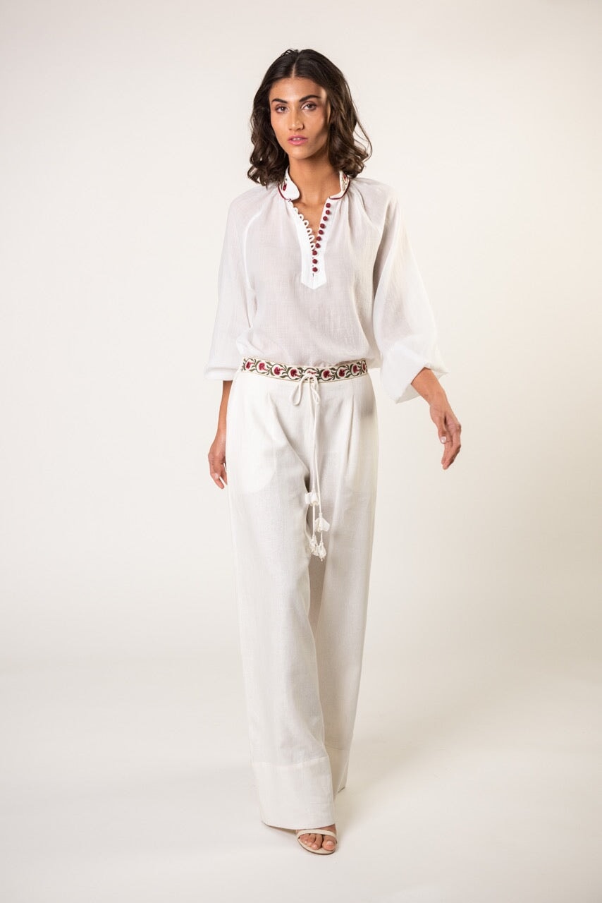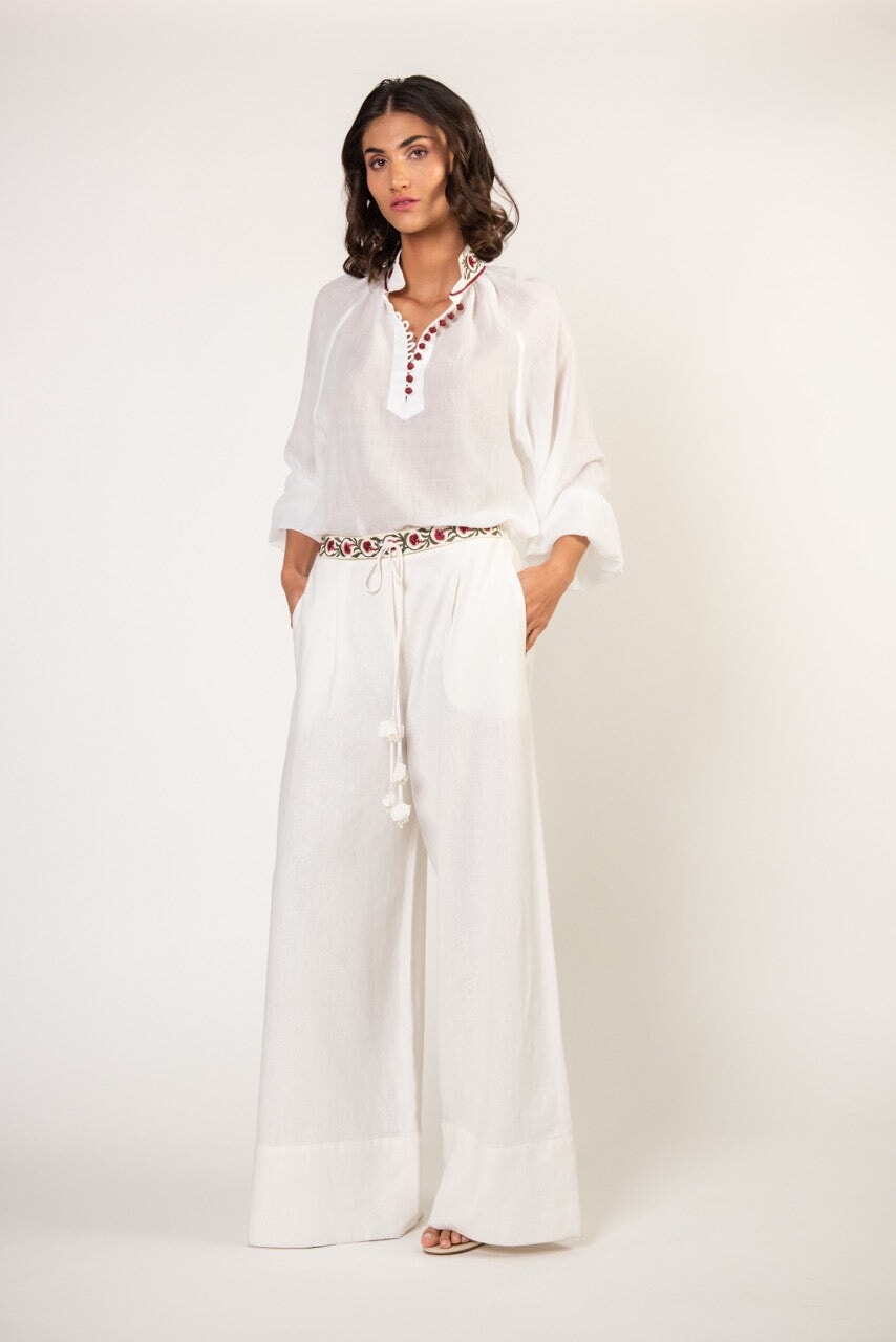 The Carnation Pants feature a high waist and wide legs for a flattering fit. The hand-embroidered petal-shaped drawstrings and embroidered waist belt provide unique detailing. These pants pair perfectly with the Golbarg Blouse for a crisp summer outfit! The Carnation Pants fuse comfort and style to be an ideal wardrobe staple.