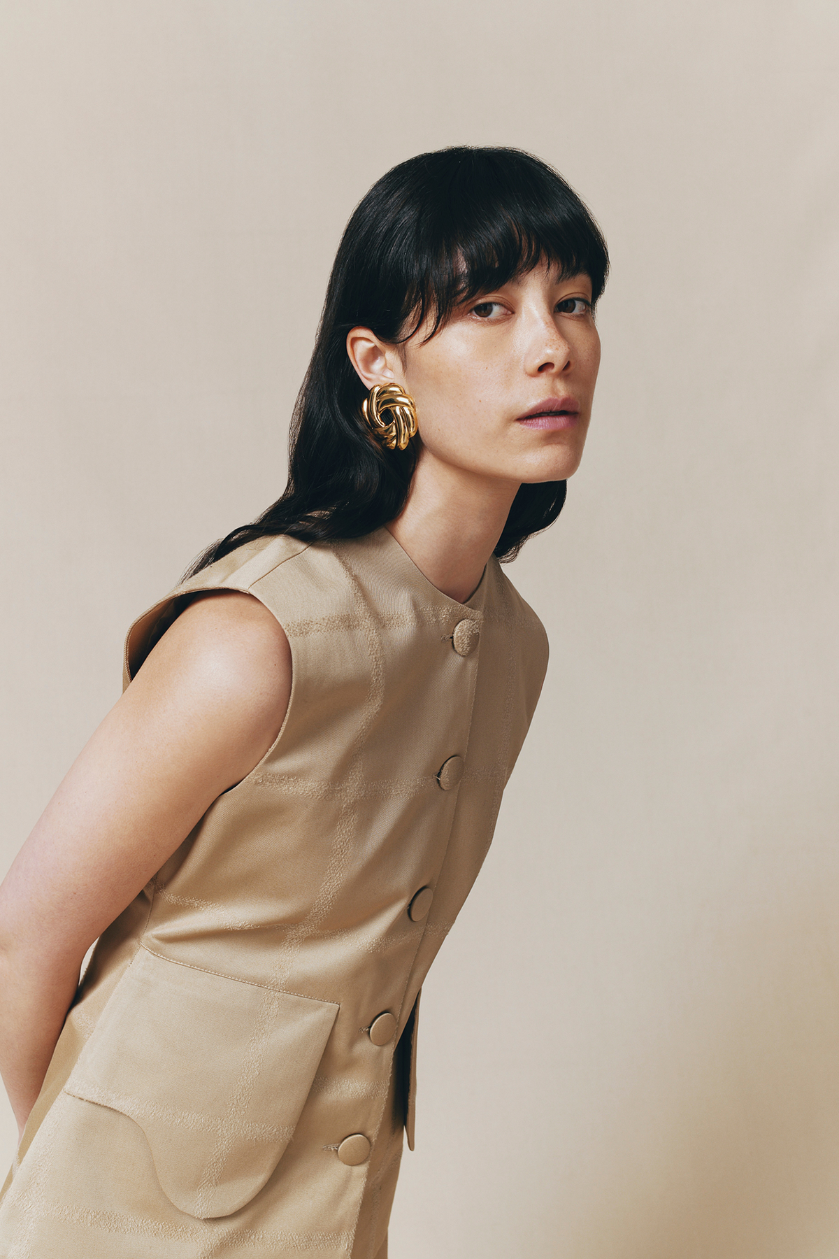 A sophisticated take on the utility vest, this piece offers a refined interpretation of workwear-inspired design. Crafted in smooth sand-colored fabric, it features a clean round neckline and a distinctive button-front closure. The curved cargo pockets add architectural interest while maintaining the vest's elevated aesthetic. Each detail is considered, from the covered buttons to the slightly elongated silhouette.
