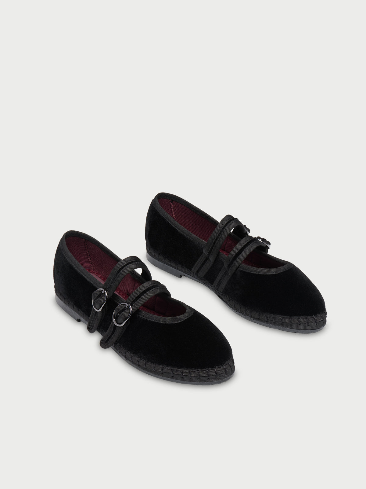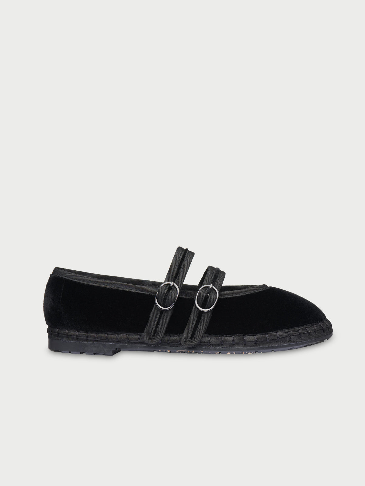 • Velvet mary jane in black with black piping and double velvet tires with buckle as closure.