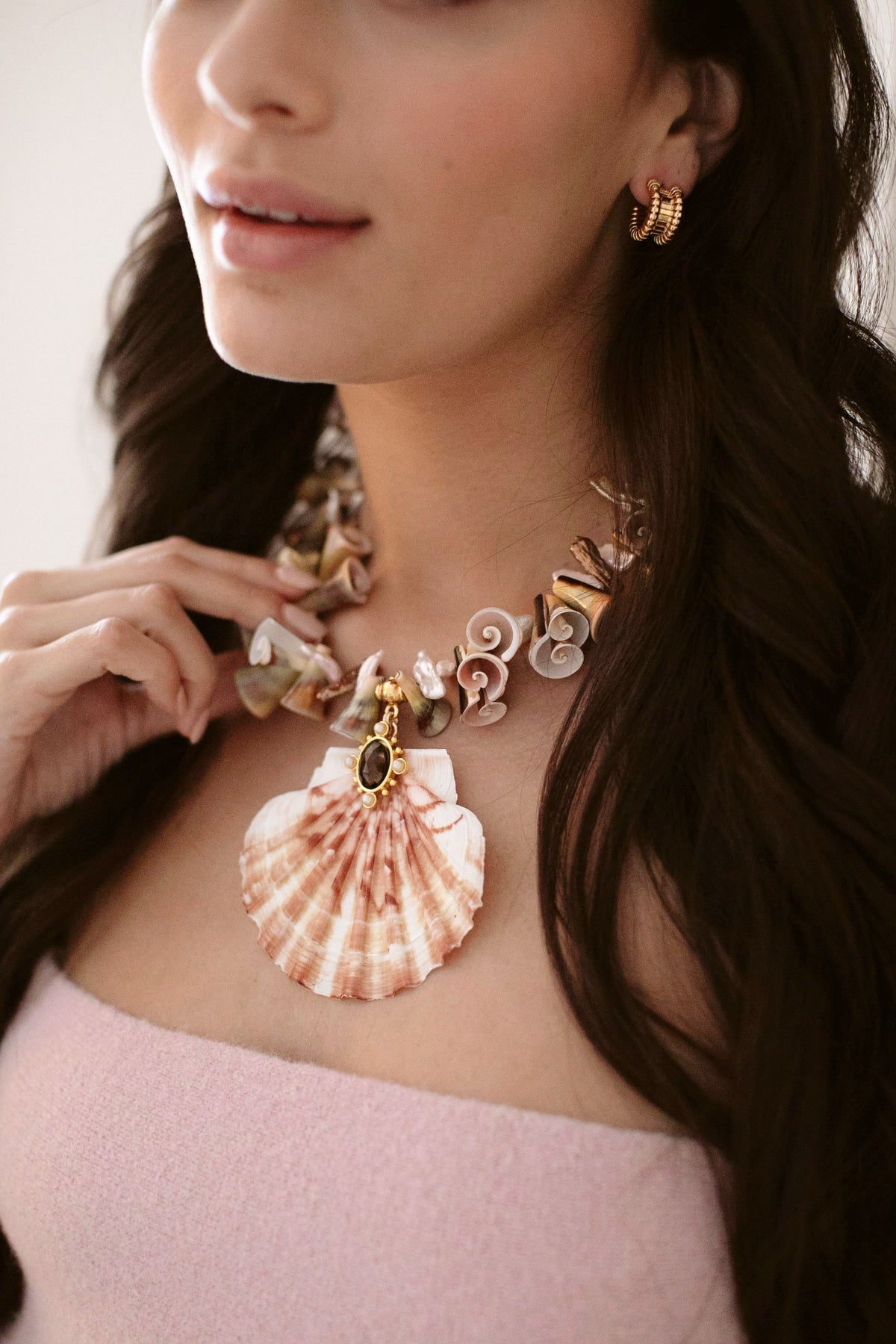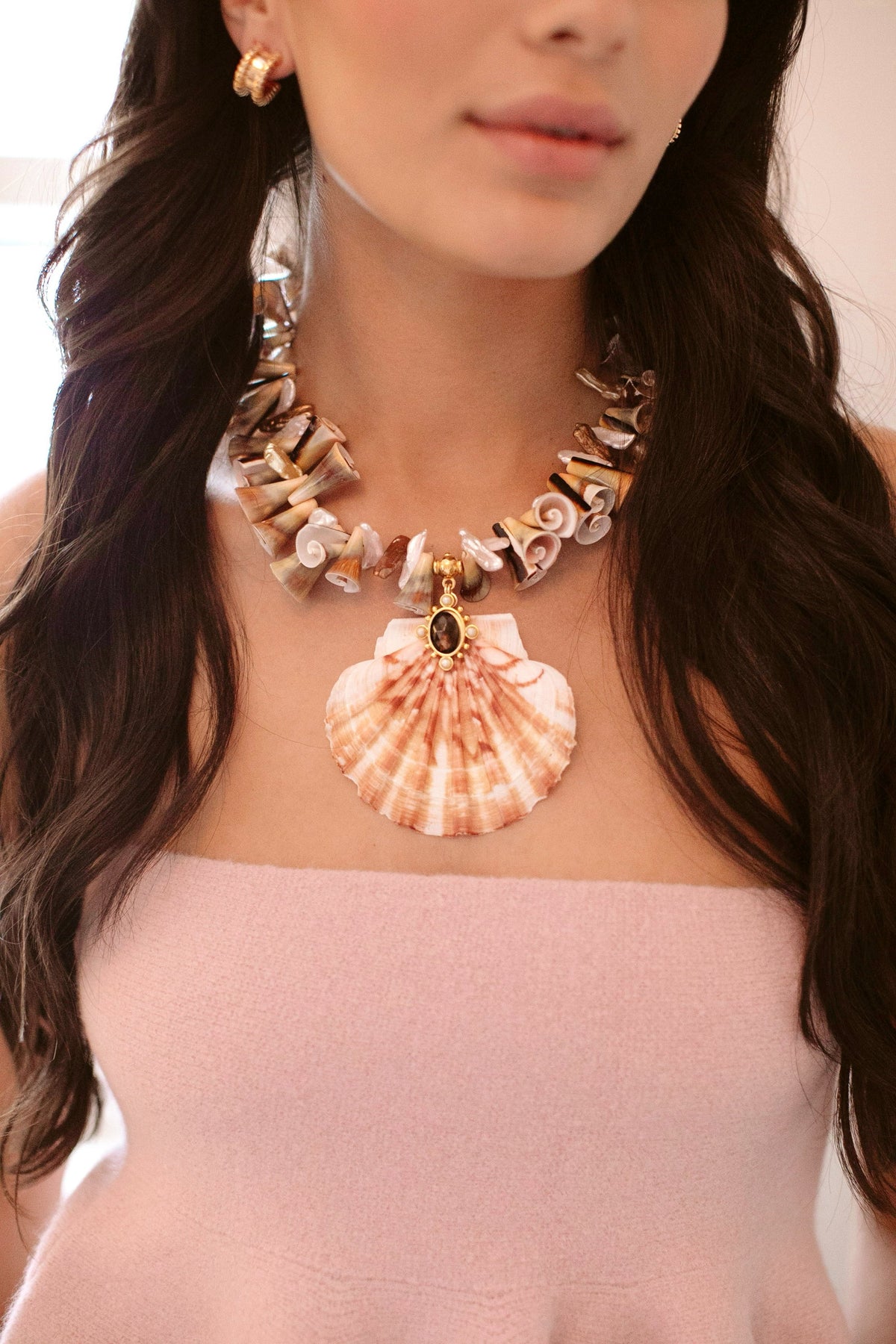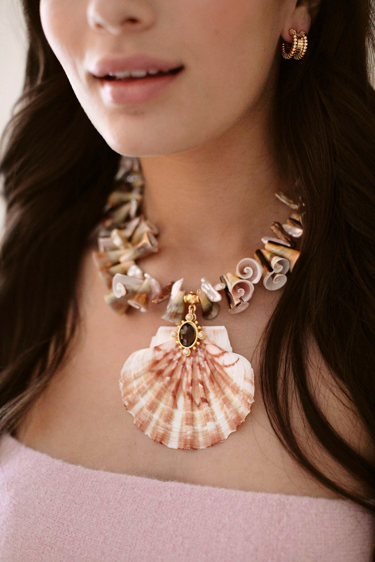 - A strand of irregular cut Trumpet Luhuanus Shells and freshwater pearls adorned with a flat Irish scallop shell featuring smoky quartz freshwater pearl detailing