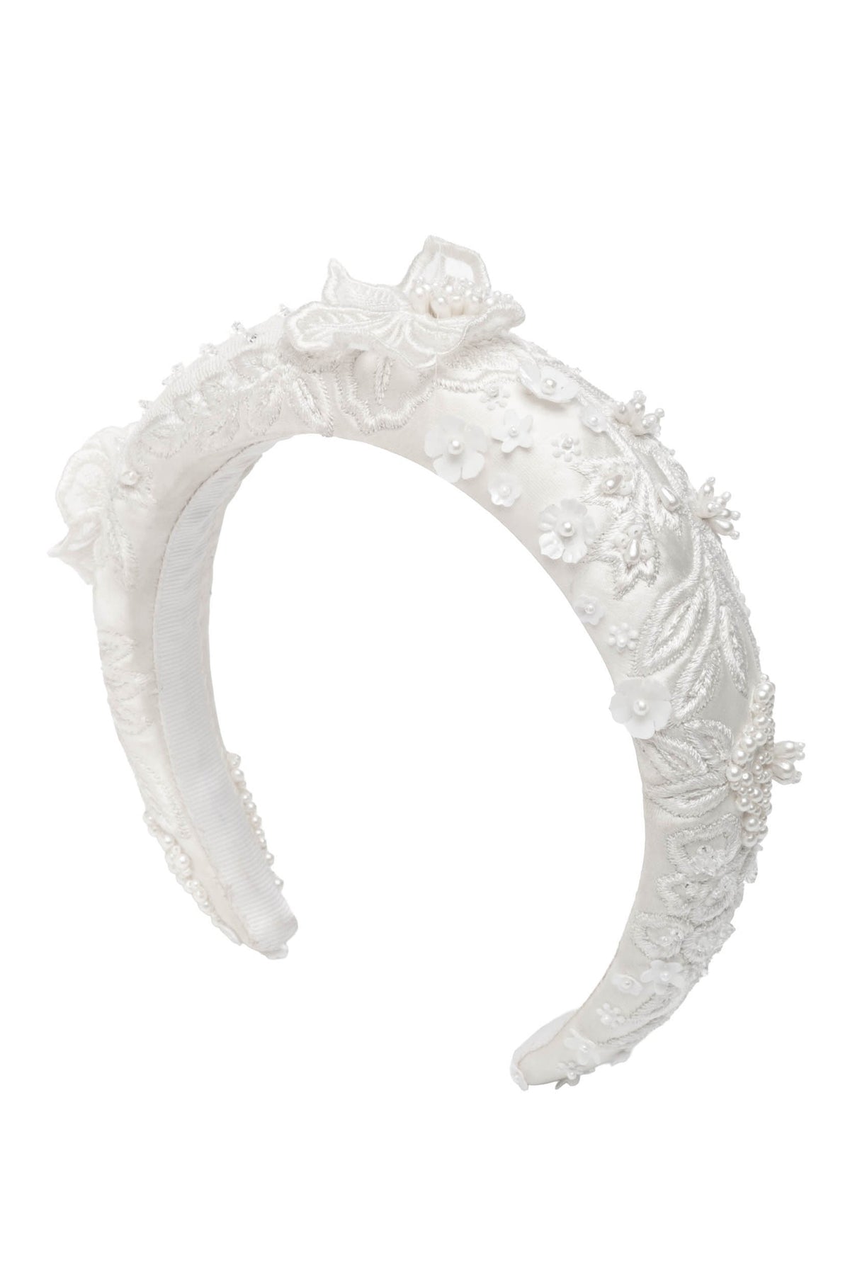 The Emma Headband in Ivory Silk Wool with 3D Lace Embellishment is the perfect accessory for the bride who is looking to incorporate a touch of elegant prep into her look. This padded headband features intricate 3D embroidery that pairs back to our Piper Bucket Bag and Alexandra Gown.