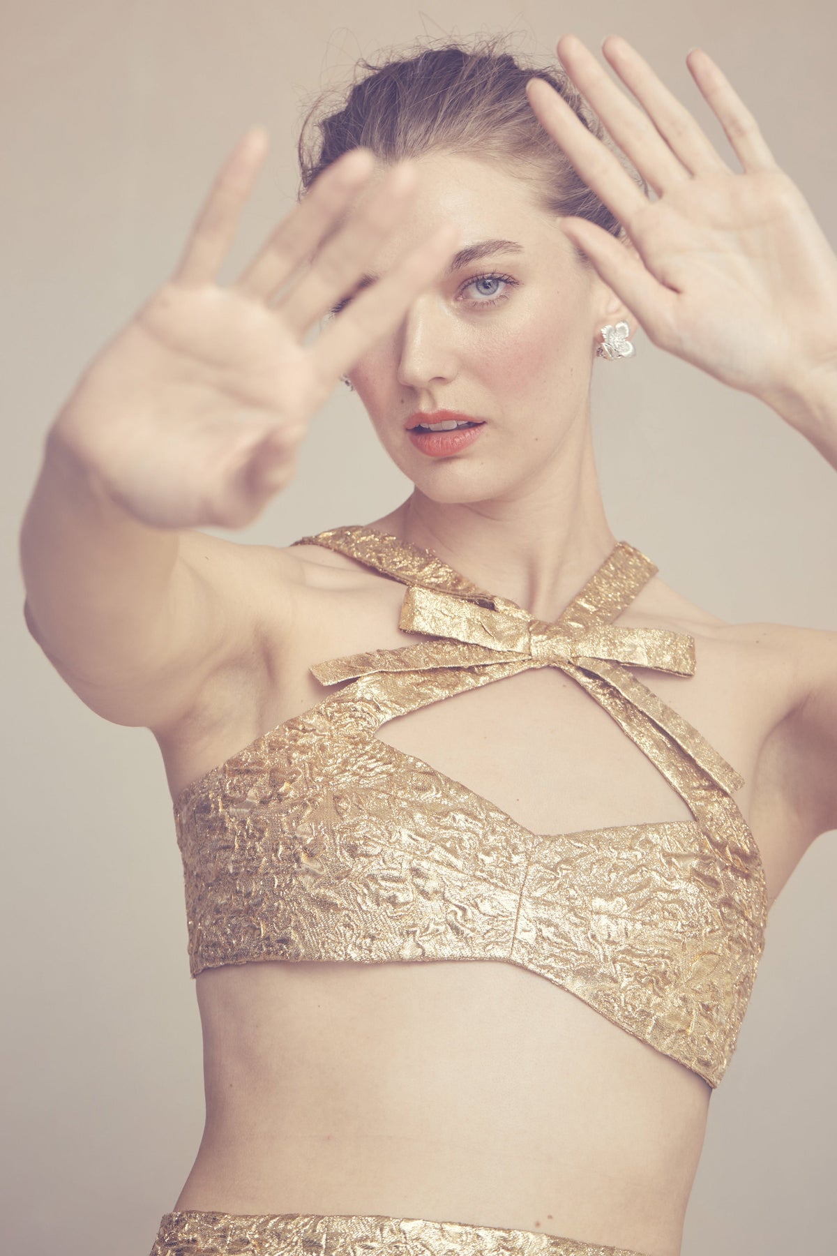 Crafted in our luxurious, metallic gold brocade, our Olivia Bow Top is the perfect piece to create a bold, feminine ensemble. Featuring our signature, bow neckline, this top adds a touch of elegance to any wardrobe. This top can be paired with the Effie Pencil Skirt. Features an exposed side zipper.