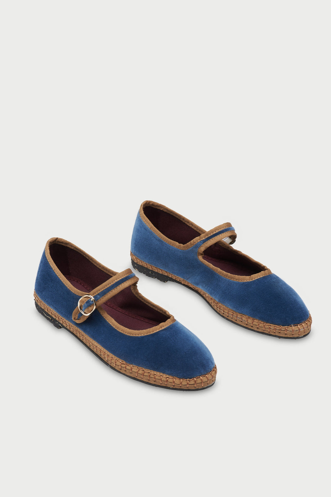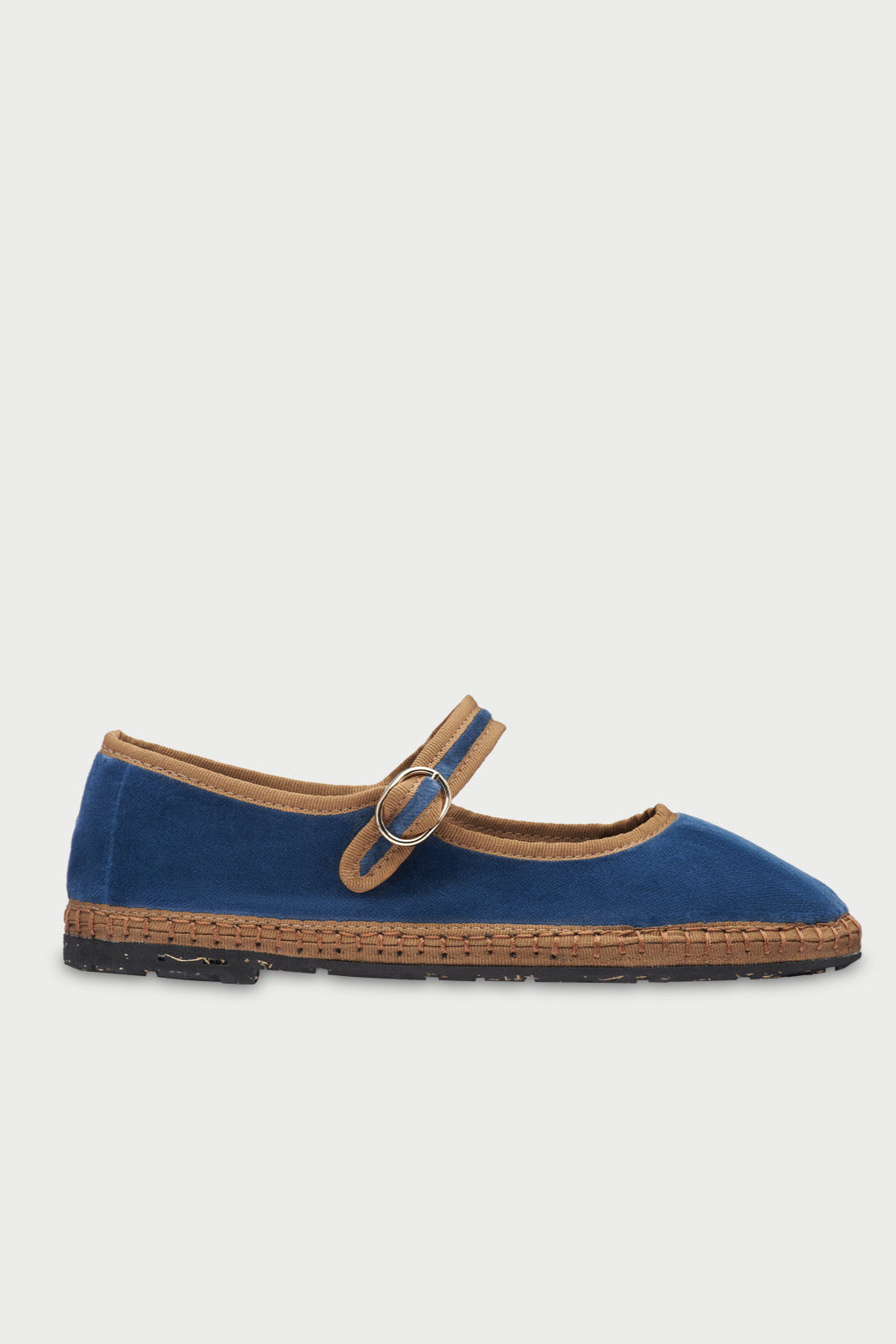 Velvet mary jane in dark blue with yellow piping and buckle closure. The outside of the shoe is 100% cotton velvet, and the inside of the shoe is 100% ecological cotton with anti-bacterial treatment. The sole is made of rubber produced from recycled bicycle tyres.