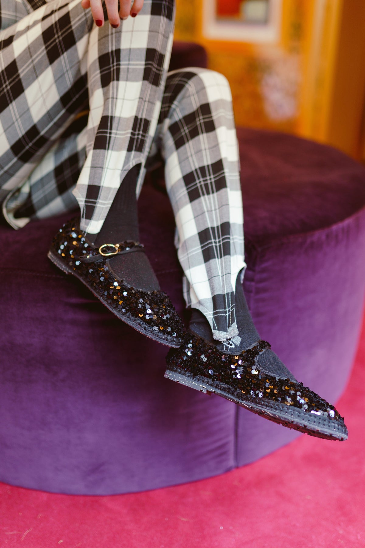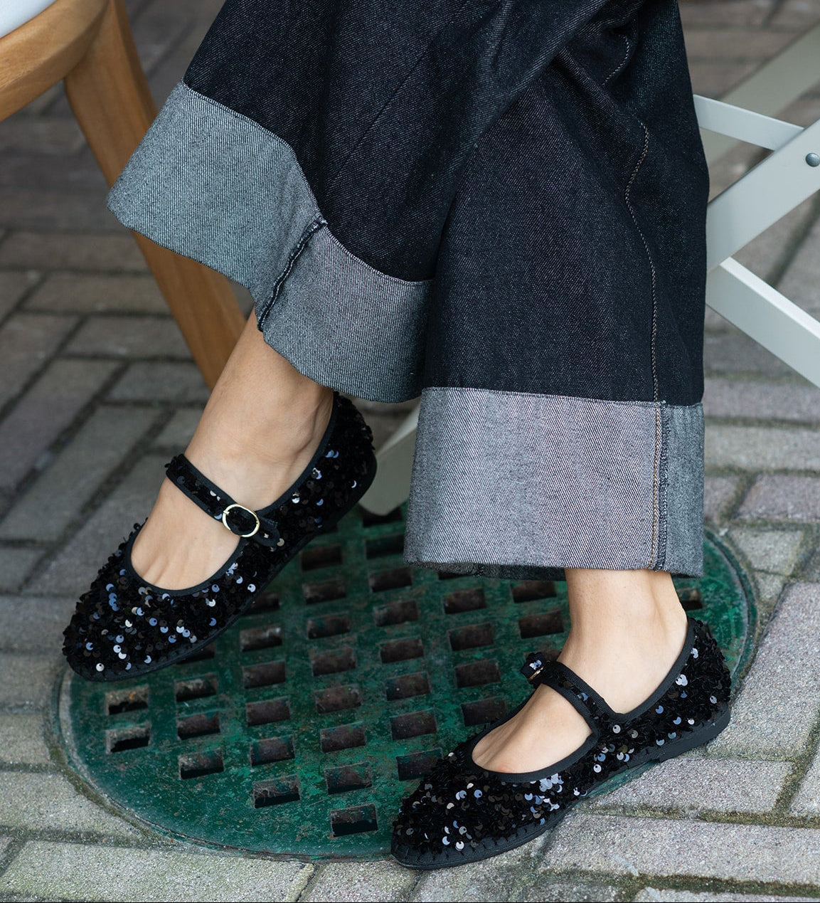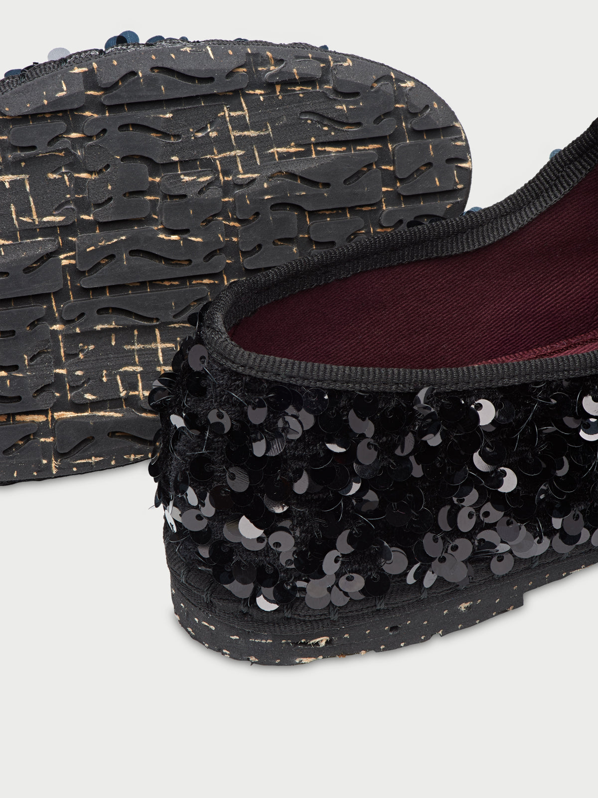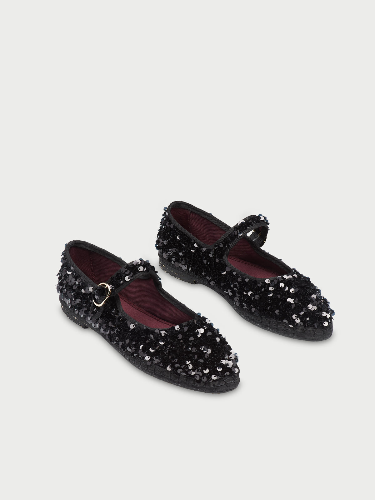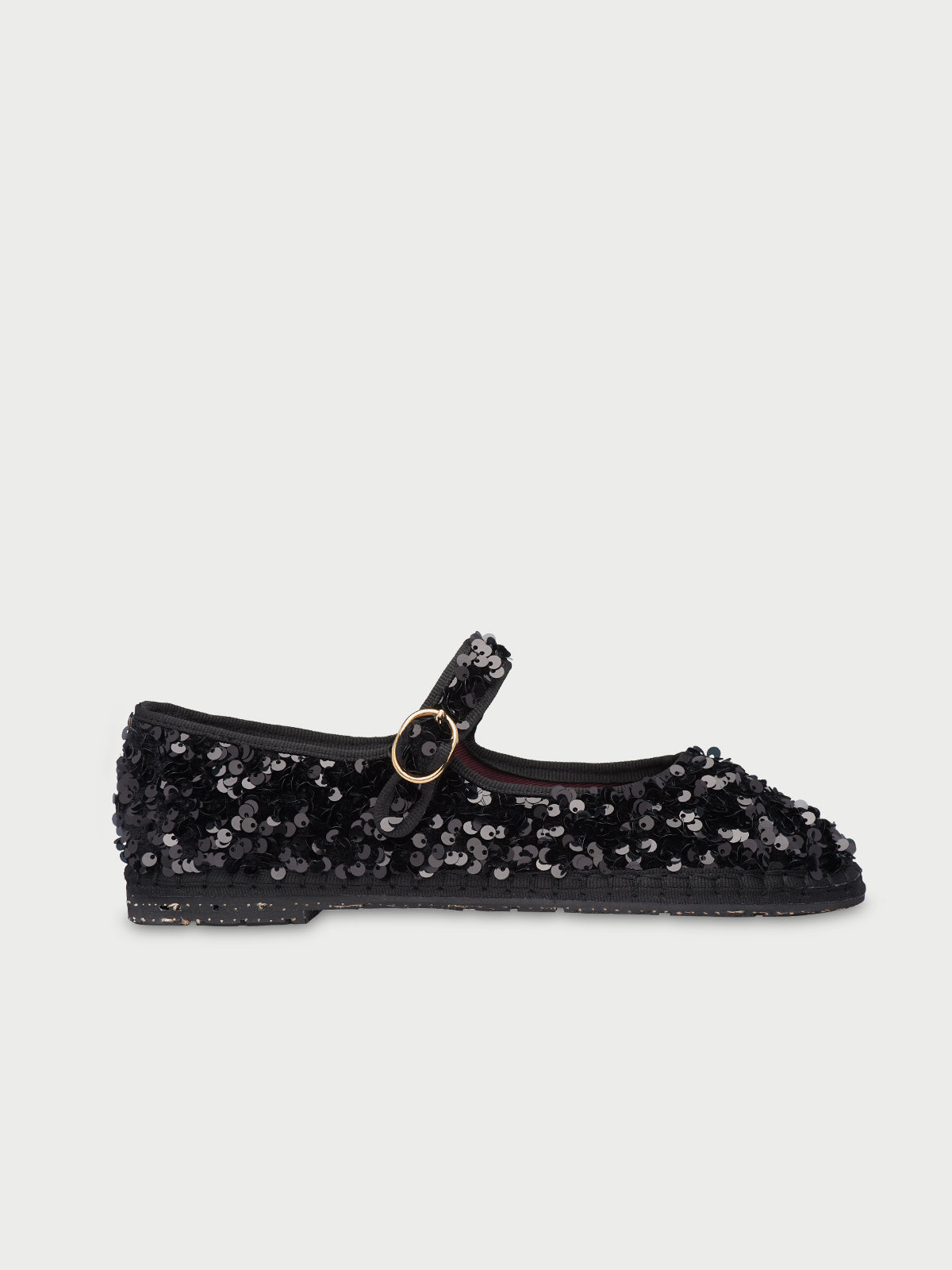 Black sequinned mary jane with black piping and buckle closure. The inside of the shoe is 100% ecological cotton with anti-bacterial treatment. The sole is made of rubber produced from recycled bicycle tyres.