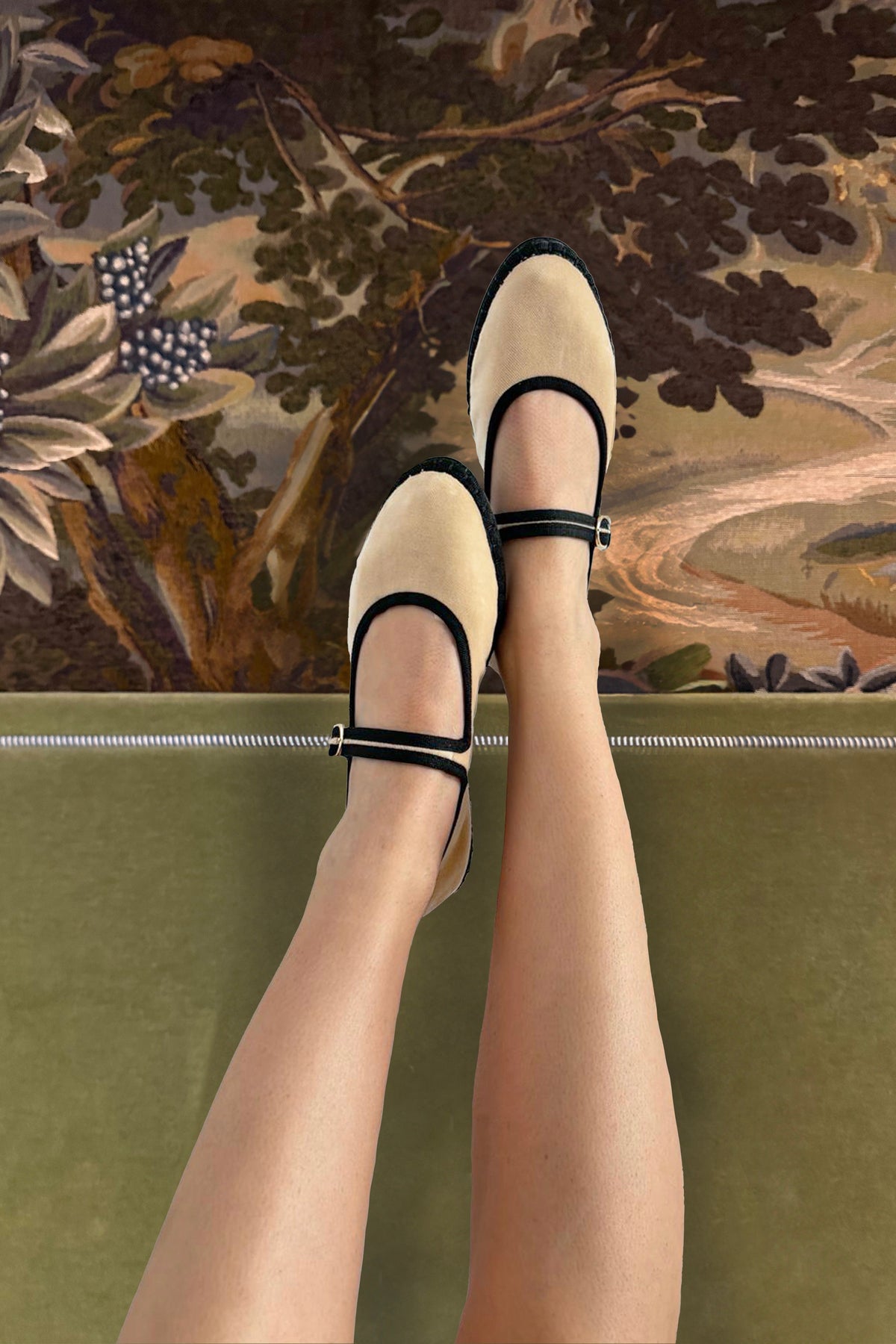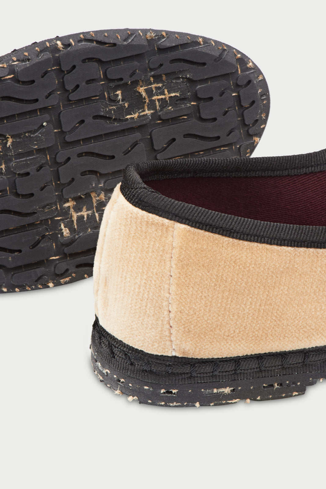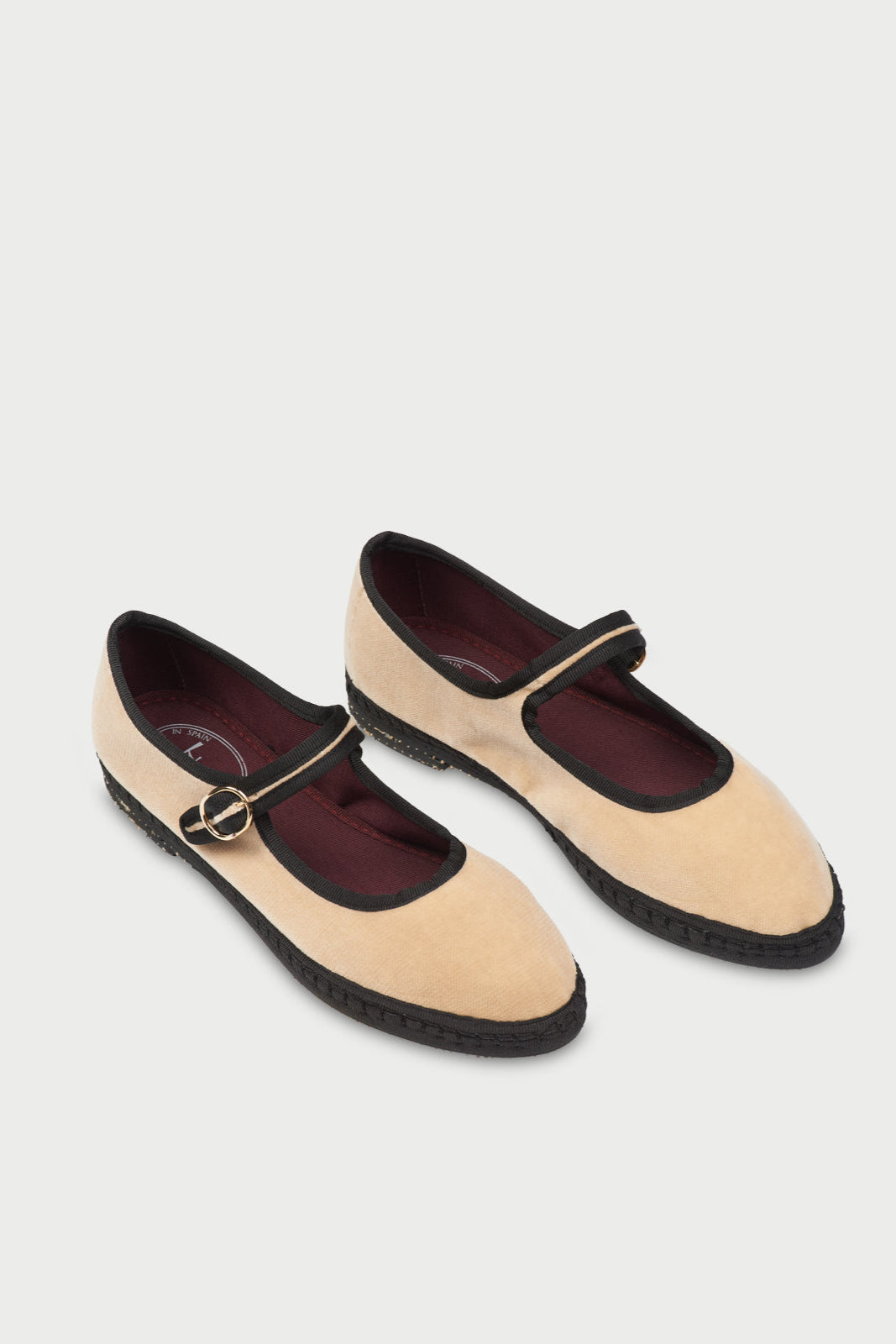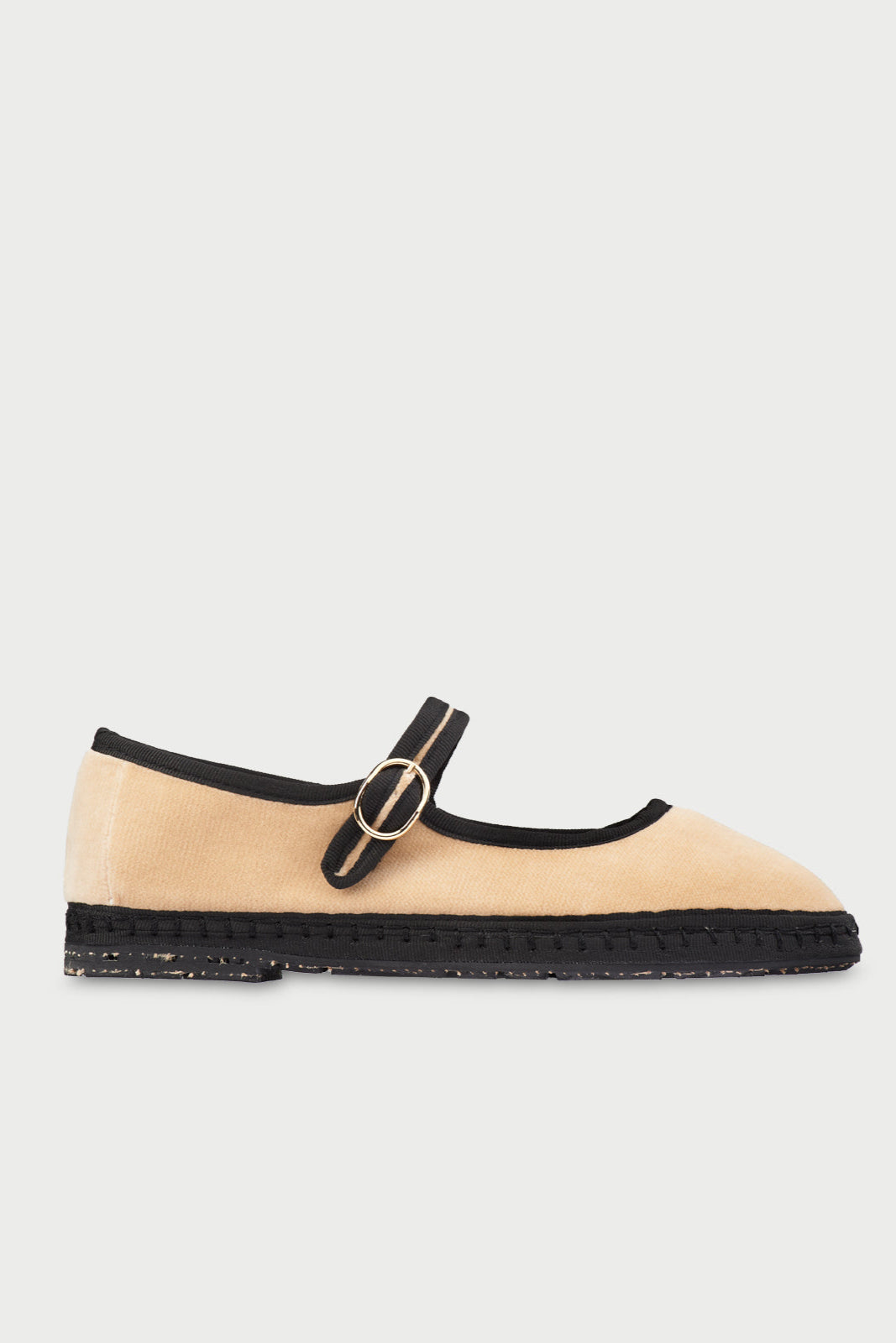 Velvet mary jane in cream with black piping and buckle closure. The outside of the shoe is 100% cotton velvet, and the inside of the shoe is 100% ecological cotton with anti-bacterial treatment. The sole is made of rubber produced from recycled bicycle tyres.